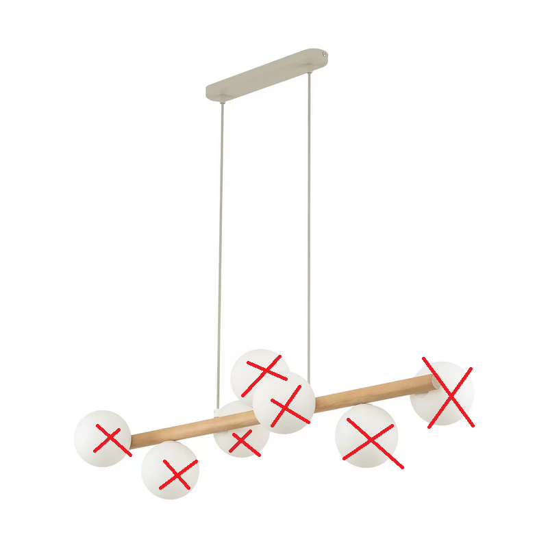 Estera hengiljós í B-flokki, ópalgler, viður, sjö ljósa loftlampi. Sjá texta/mynd.