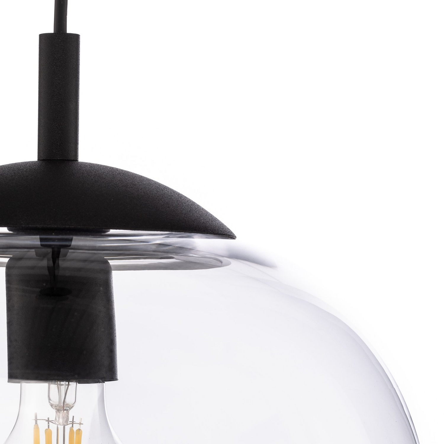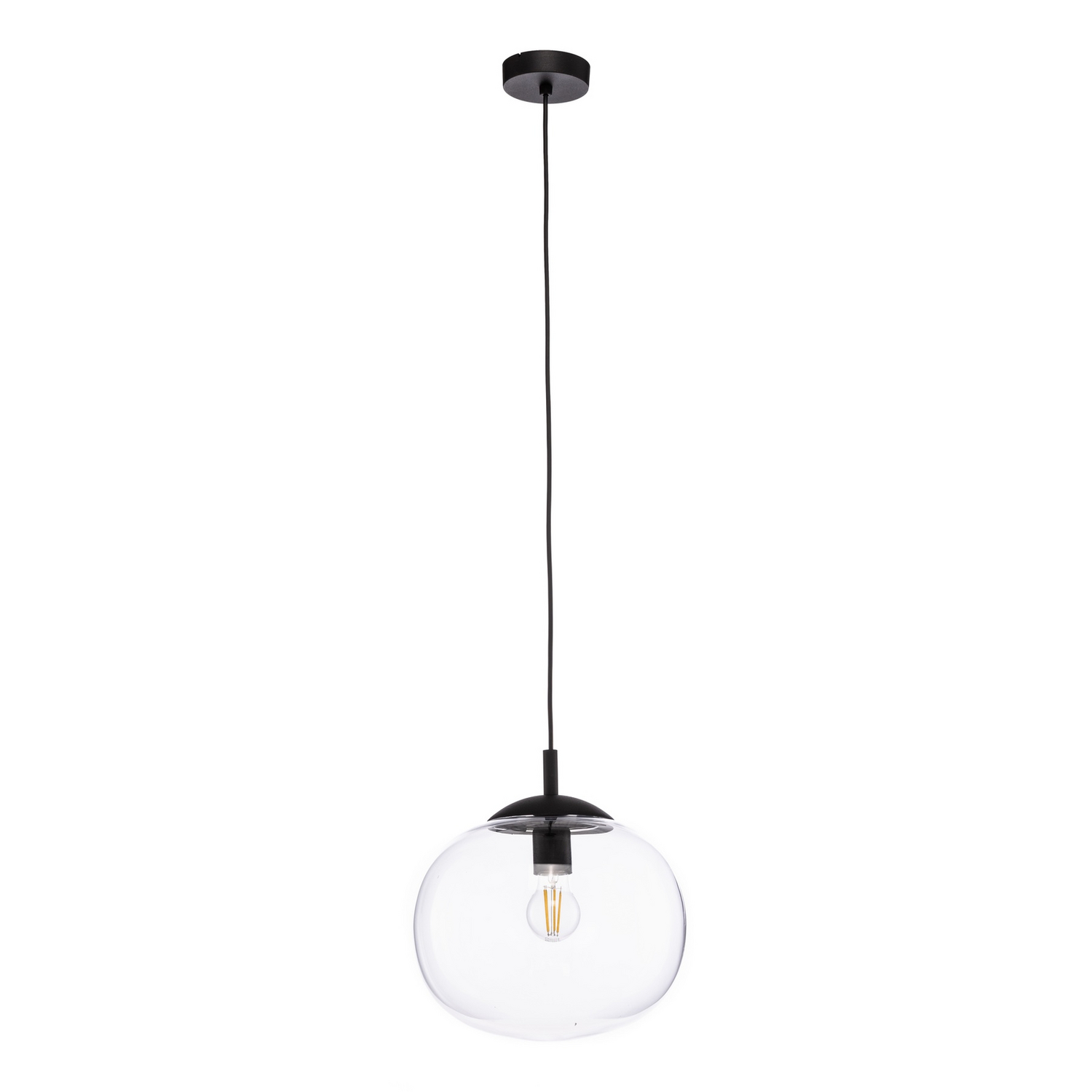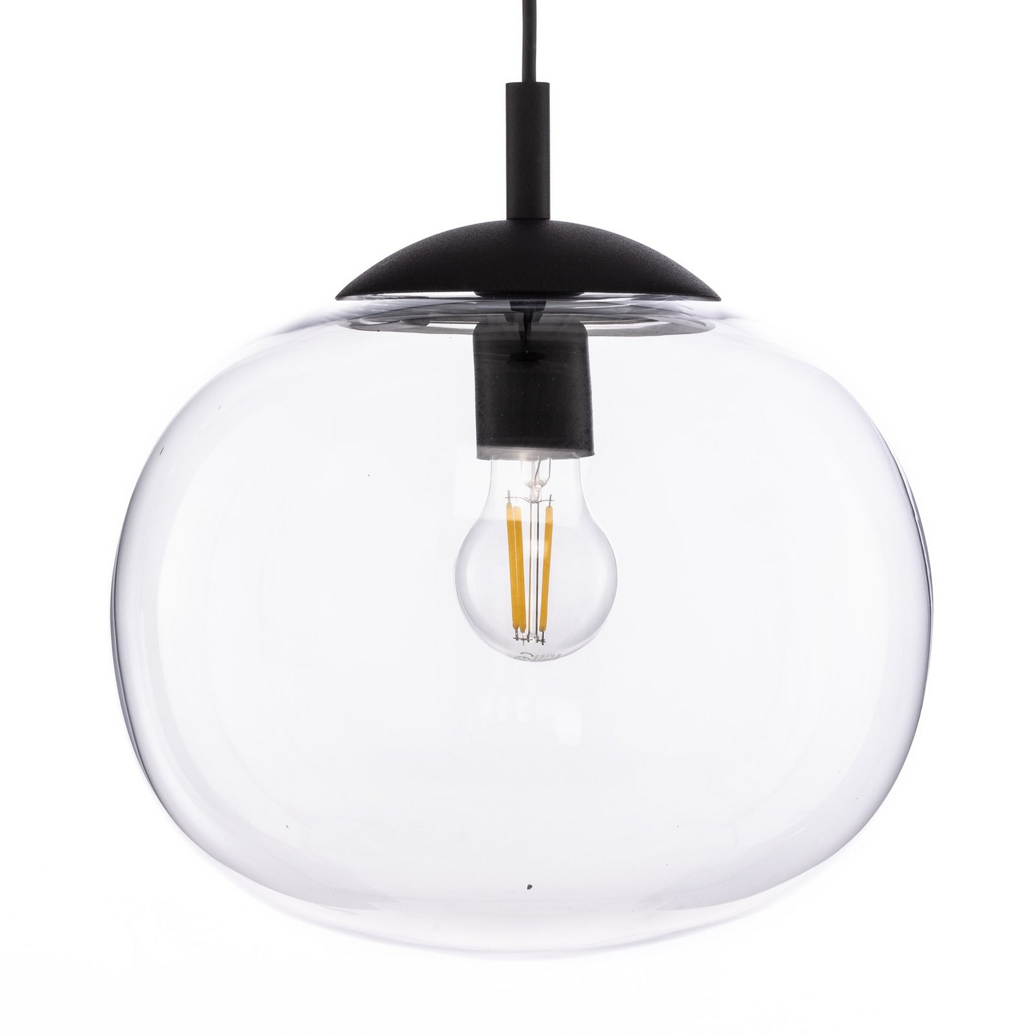 Vibe glerhengiljós með kringlóttum skjá með glærri áferð. Vibe hengiljósið er sérstaklega aðlaðandi í nútímalegum innanhússhönnunarhugmyndum. Það sameinar svarta þætti með næstum kúlulaga glerskjá. Glæra efnið gerir kleift að sjá inn og sýnir fullkomlega fram á skrautlega E27 peru.