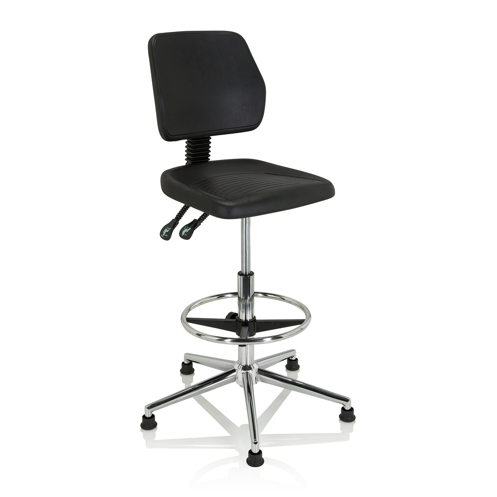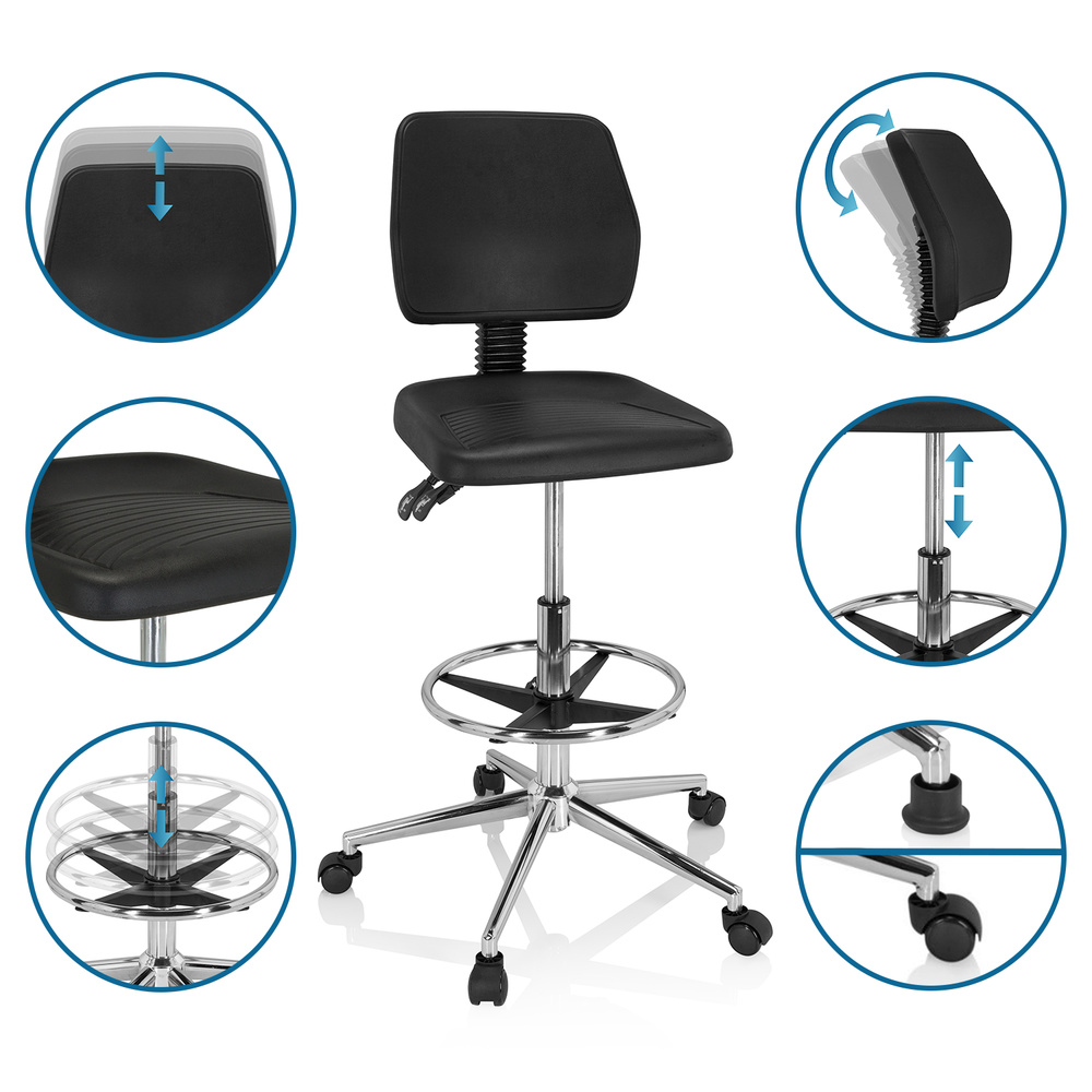 - Bakstoð stillanleg í hæð og halla, auk þess með vinnuvistfræðilega mótuðu pólýúretan bólstrun