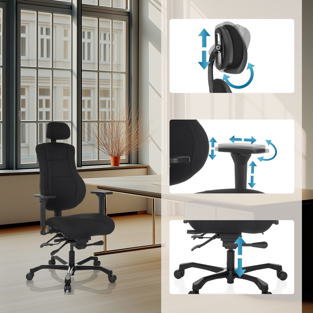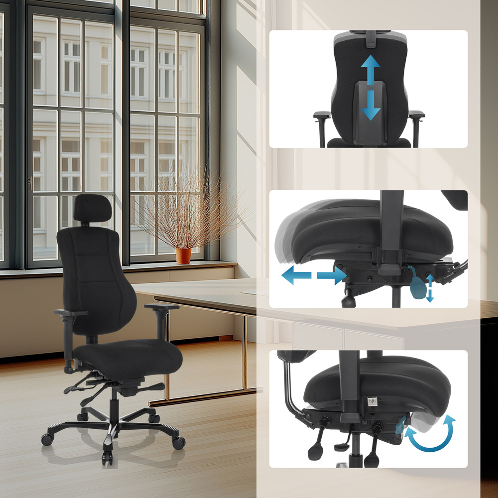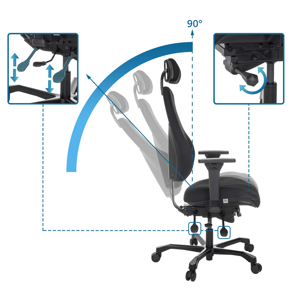 - Hagnýt stilling á sætisdýpt gerir þér kleift að færa sætisflötinn og þannig stækka læri. Halli sætisins er ríkulega og stiglaust stillanleg.