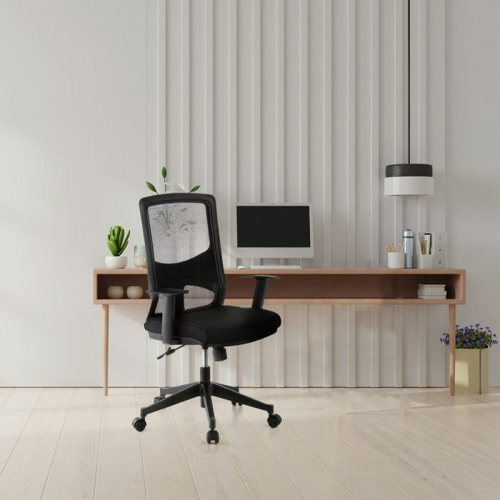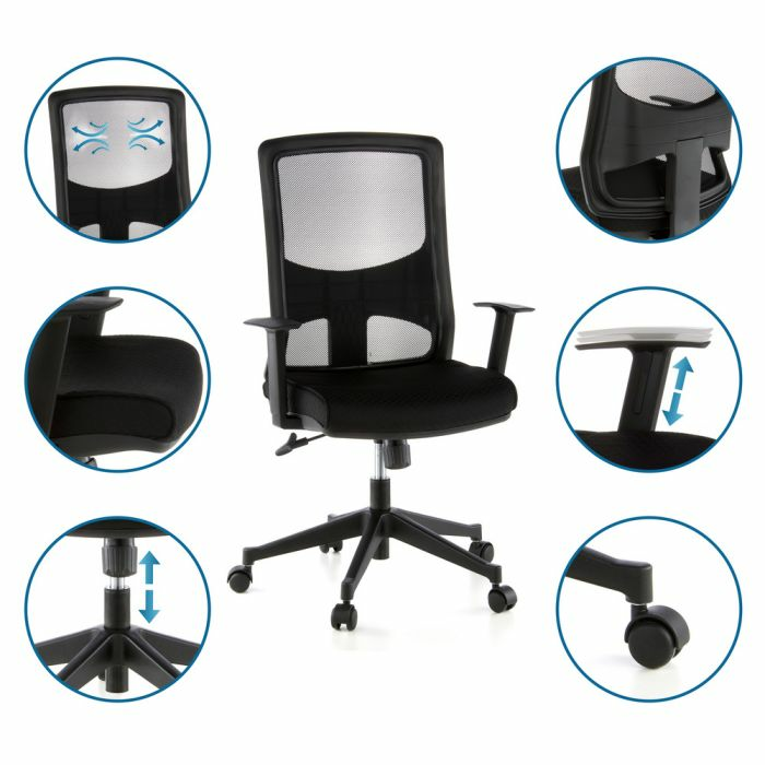 - Bakstoðin er ergonomískt lagað, með áklæði úr öndunarvirku möskvaefni.