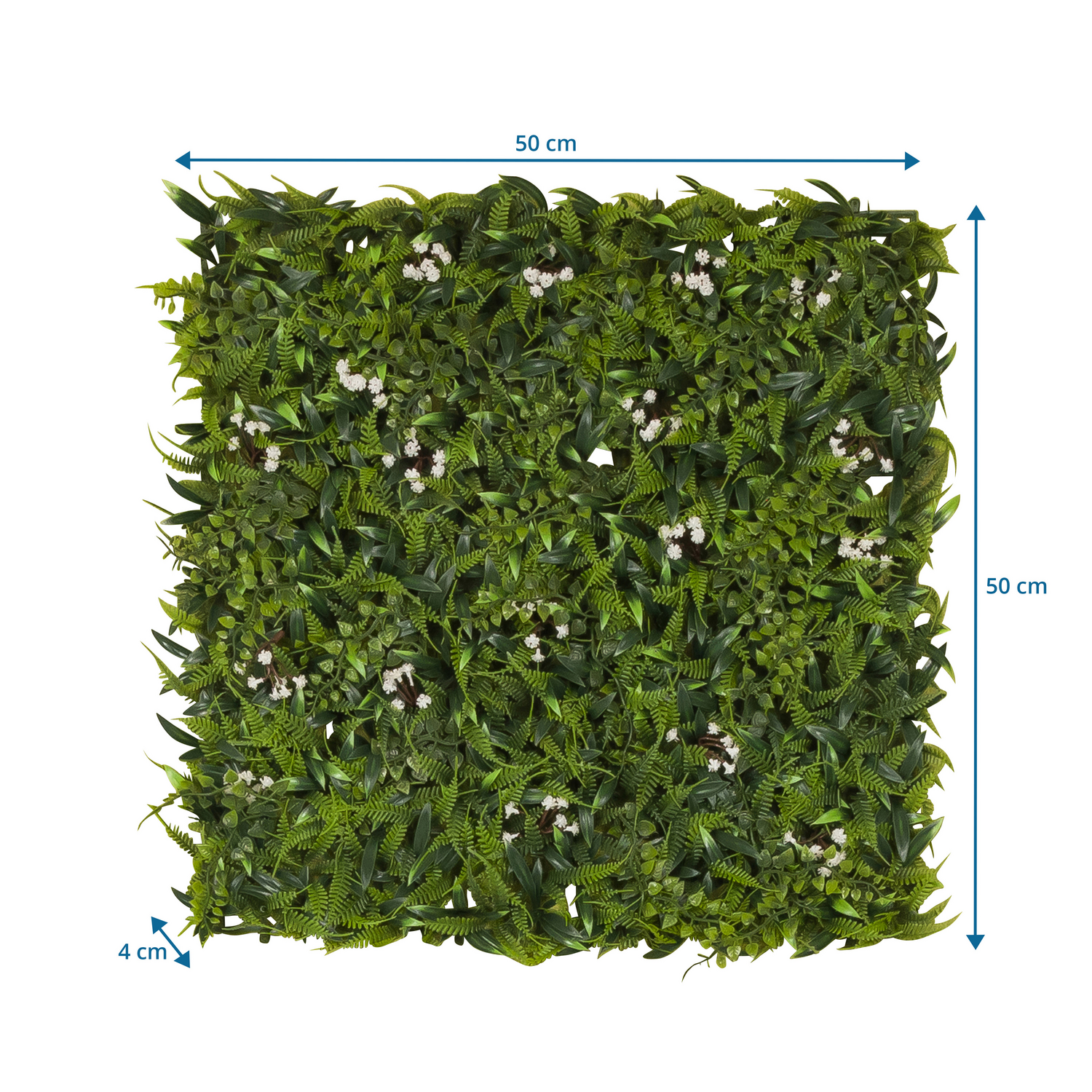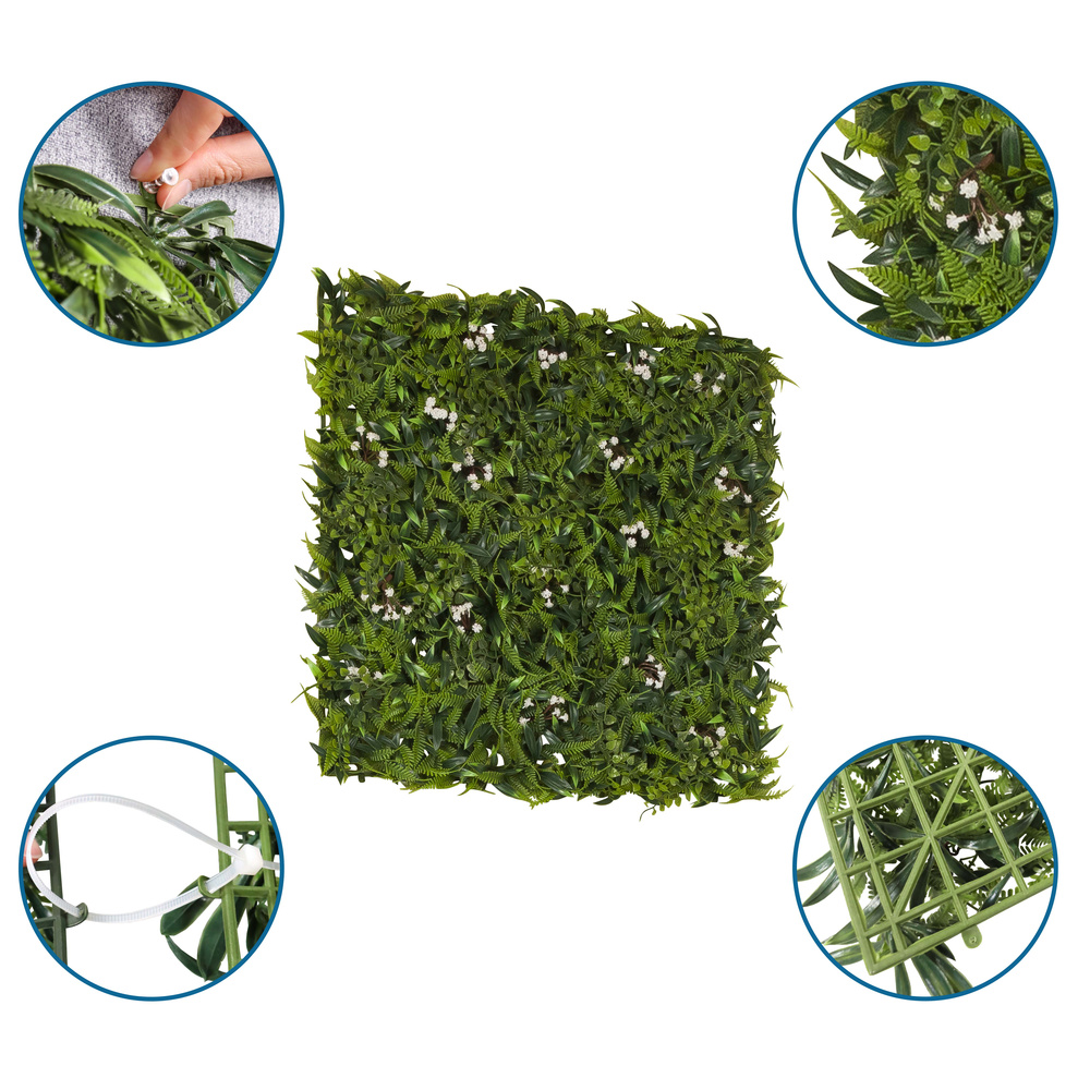 - Sígræn skreyting án viðhaldsvandamála: Gróðurmottan samanstendur af ítarlegum blómum, laufum og grasi, sett á endingargott plastgrind.