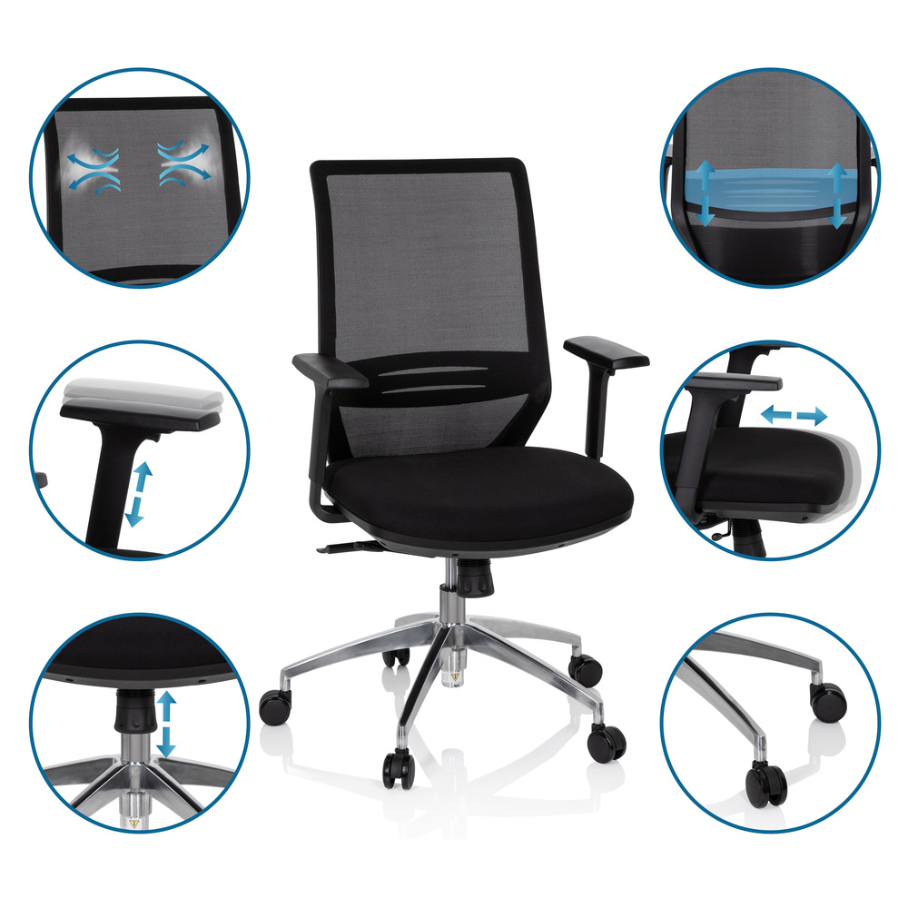 Ertu að leita að nútímalegum skrifstofustól með hagnýtum stillingarmöguleikum sem er jafnframt glæsilegur klassík fyrir skrifstofuna eða heimavinnuna? Þá er PROFONDO fullkominn kostur! Háþróuð samsetning af öndunarvirku möskvaefni og slitsterku efni tryggir hámarks þægindi og stöðugt þægilegt setuumhverfi. Ergonomískt mjóhryggsstuðningurinn er stiglaust hæðarstillanlegur. Einnig er hægt að stilla dýpt sætisins fullkomlega með einfaldri hreyfingu.