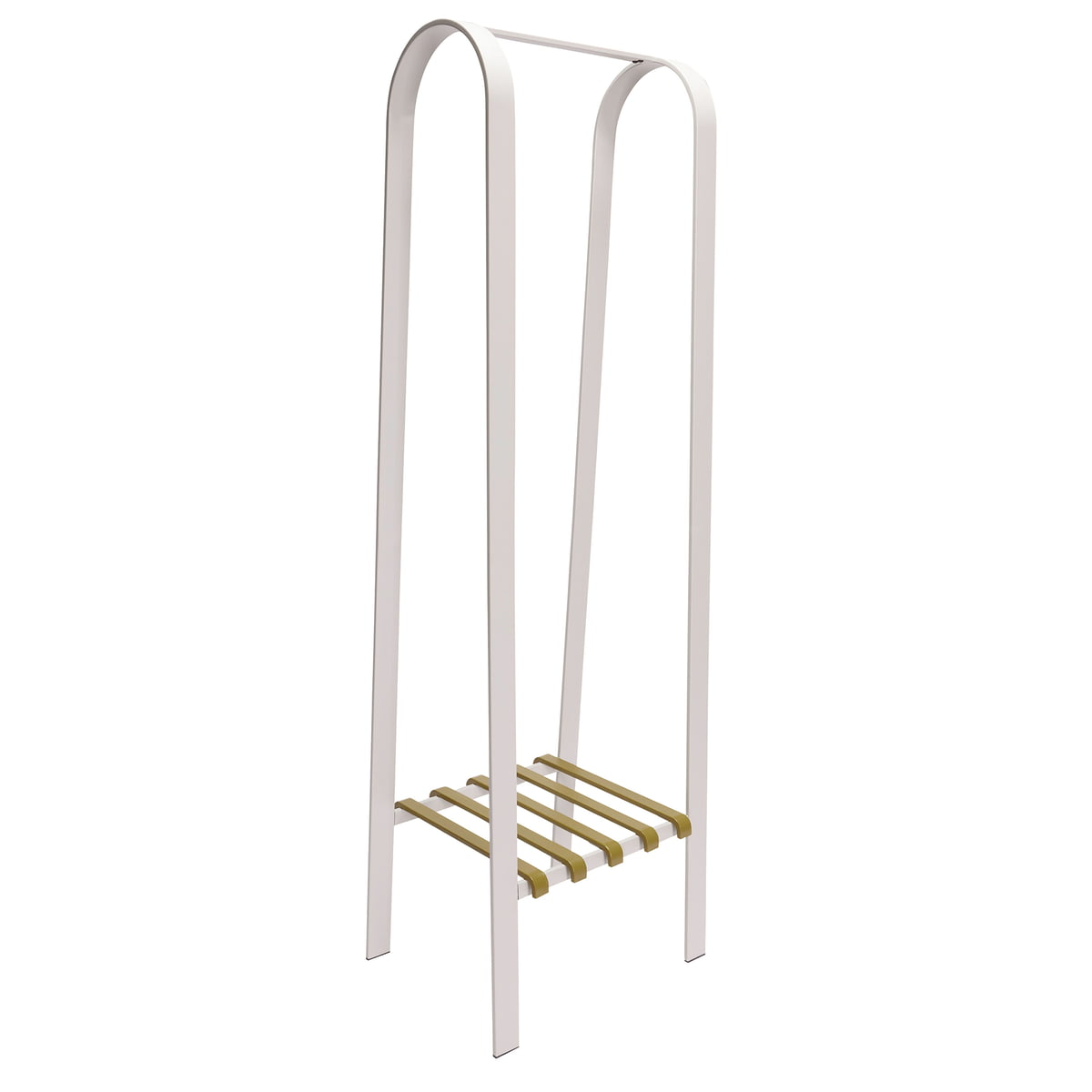 Minimalísk fatahilla úr stáli. Sempre fatahillan frá Hübsch Interior er fullkomin lausn til að spara pláss fyrir fatageymslu. Mjó hönnun hennar hentar vel fyrir herbergi með takmarkað pláss, en samsetningin af gráum og ólífugrænum lit bætir við nútímalegri glæsileika í hvaða herbergi sem er. Þessi fatahilla er úr sterku stáli og sameinar stíl og endingu. Hún er fullkomin til að skipuleggja föt og má jafnvel nota hana á hótelherbergjum fyrir aukin þægindi.