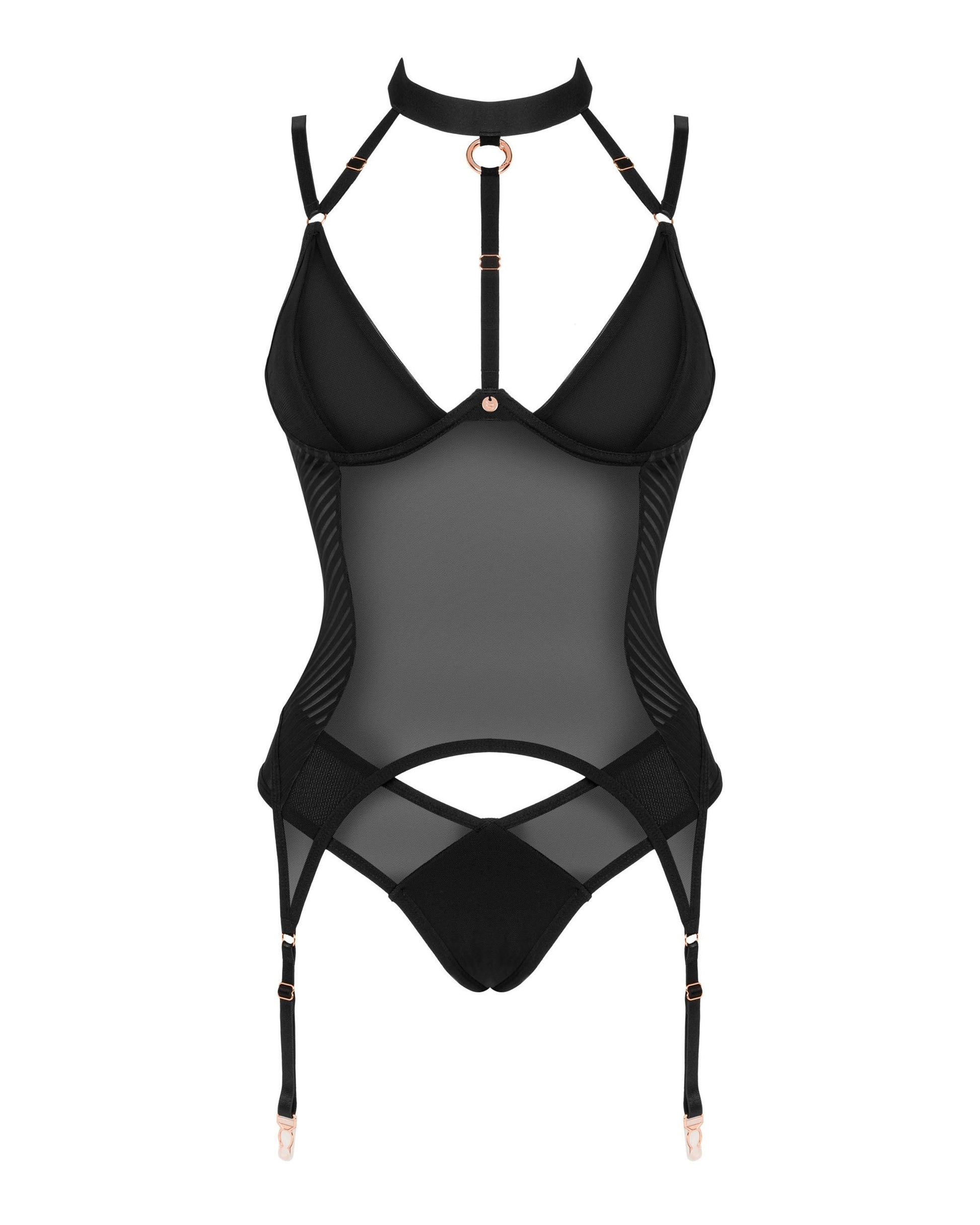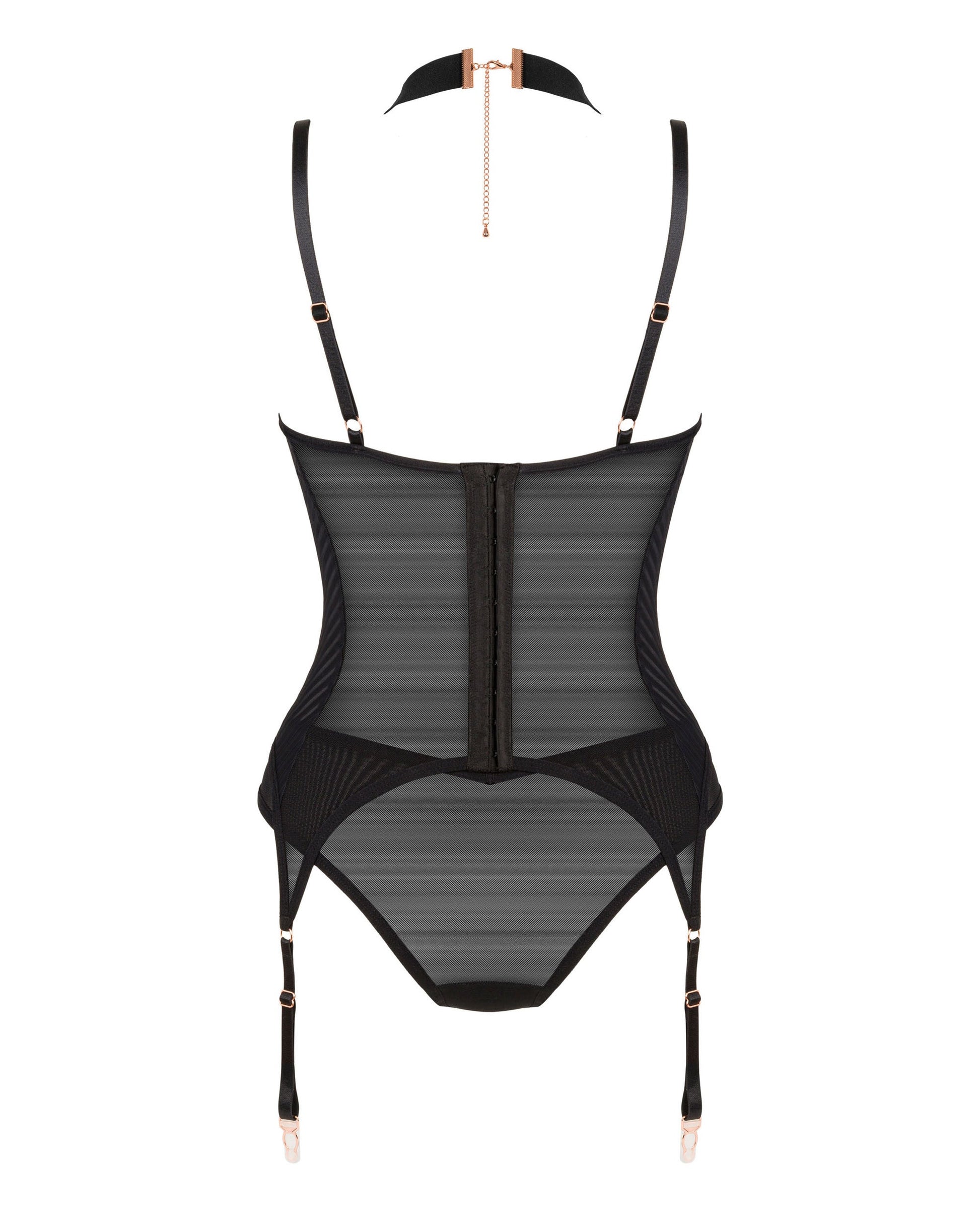 The black corset is a minimalist cut combined with beautiful details in a shade of rose gold. This is an exceptionally elegant design, made of delicate mesh, for many hot occasions.