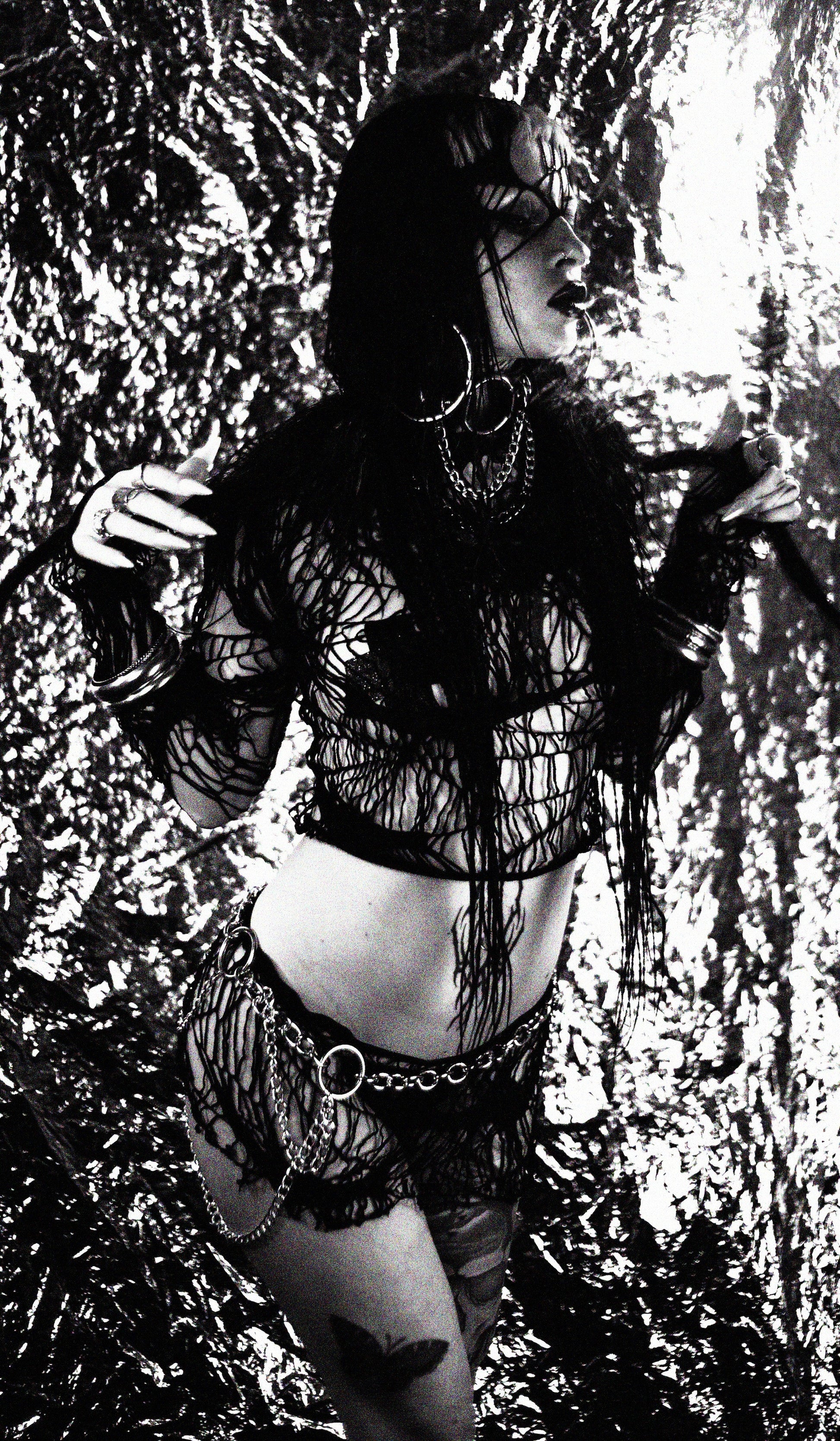 A playful set with a touch of sexy, this set features a tantalizing sheer web pattern that shows what's beneath. The set comes with a hooded crop top and a raw hem mini skirt.