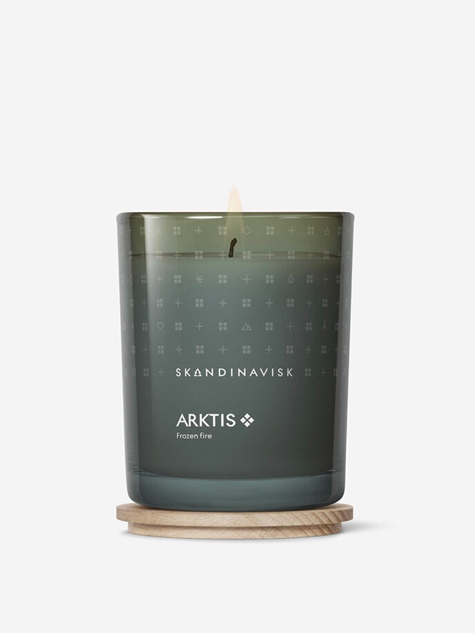 Duftkerze, hergestellt aus Wachs aus nachhaltiger, schwedischer Rapssaat mit Baumwolldocht und mit natürlichen Geruchsstoffen. Wohltuende Duftnoten von arktischem Salbei, Holz, Minze und frischen Schneeflocken im dekorativen, bemalten Glasgefäß mit Buchenholzdeckel. Dekorative Verpackung, ideal auch zum Verschenken.