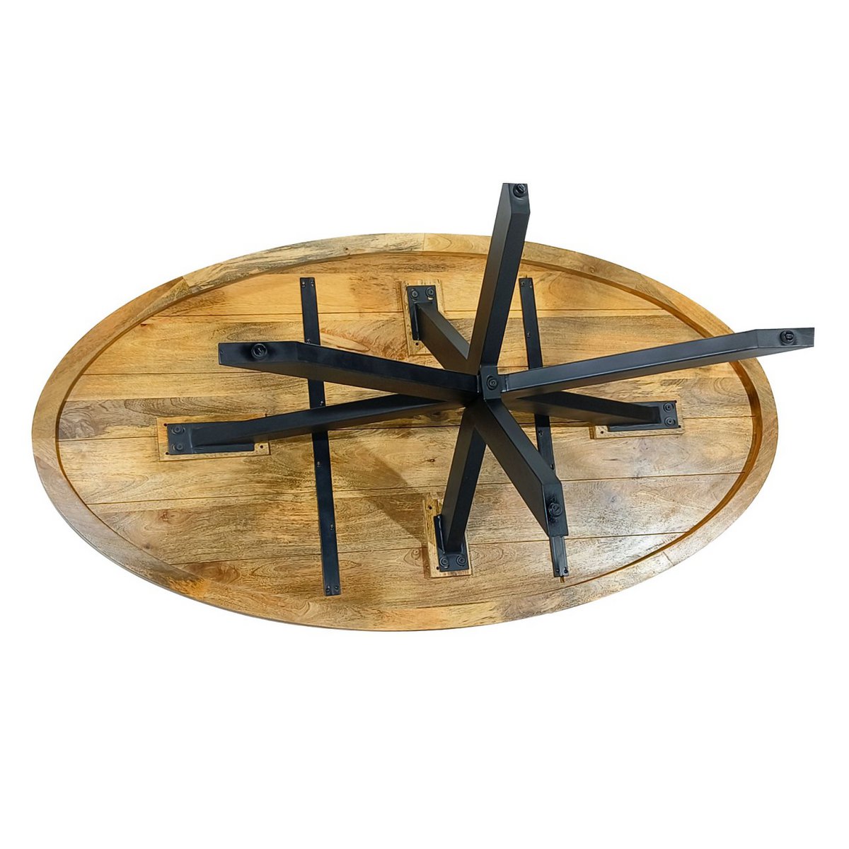 Þetta sporöskjulaga borðstofuborð sameinar áberandi iðnaðarþætti og náttúrulegan fegurð endurunnins mangóviðar. Einstök áferð, ásamt því að slitmerki eru varðveitt af ásettu ráði, gefur hverju borði persónuleika og einstakan blæ.