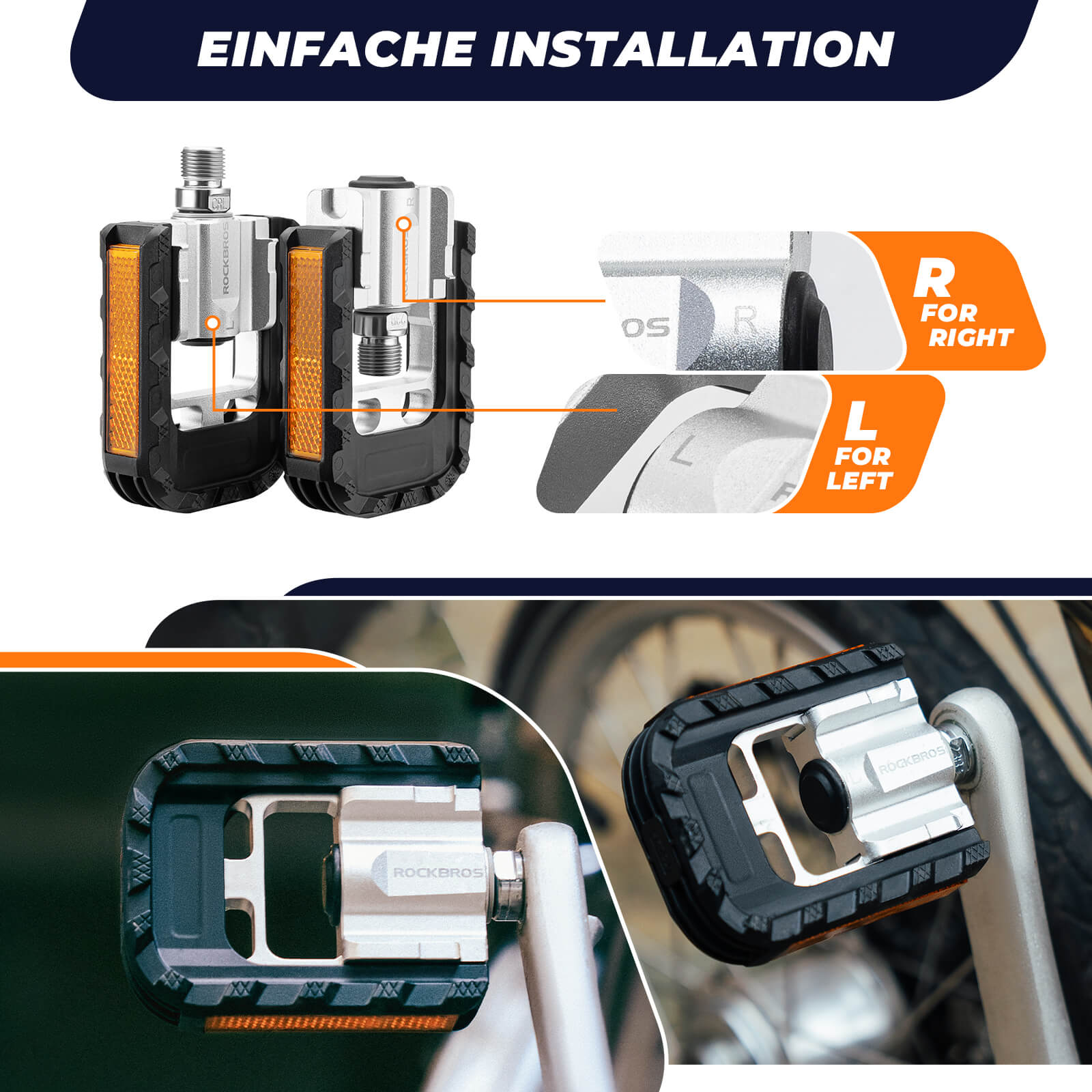 Samanbrjótanleg hjólapedal frá ROCKBROS með handföngum sem eru rennd með góðu gripi, viðhaldslítil legur og endurskinsmerki fyrir hámarksöryggi. Auðvelt í uppsetningu, samhæft við fjallahjól, götuhjól og borgarhjól.