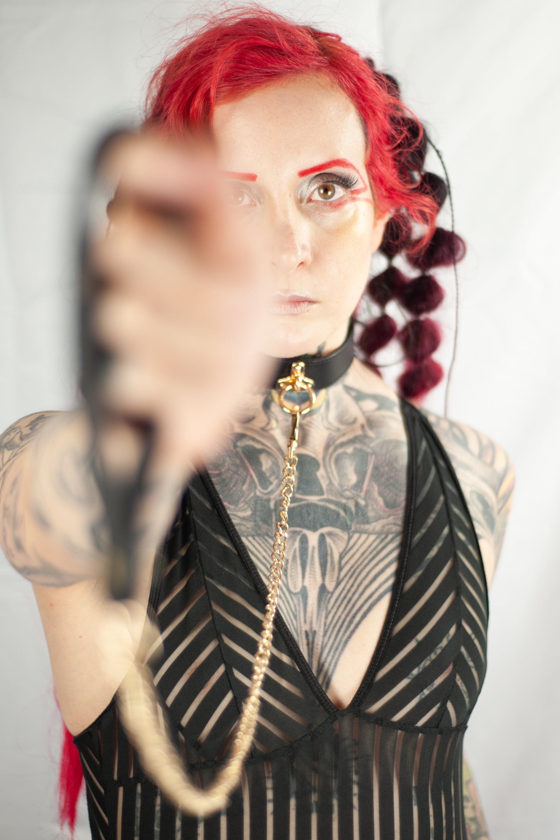 Make a bold statement with this black and gold faux leather collar and leash set. Crafted for quality and style, it combines sleek durability with striking metallic accents, perfect for those who dare to stand out. Elevate your look and command attention with this daring accessory.