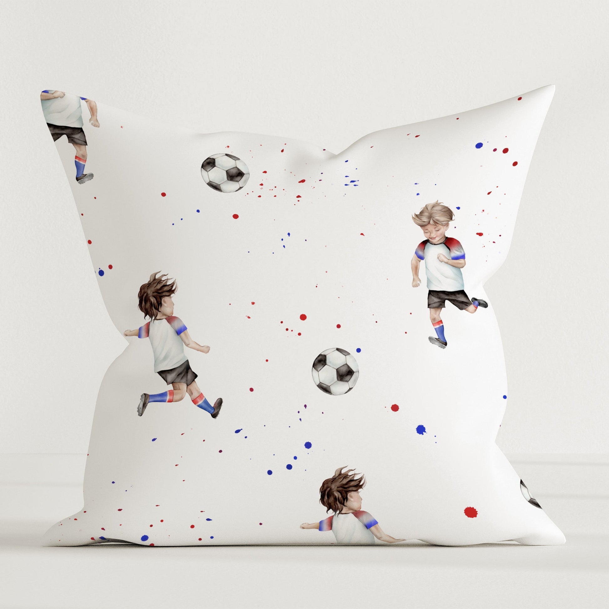 Uppgötvaðu töfra fótboltans: Hönnun þessa skrautpúða flytur þig inn í heim þar sem litlar fótboltastjörnur og lið þeirra verða bestu vinir. Þessi púði er úr 100% hreinni bómull og er fullkominn kósýfélagi fyrir alla litla fótboltaáhugamenn!