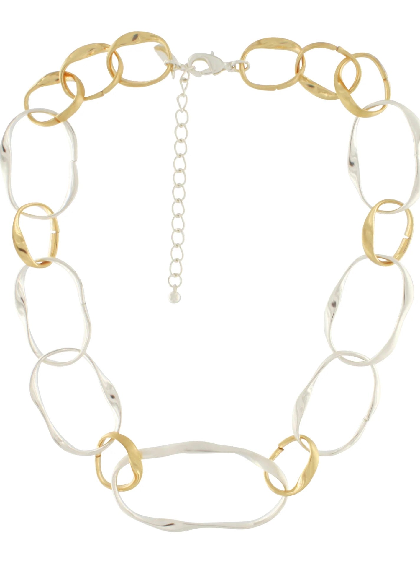 Modische, zweifarbige Statementhalskette aus matt versilbertem oder matt vergoldeten Messing. Mit unterschiedlich großen, organisch geformten Ringen gearbeitet. Variabel in der Länge einstellbar.
