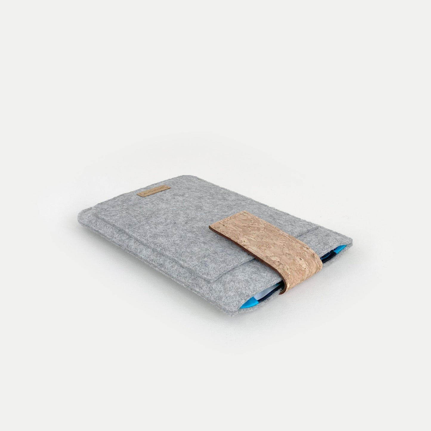 In unserer stilvollen E-Book-Reader Hülle „HAKA“ wird sich dein PocketBook InkPad Color 3 wohlfühlen Mit unserer passgenauen Schutzhülle wird sich dein PocketBook InkPad Color 3 mit all seinen Geschichten mehr als wohlfühlen. Stilvoll und ohne Schnickschnack. Gleichmäßige Nähte und Kanten zeigen unsere Liebe fürs Detail. Dabei verarbeiten wir nachhaltige Materialien in Bio-Qualität und von ausgewählten Schäfern. Hergestellt in Deutschland in unserer eigenen Manufaktur, wird die Hülle mit einer innovativen Verschlusslasche aus robustem Kork angeboten. Der flache, magnetische Knopf garantiert Sicherheit und Stil. Ein integriertes Fach an der Vorderseite bietet schnellen Zugriff auf Notizzettel, Kabel und andere kleine Gegenstände, um alles sicher und organisiert zu halten.