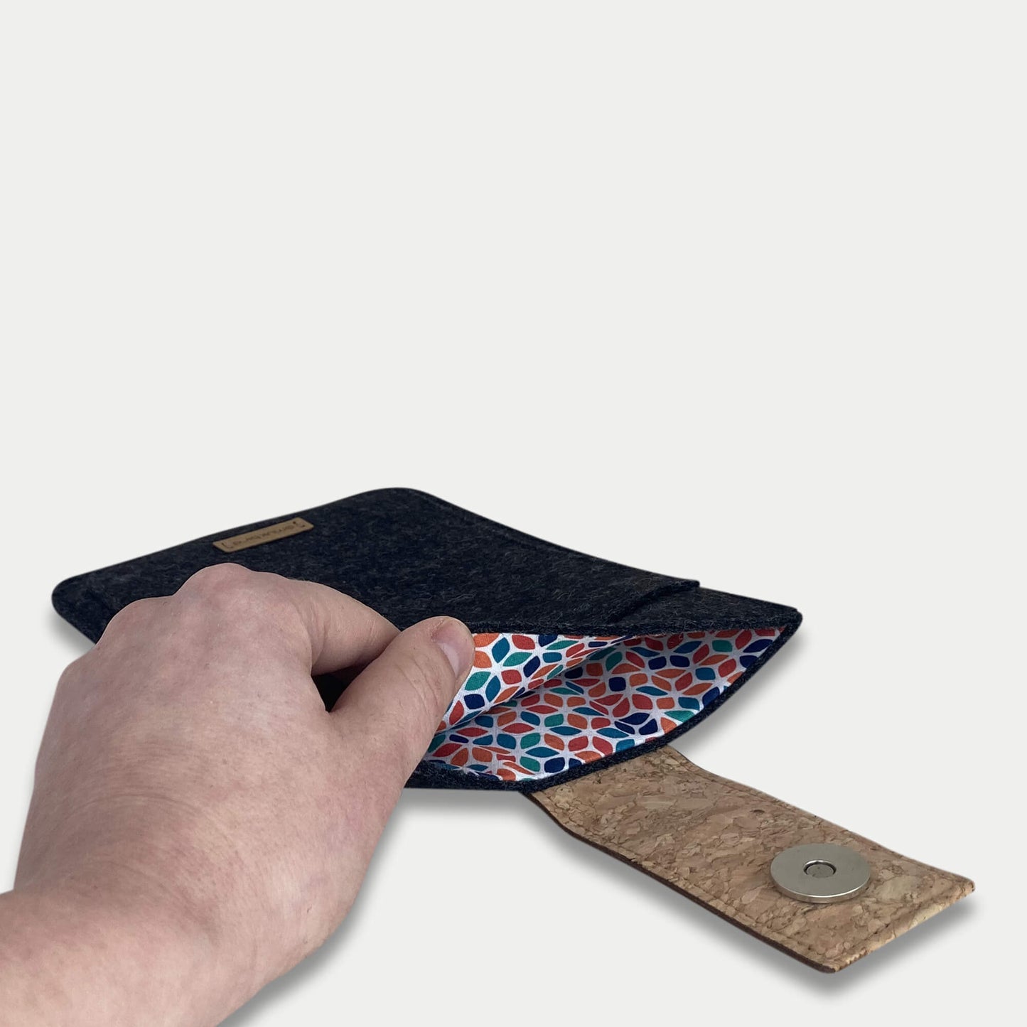 In unserer stilvollen E-Book-Reader Hülle „HAKA“ wird sich dein Tolino Page 2 wohlfühlen Mit unserer passgenauen Schutzhülle wird sich dein Tolino Page 2 mit all seinen Geschichten mehr als wohlfühlen. Stilvoll und ohne Schnickschnack. Gleichmäßige Nähte und Kanten zeigen unsere Liebe fürs Detail. Dabei verarbeiten wir nachhaltige Materialien in Bio-Qualität und von ausgewählten Schäfern. Hergestellt in Deutschland in unserer eigenen Manufaktur, wird die Hülle mit einer innovativen Verschlusslasche aus robustem Kork angeboten. Der flache, magnetische Knopf garantiert Sicherheit und Stil. Ein integriertes Fach an der Vorderseite bietet schnellen Zugriff auf Notizzettel, Kabel und andere kleine Gegenstände, um alles sicher und organisiert zu halten.