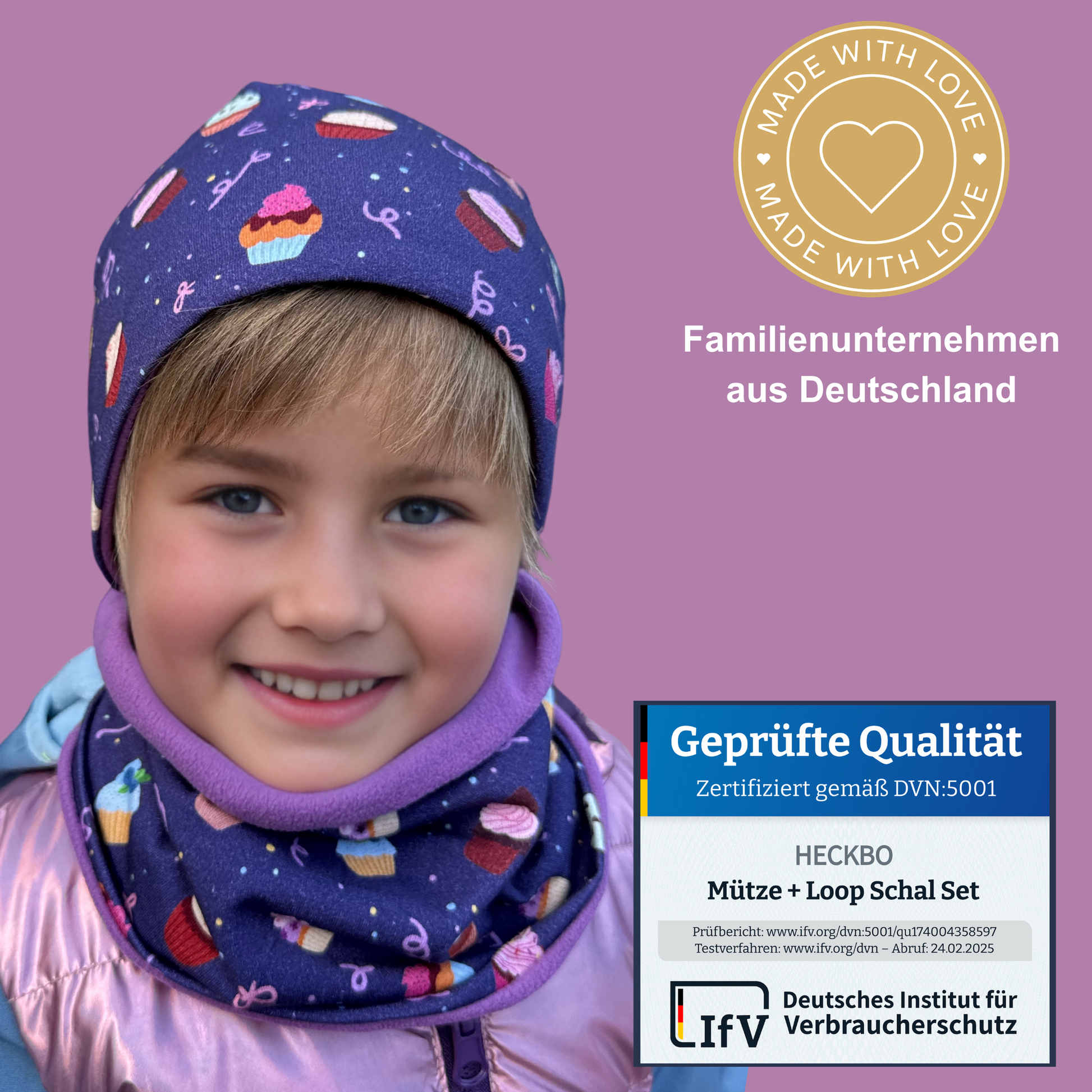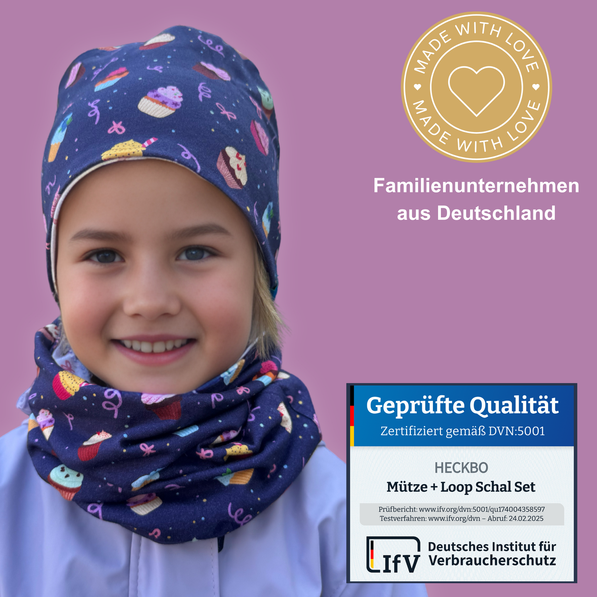 Mit diesem liebevoll gestalteten Set aus Mütze und Schlauchschal ist Ihr Kind modisch und gemütlich unterwegs – ob beim Spielen auf dem Spielplatz, im Kindergarten oder bei Ausflügen mit der Familie. Das bunte Keks-Motiv bringt gute Laune und begleitet kleine Naschkatzen durch jede Jahreszeit. Erhältlich in zwei Varianten – passend für Frühling, Sommer, Herbst oder Winter.