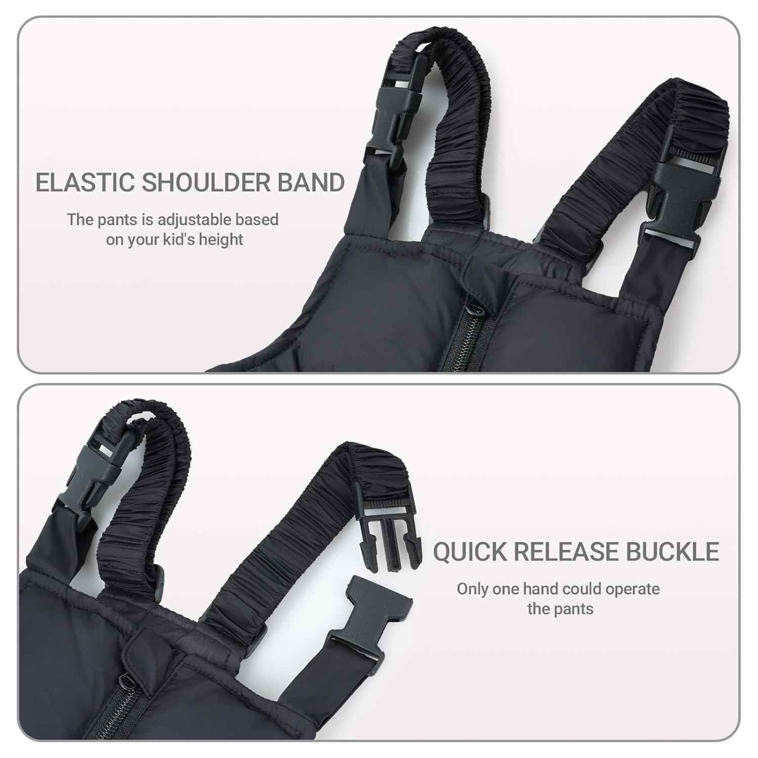 - Snjóbuxur --- Stillanlegar axlarólar með hraðlokun, rennilás að framan allan sólarhringinn, teygjanlegt mitti og op í fótleggjum.