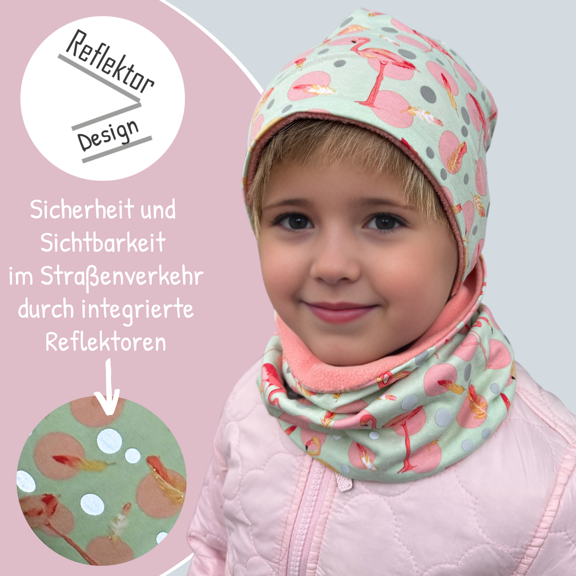 🦩 Mütze & Schal im Set – mit reflektierendem Flamingo-Motiv