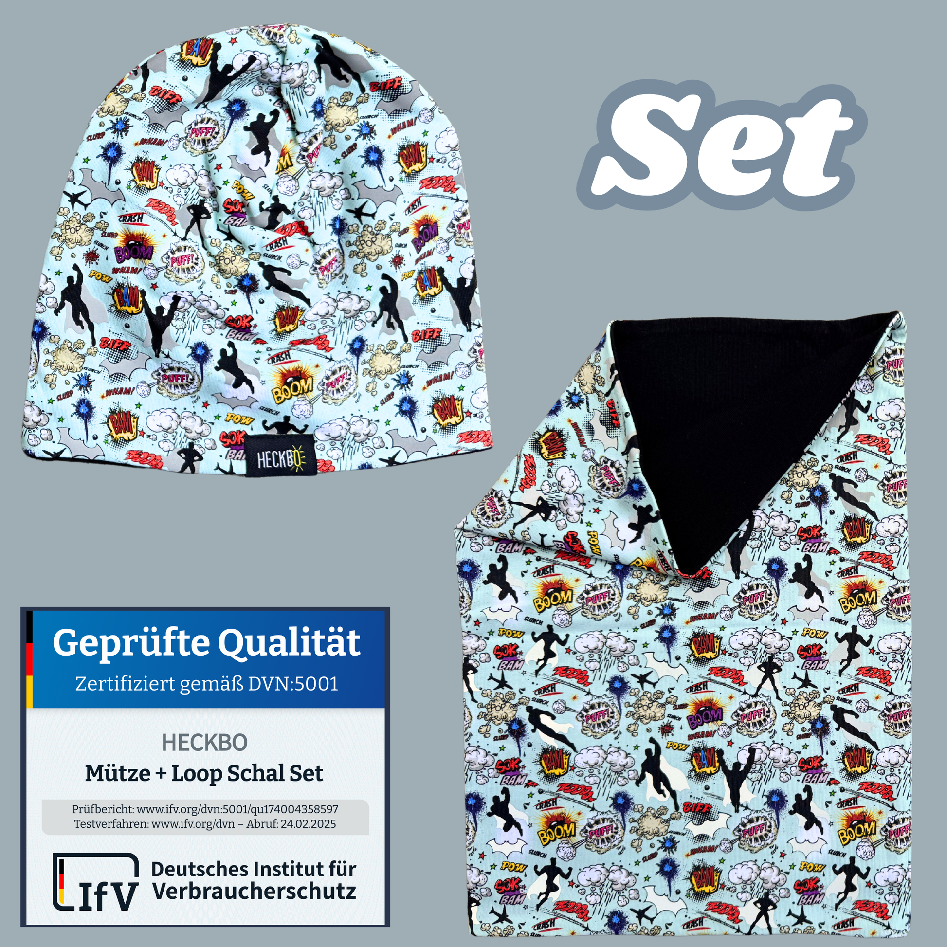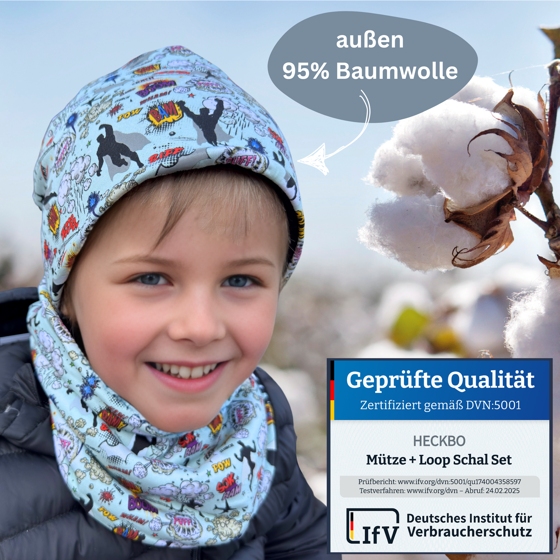 Mit dem 2-teiligen HECKBO Set bestehend aus Beanie-Mütze und farblich passendem Loop-Schal ist dein Kind nicht nur warm und bequem eingepackt, sondern auch bei Dunkelheit sichtbar. Das reflektierende Drachen-Motiv sorgt für Sicherheit im Alltag und begeistert mit einem coolen Look – ideal für kleine Abenteurer im Kindergarten-, Schul- und Outdoor-Alltag. Erhältlich in zwei Ausführungen: mit leichtem Jersey-Futter für Frühling und Herbst oder mit kuscheligem Vlies für den Winter.