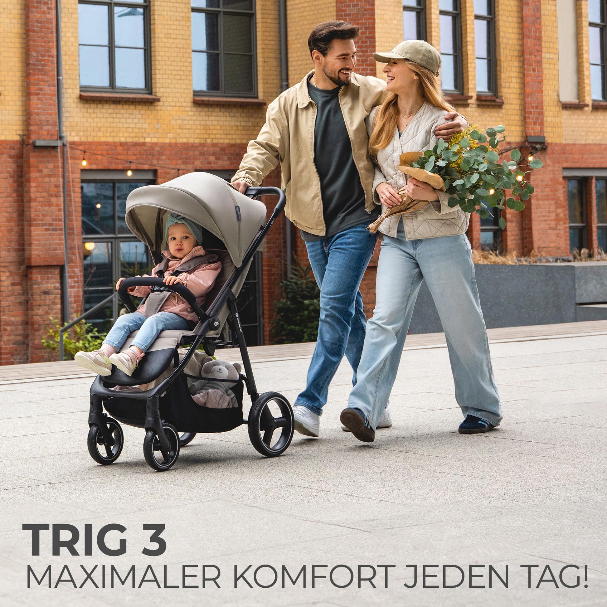 Kinderkraft TRIG 3 barnavagn, samanbrjótanlegur, breiður og djúpur sæti með hallandi stöðu, fjöðrun á fjórum hjólum, stórt þak, 5 punkta beisli, allt að 25 kg, ljósbrúnn
