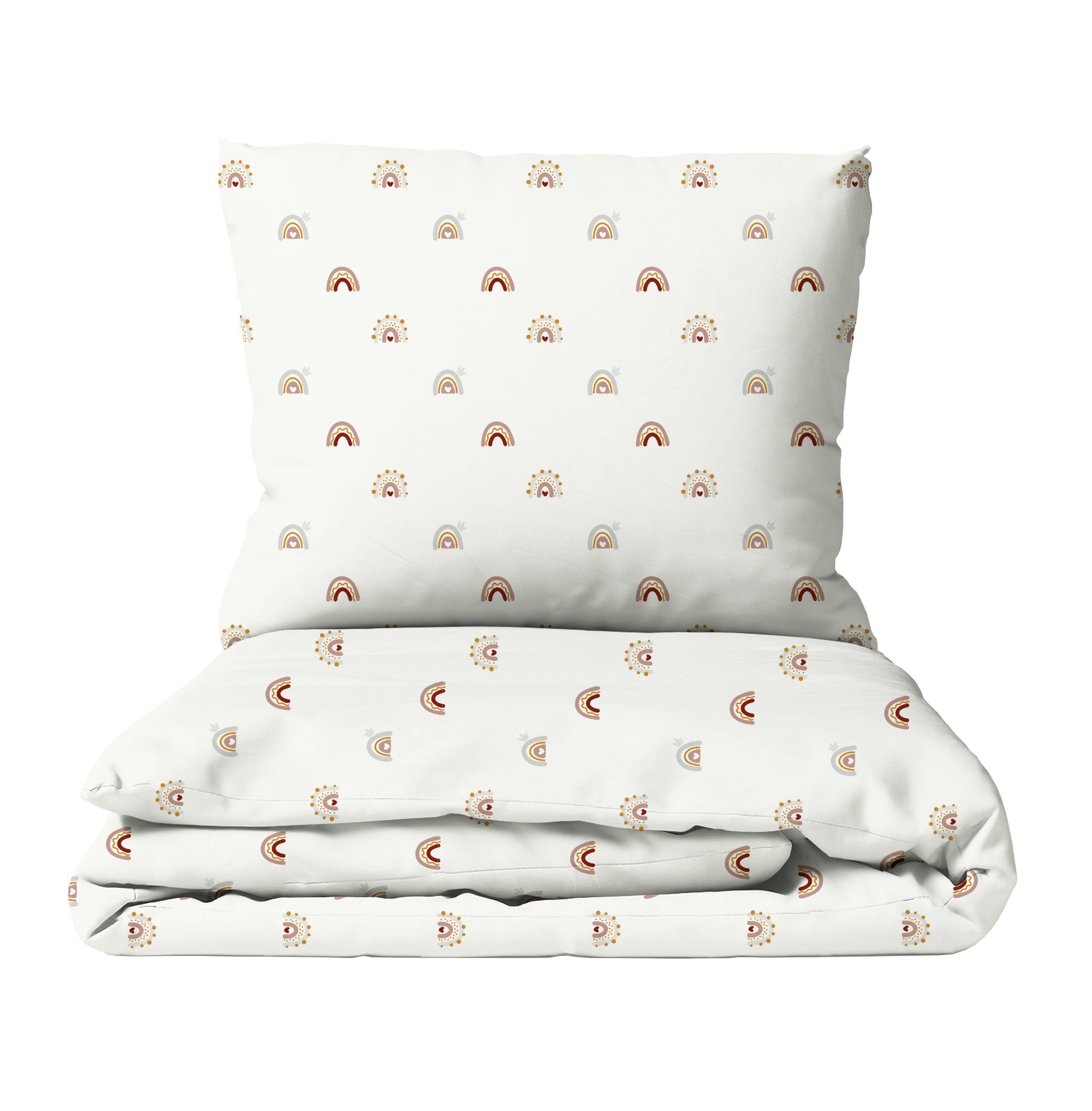 Draumaland undir regnboganum: Hönnunin „Litlu regnbogarnir“ býður barninu þínu að sökkva sér niður í heim fullan af litum og gleði. Með fíngerðum regnbogamynstrum færir þessi rúmföt léttleika, skæra liti og bjartsýni beint inn í svefnherbergi litla draumórabarnsins. Hver nótt verður töfrandi ferðalag um heim þar sem geislandi regnbogi bíður eftir hverja rigningu!