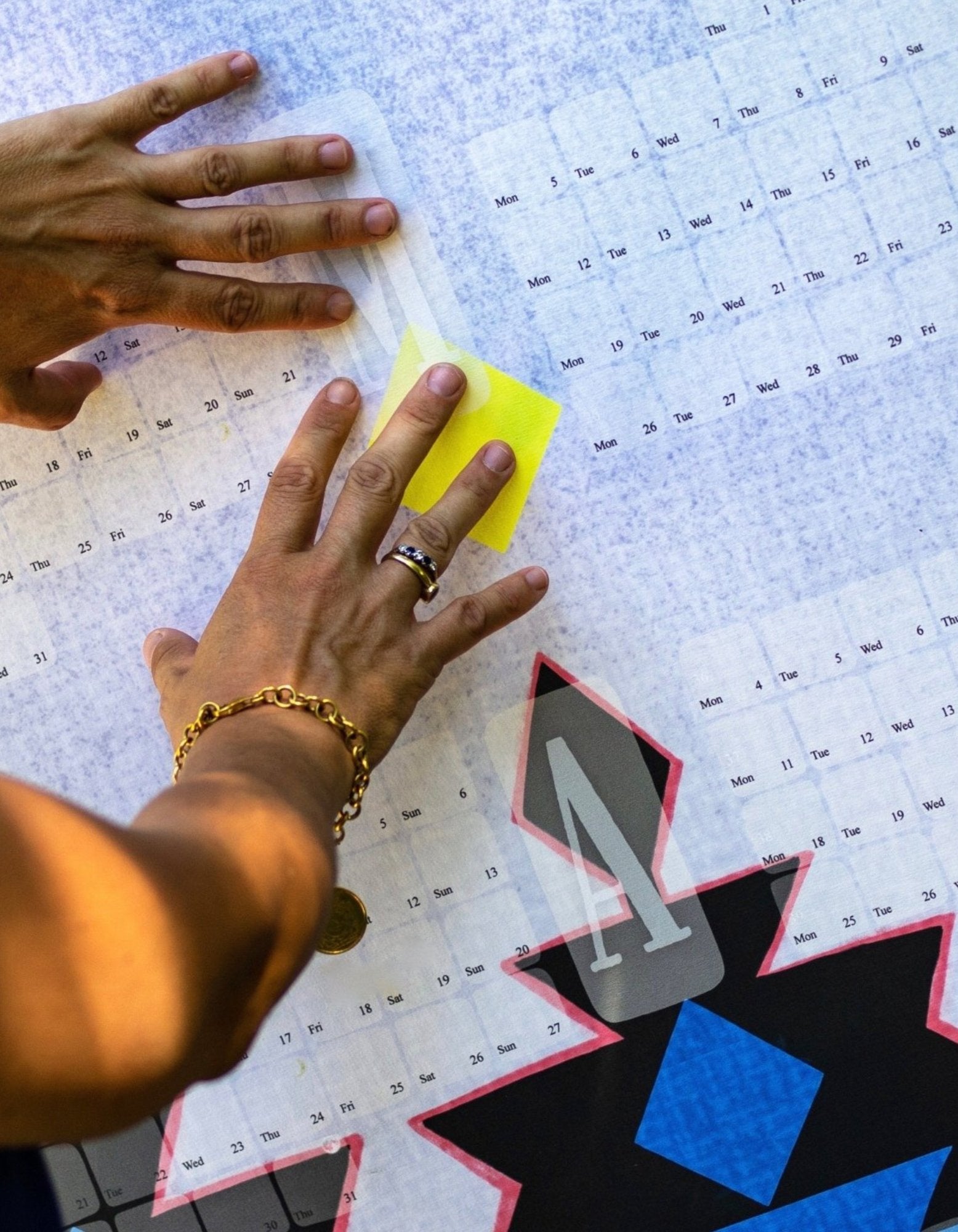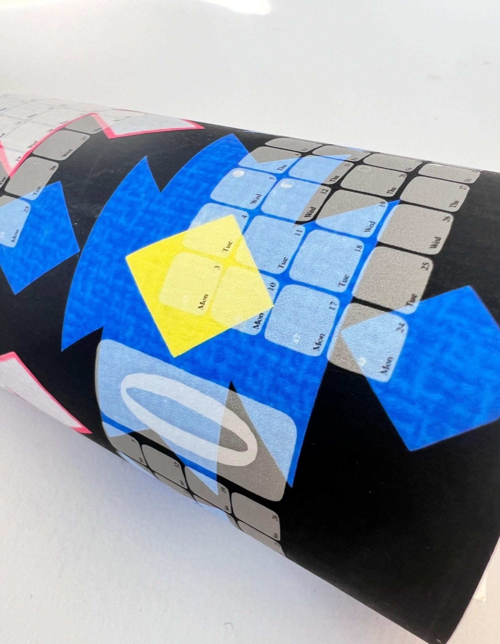 Elskar þú andstæður? Þá ert þú kominn á réttan stað. Þetta hönnunarveggdagatal á listamannapappír skapar áberandi áherslu: svart með bláu Navajo-mynstri á ljósgráum, þykkofnum bakgrunni, neongult og skærrautt.