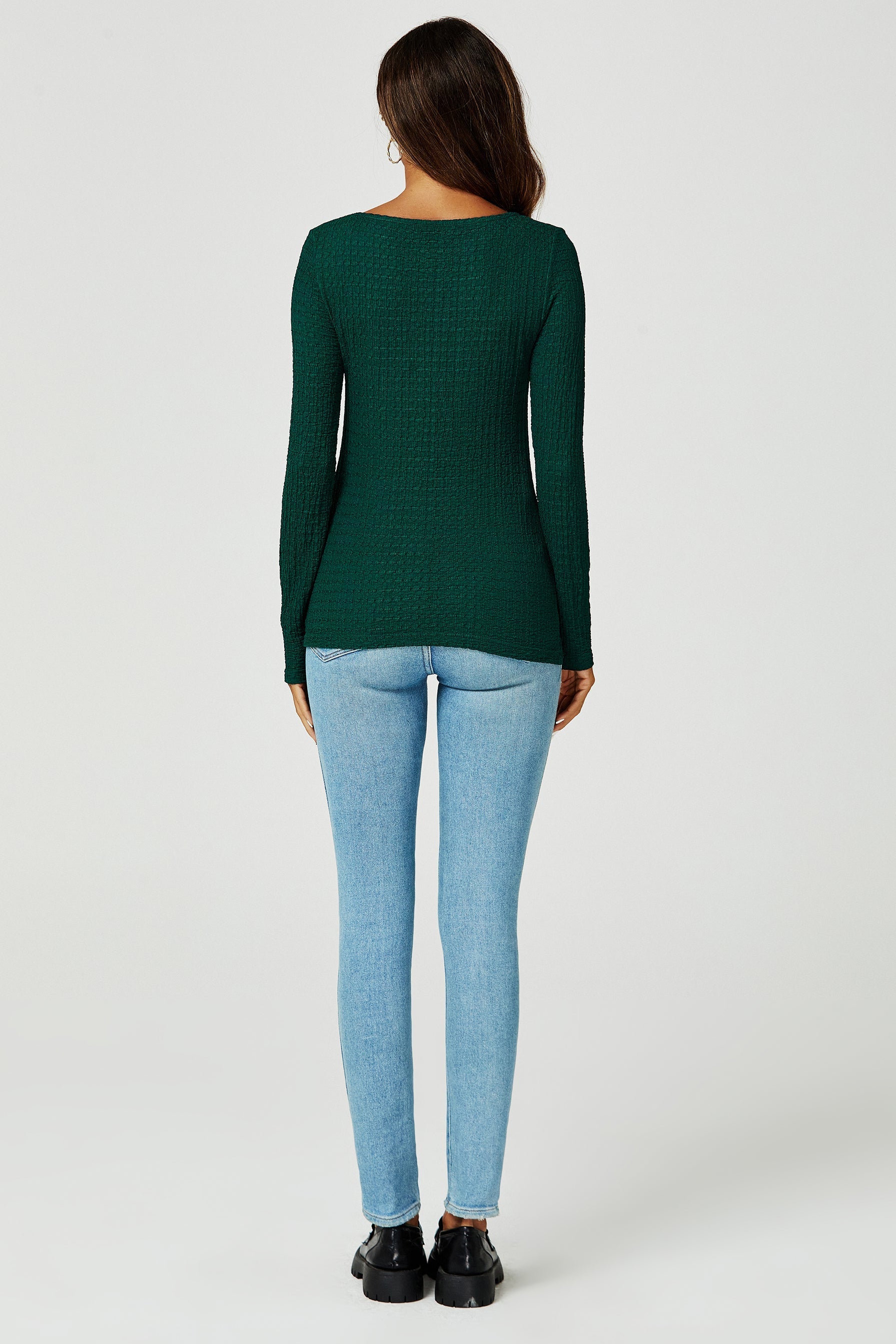 Kynnum okkur Ruched Stretch Square Neck Long Sleeve toppinn okkar, ómissandi fataskáp sem sameinar þægindi og stíl á óaðfinnanlegan hátt. Ferkantaða hálsmálið bætir við nútímalegum og fáguðum blæ, en rufsmáatriðin á ermunum undirstrika heildarhönnunina með vísbendingu um nútímalegan blæ. Teygjanlega efnið tryggir flatterandi og þægilega passform, sem gerir þennan topp fullkominn fyrir allan daginn. Hvort sem hann er paraður við sérsniðnar buxur fyrir fágað skrifstofuútlit eða við uppáhalds gallabuxurnar þínar fyrir frjálslegt útiveru, þá breytist þessi fjölhæfa flík auðveldlega frá degi til kvölds. Lyftu daglegum stíl þínum upp með látlausri glæsileika Ruched Stretch Square Neck Long Sleeve toppsins okkar.