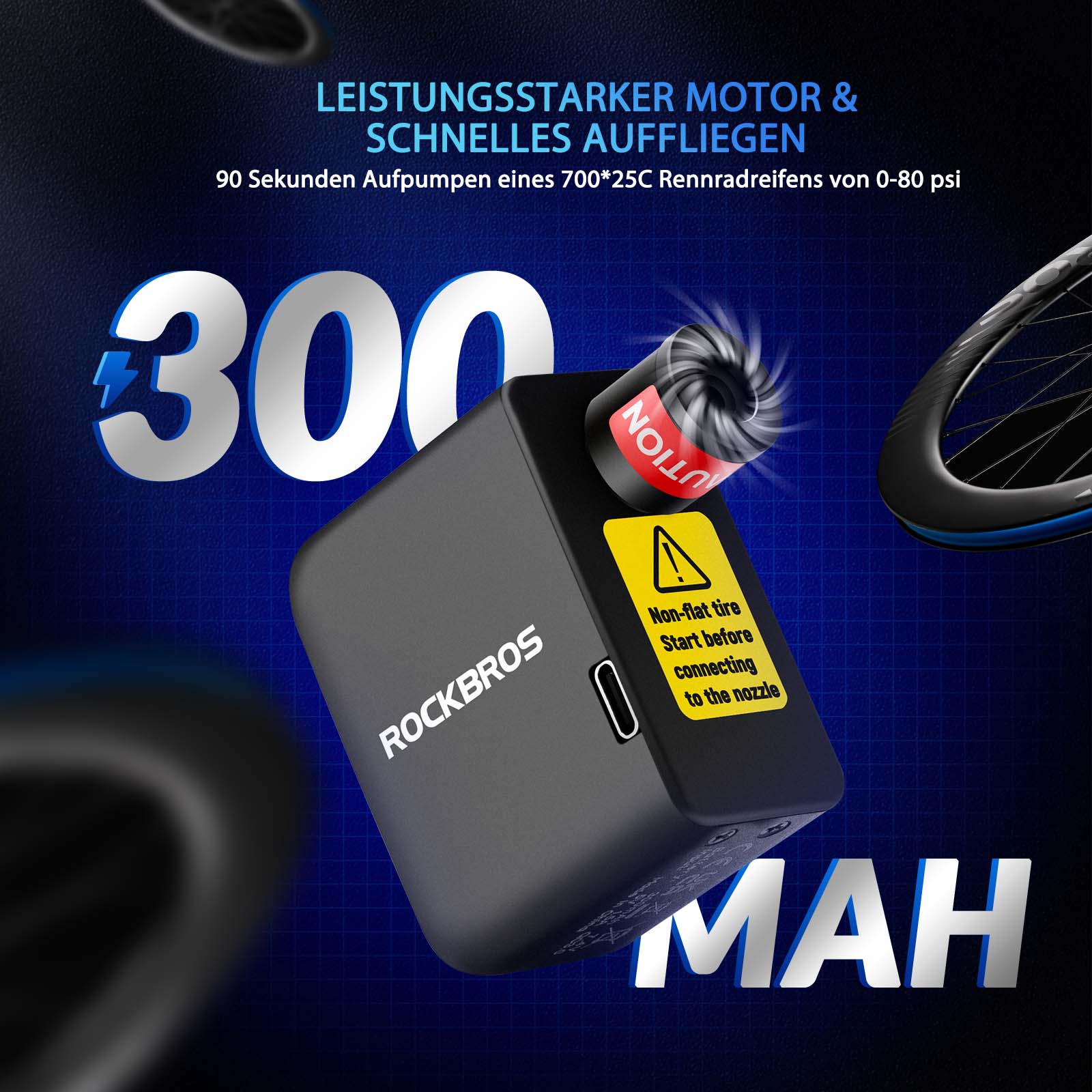 - 300mAh rafhlaða: Teningadælan er búin 300mAh litíumrafhlöðu sem getur blásið upp tvö 700 * 25C dekk frá 0 til 80Psi.