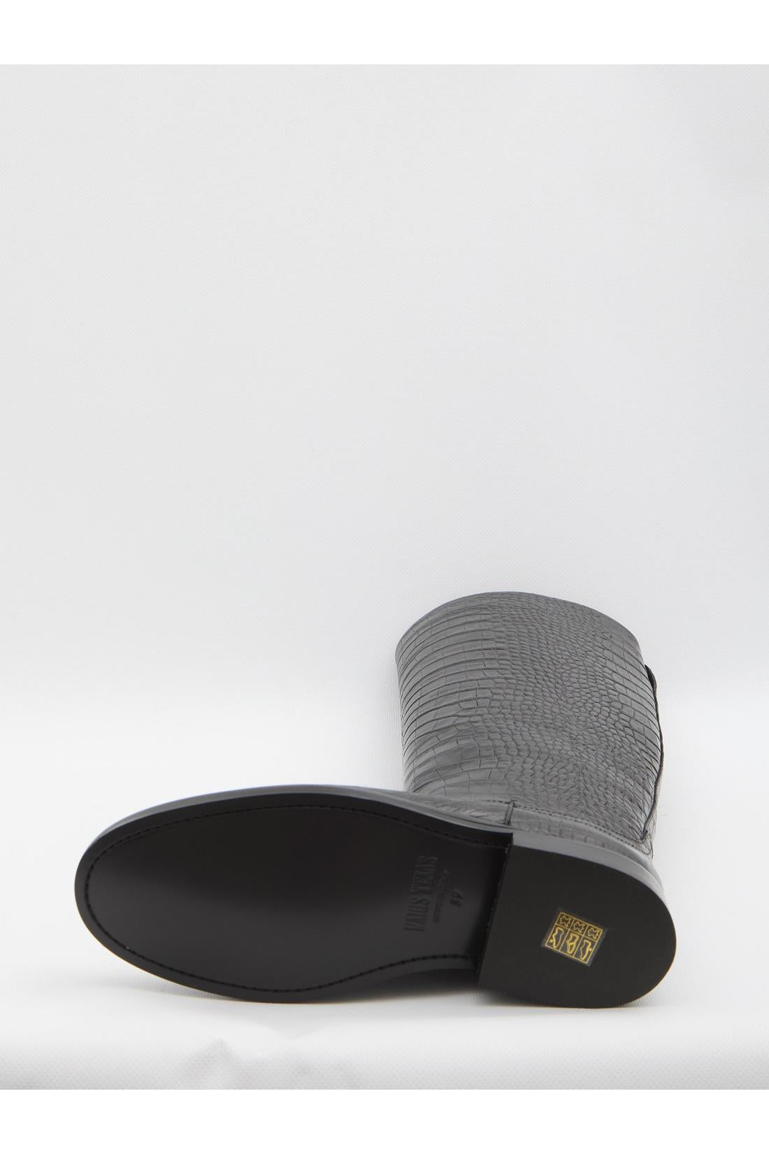 Knee-high tube boot in black croco embossed leather. Featuring a round toe and a leather pull tab at the back. Slip-on style. Dust bag included. Any imperfections in the leather are not to be considered manufacturing defects, but rather a characteristic of the material.