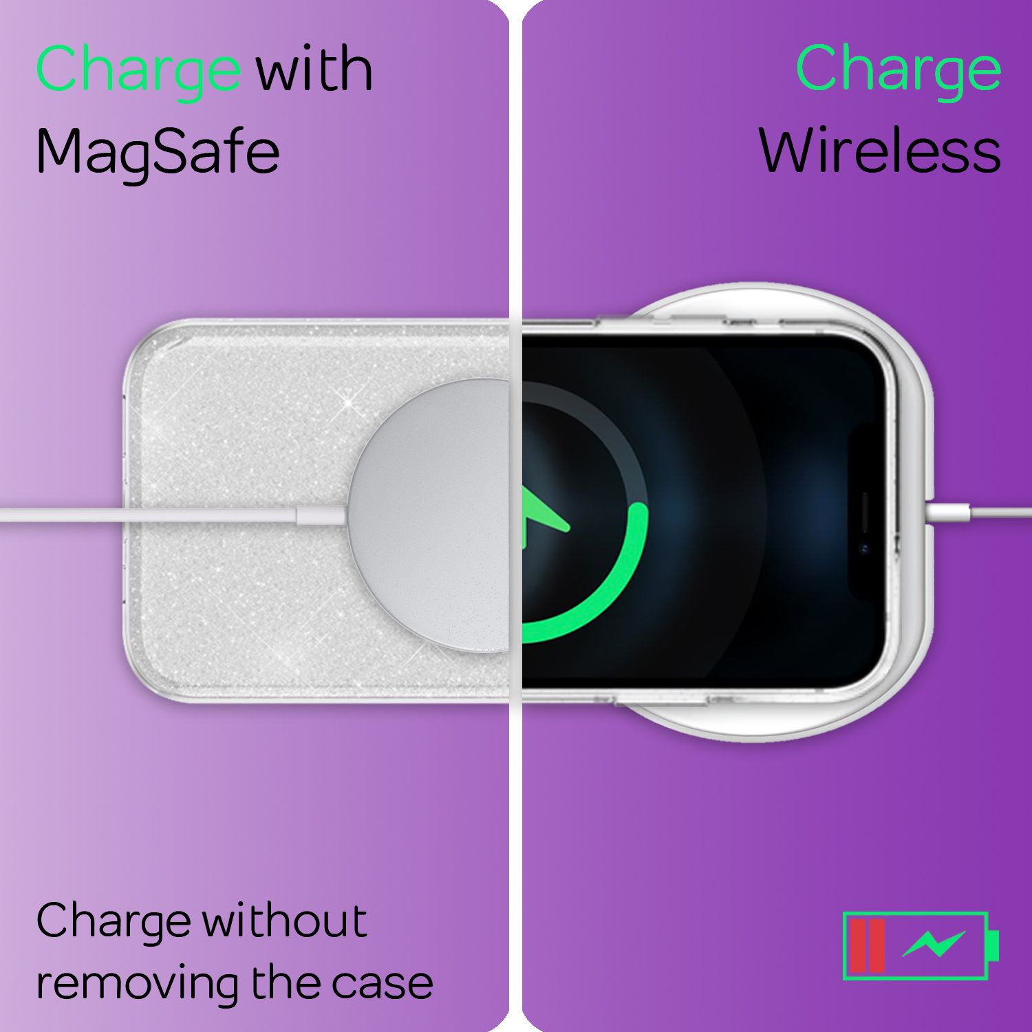 Auðvitað er hægt að hlaða snjallsímann þráðlaust án þess að fjarlægja hulstrið. ShinePop hulstrið sameinar glæsileika, vernd og virkni á hæsta stigi – ómissandi fyrir alla sem elska að skína!