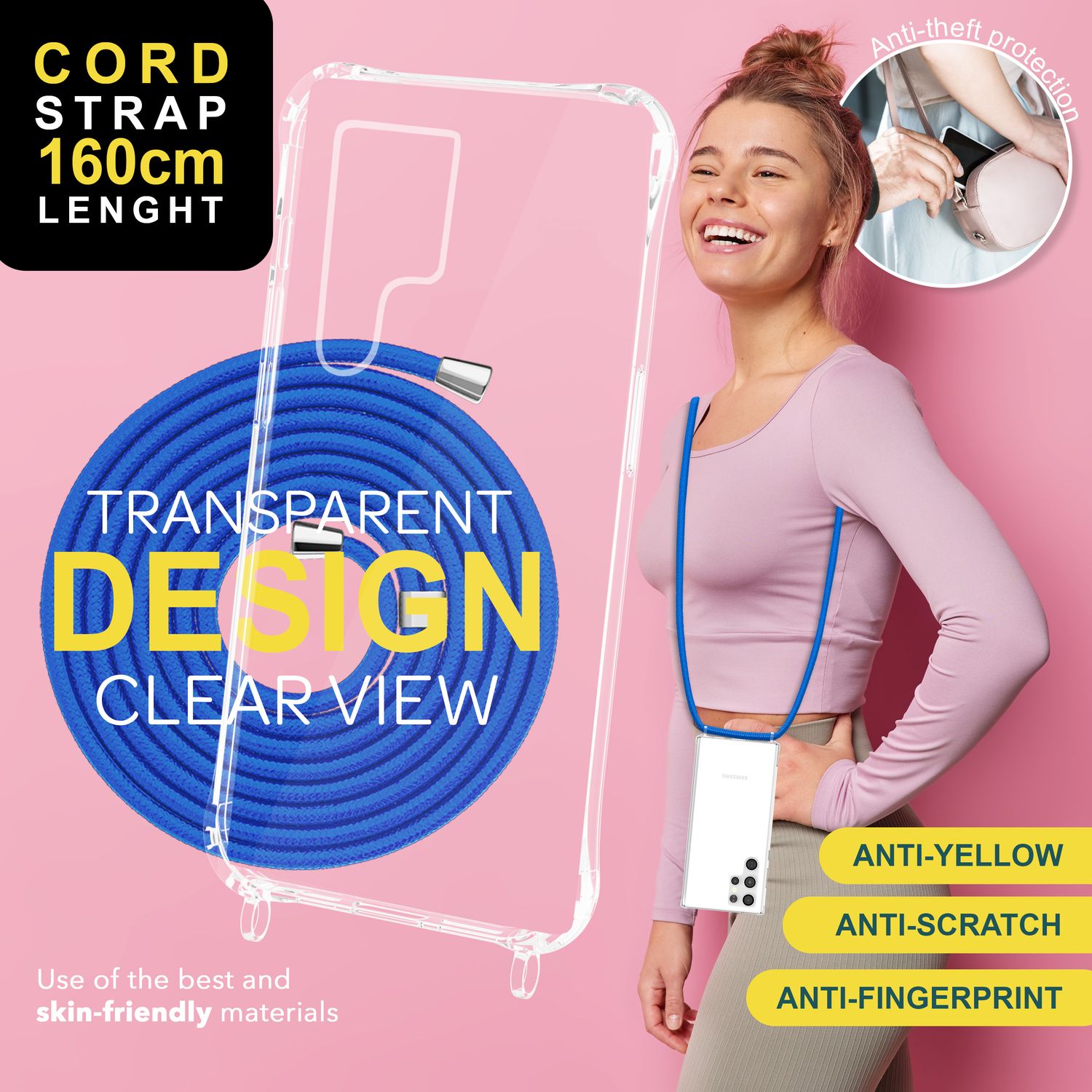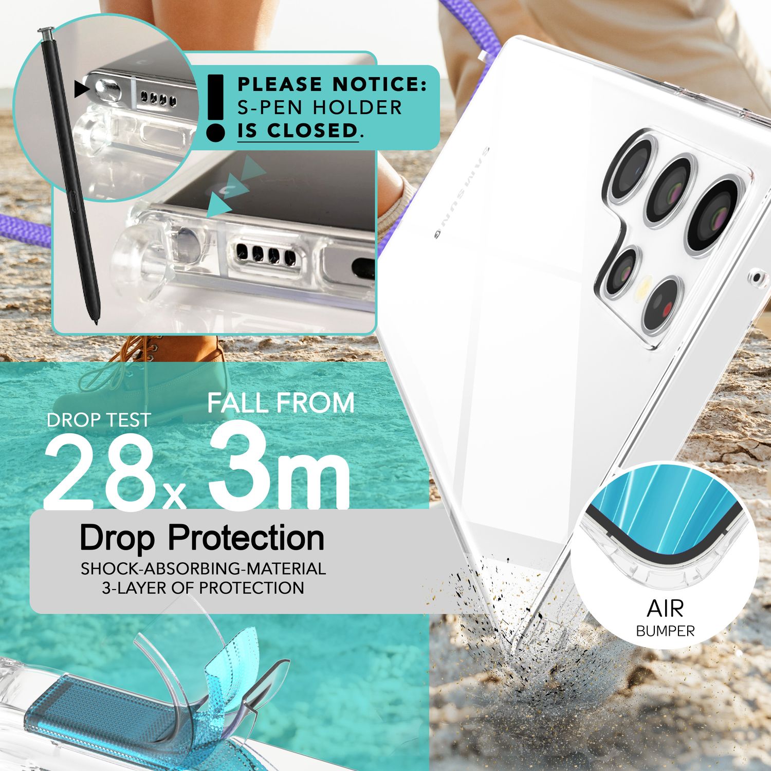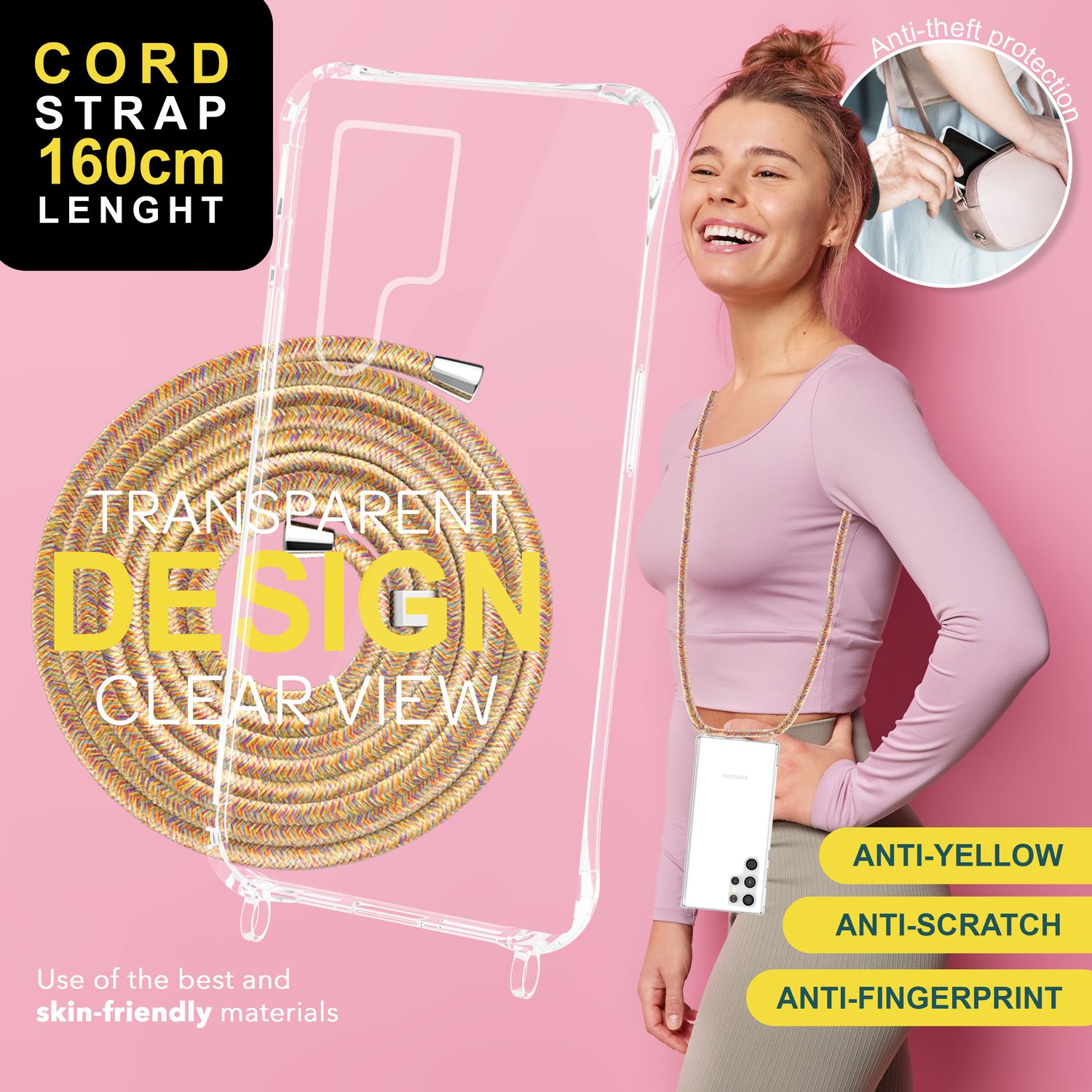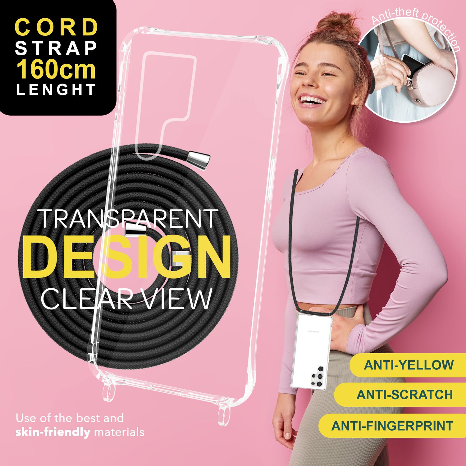 NALIA gegnsætt verndarhulstur með keðju fyrir Samsung Galaxy S24 Ultra, gegnsætt og sterkt símahulstur með snúru