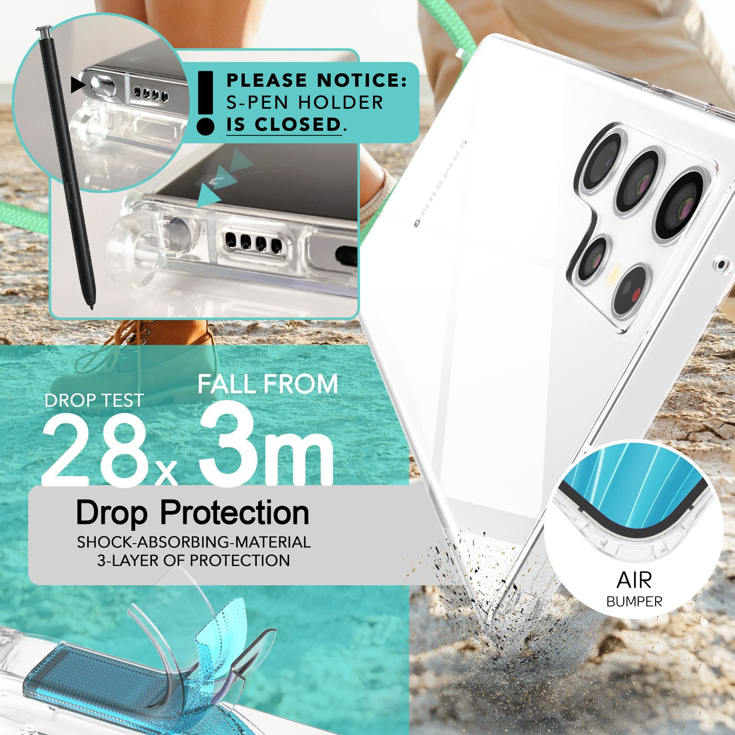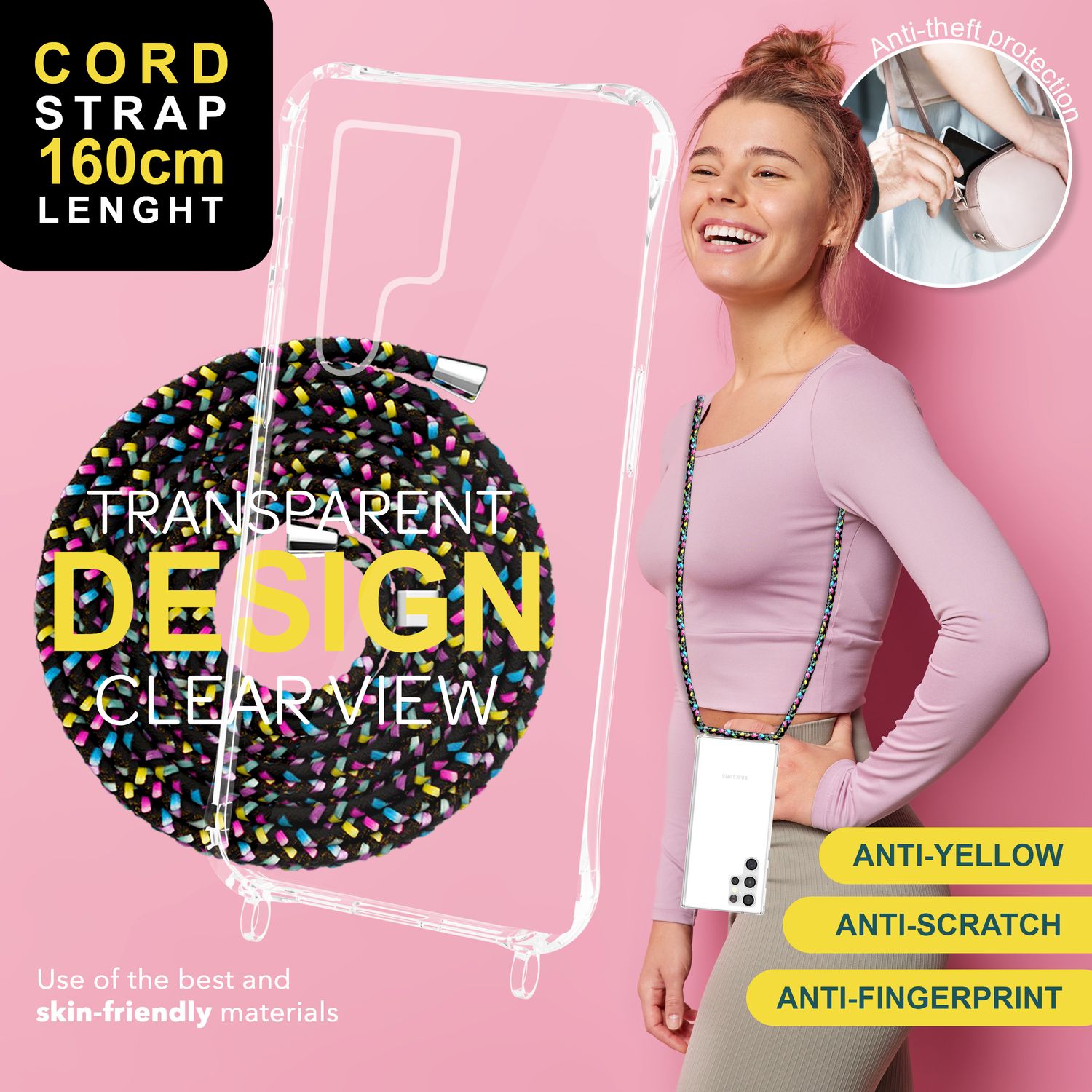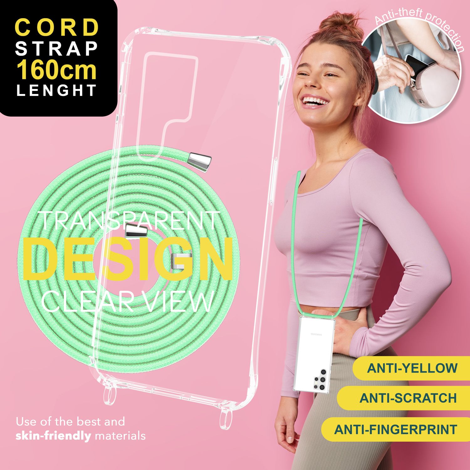 NALIA gegnsætt verndarhulstur með keðju fyrir Samsung Galaxy S24 Ultra, gegnsætt og sterkt símahulstur með snúru