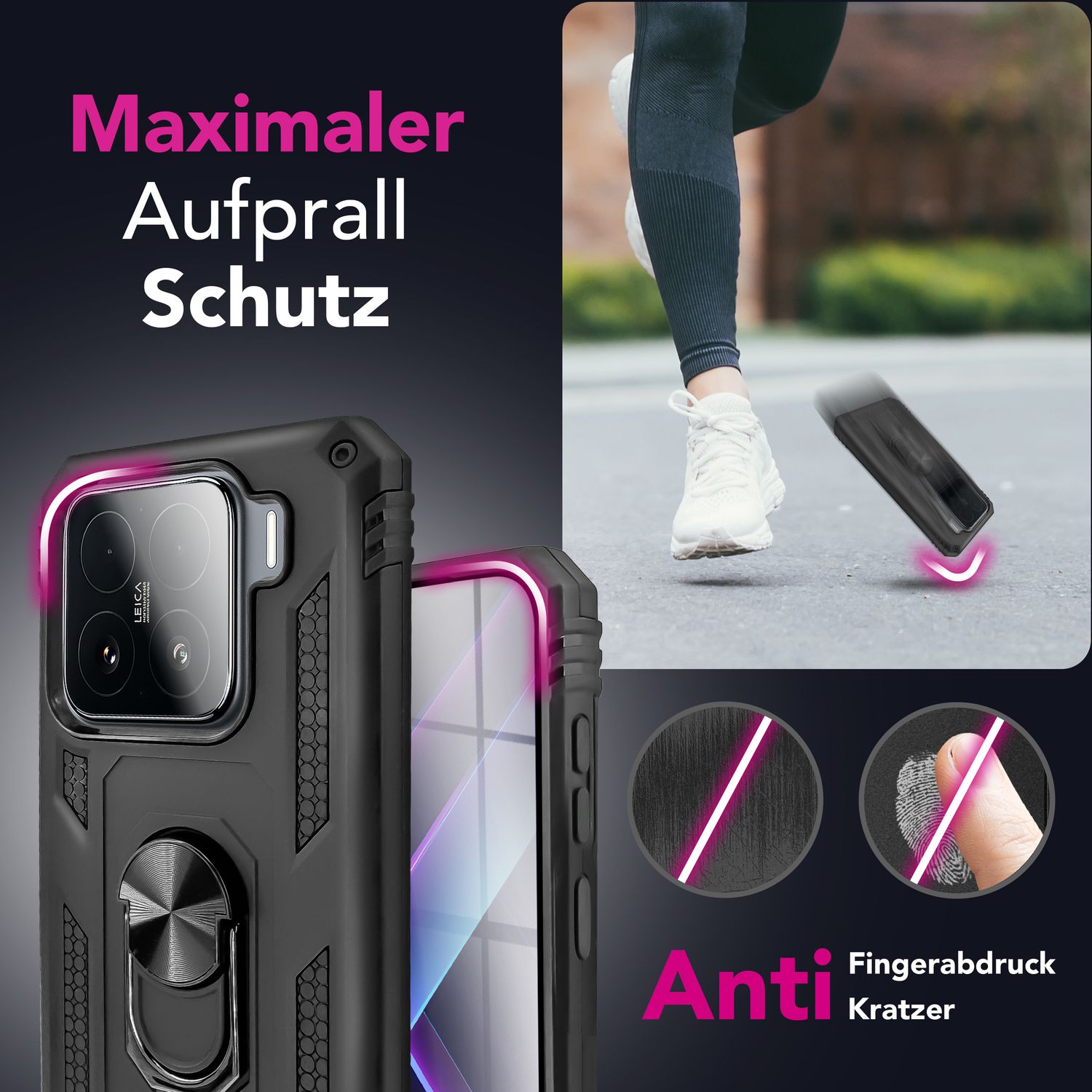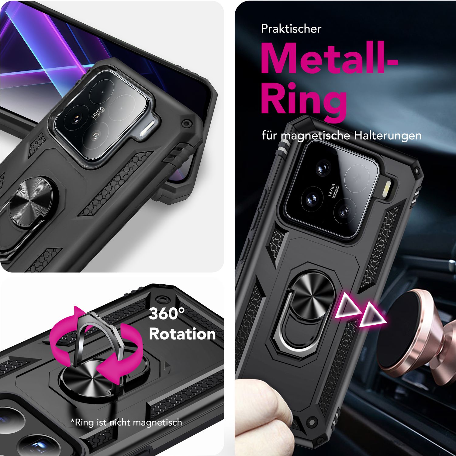 360° hringfestingin gerir snjallsímann þinn fjölhæfari en nokkru sinni fyrr: Notaðu hana sem afar stöðugan stand , fyrir sprengiheldan grip eða sem fullkomna viðbót við segulfestingu í bílnum þínum – þökk sé innbyggðum járnkjarna helst síminn þinn örugglega á sínum stað án þess að renna.