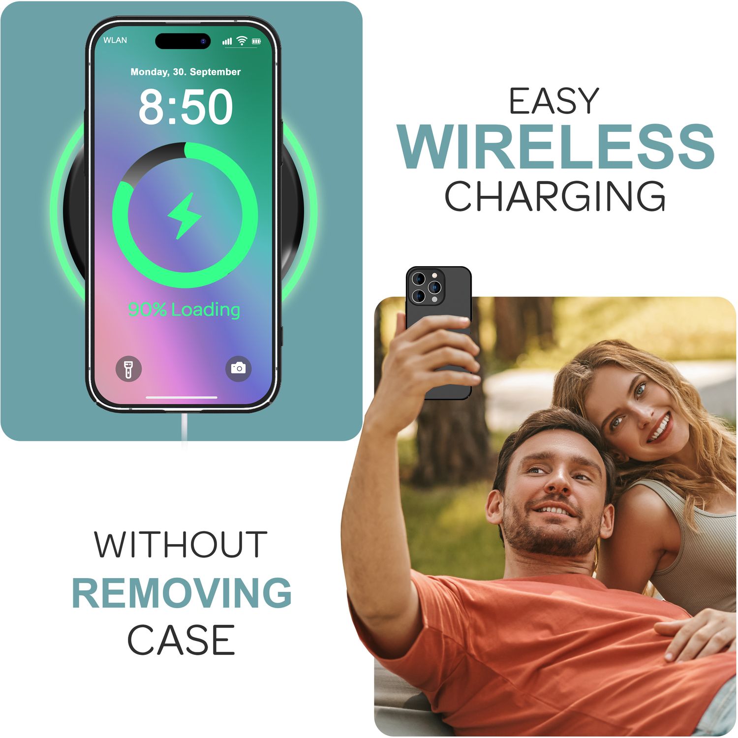 Örlítið upphækkaðir brúnir vernda myndavélina og skjáinn þegar síminn er settur á yfirborð. Þökk sé þráðlausri hleðslu er hulstrið enn þægilegt til daglegrar notkunar.