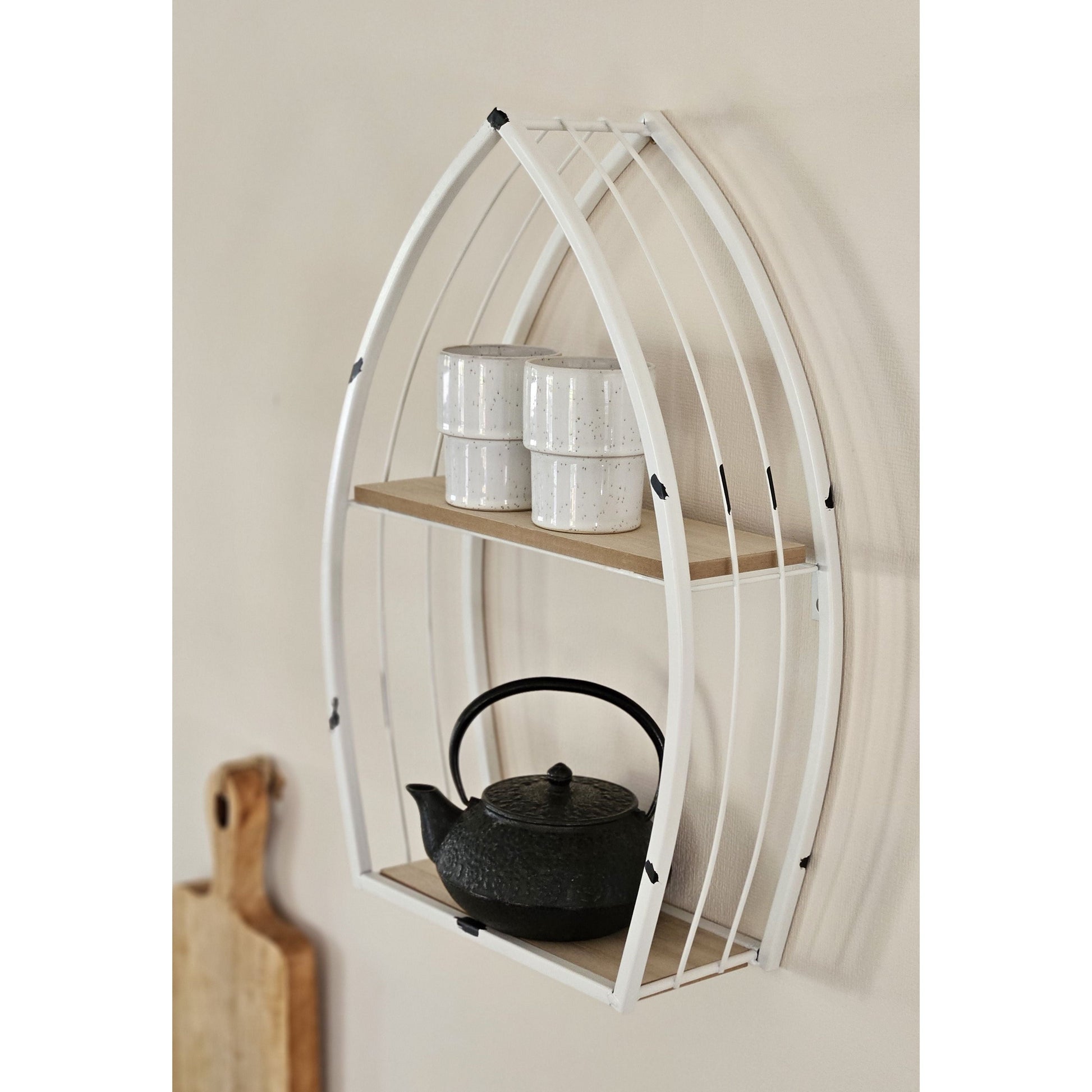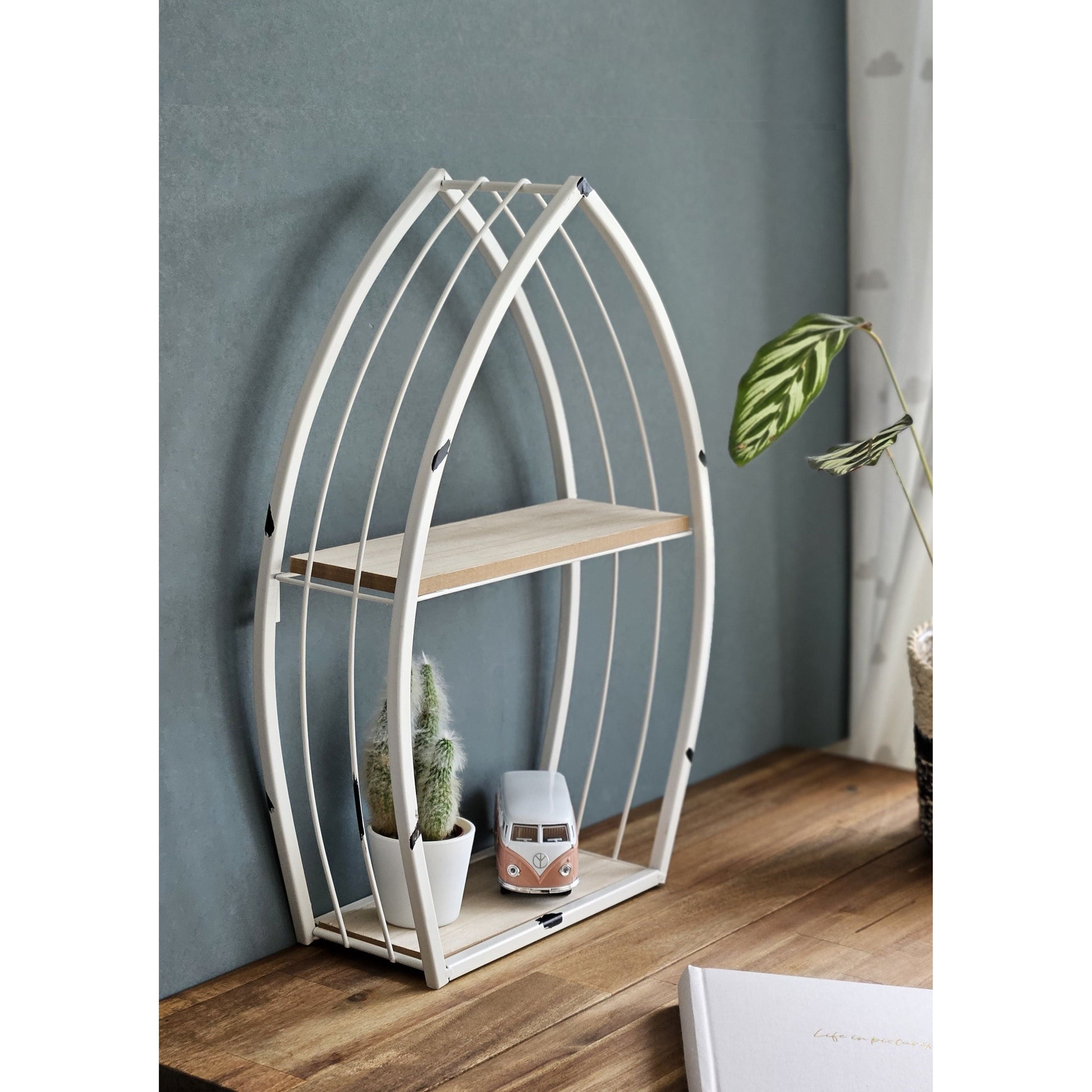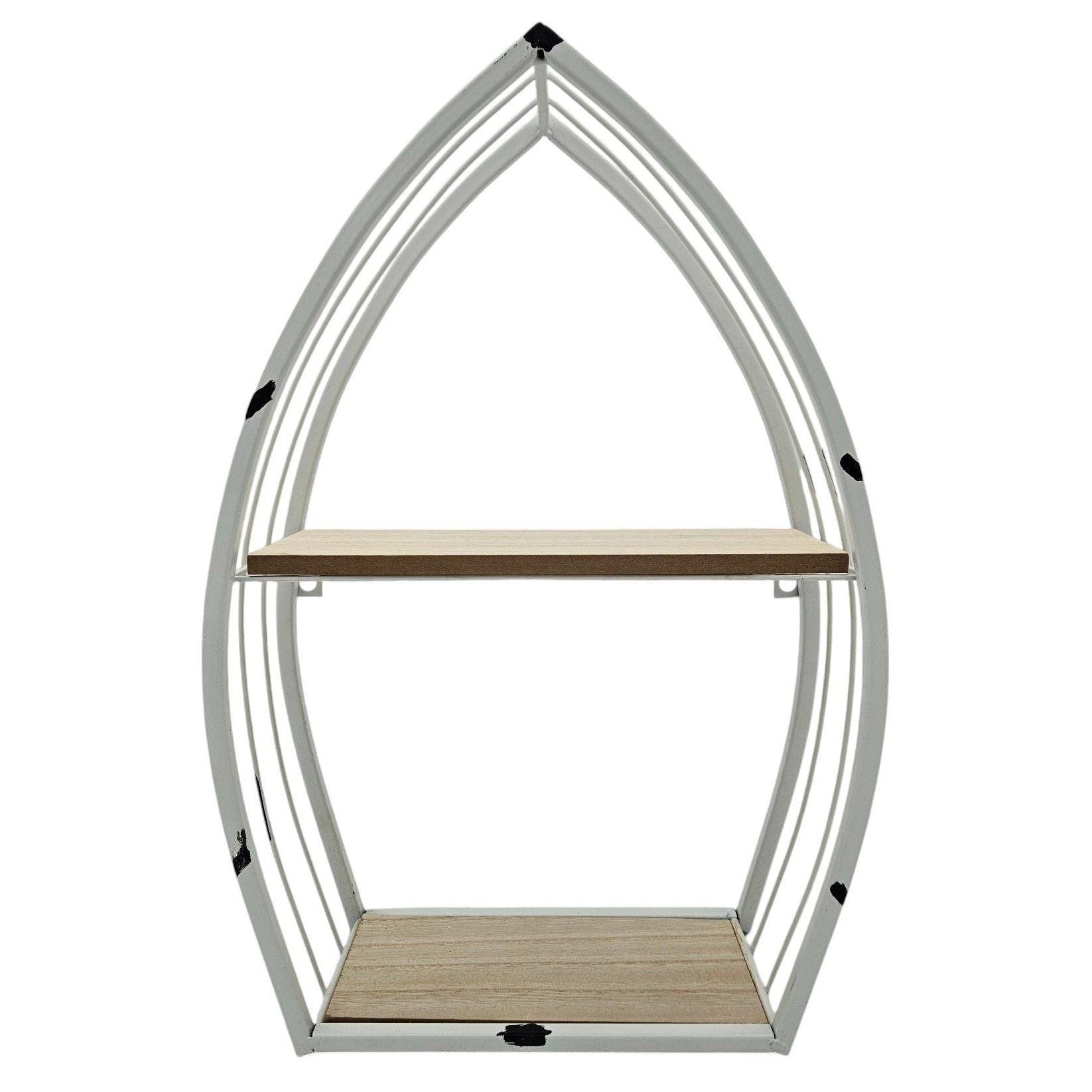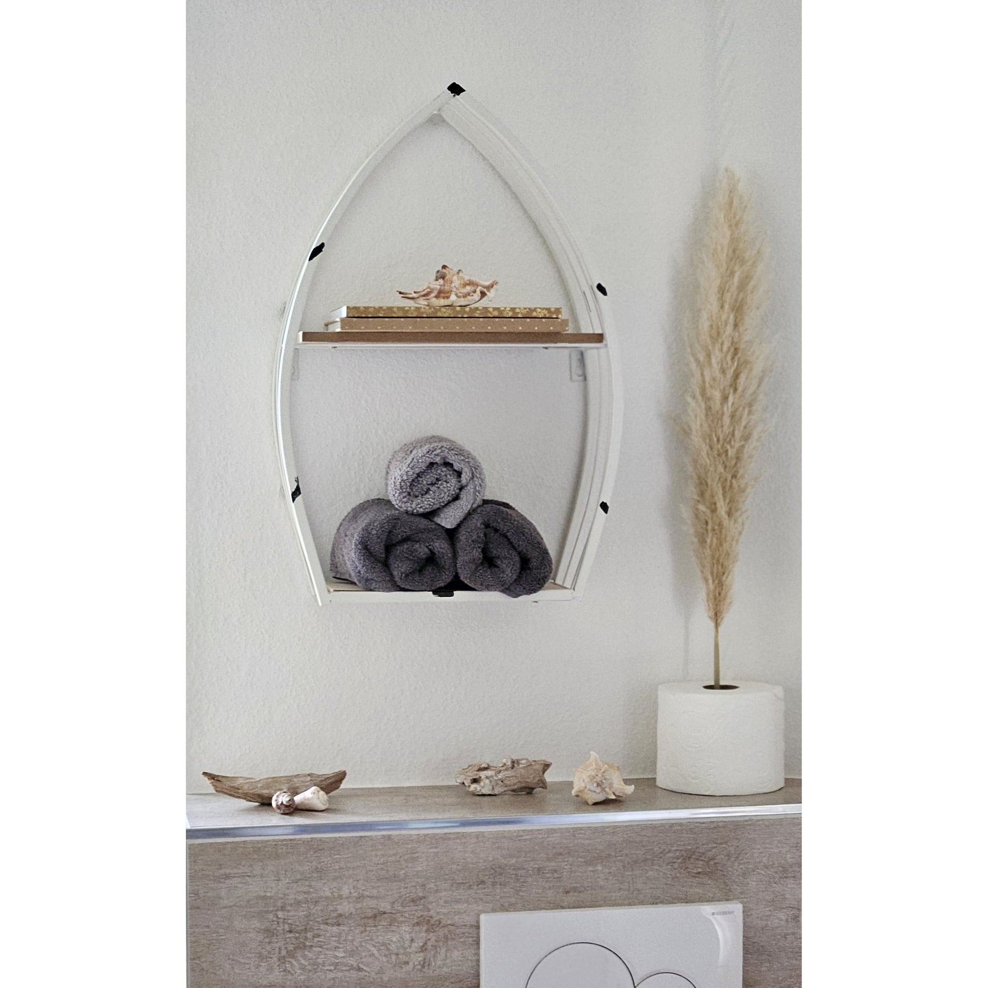 Das Bootsregal ist die perfekte Ergänzung für dein Zuhause! Mit seinem schlichten weißen Metallgestell und den Regalböden aus MDF-Holzstruktur bringt es einen dezenten maritimen Touch in jeden Raum. Ob als Wandregal oder zum Hinstellen, man kann es flexibel einsetzen. Mit den Beiden Regalböden bietet es viel Platz für Deko Artikeln, Gewürze, Parfüm, Schminke und vieles mehr .