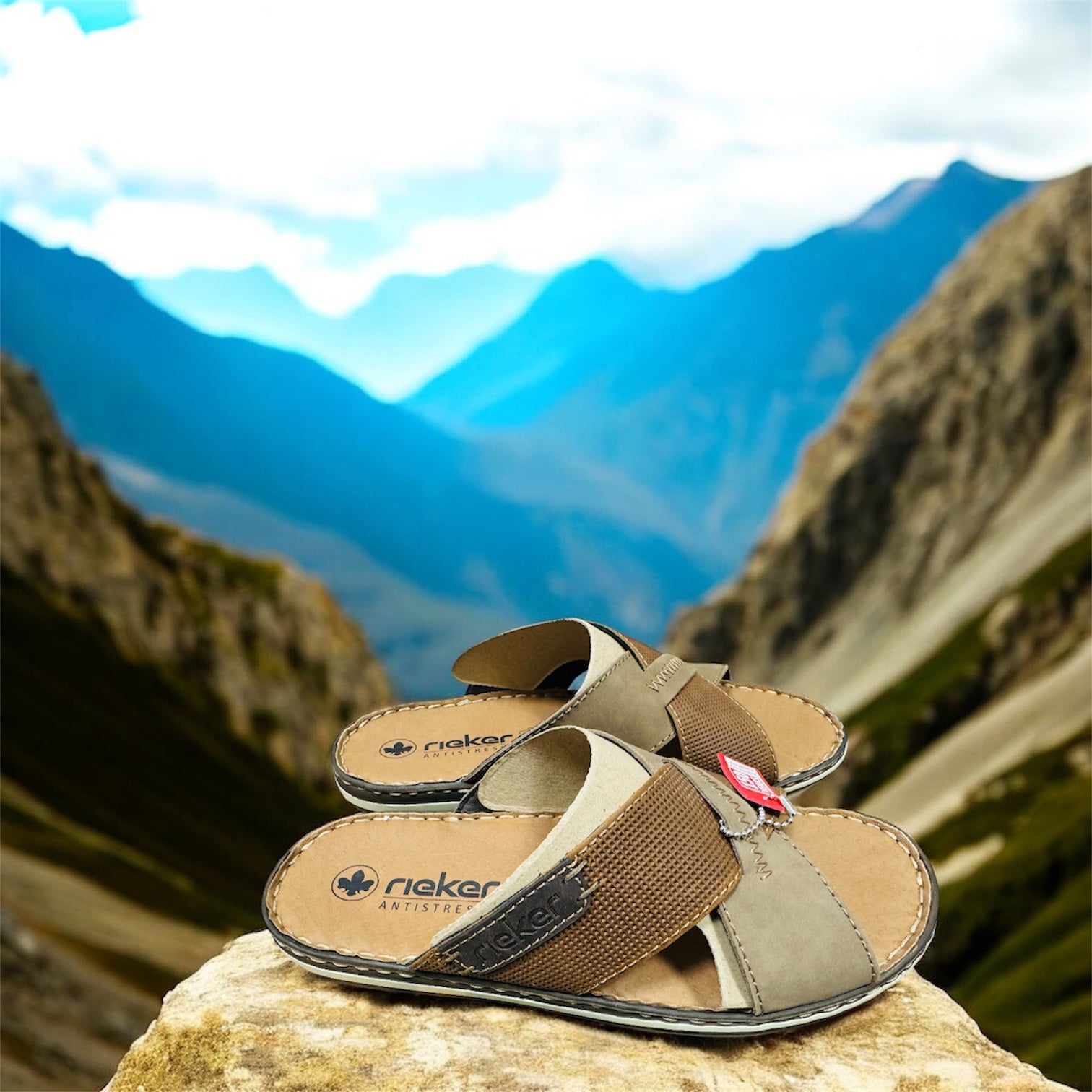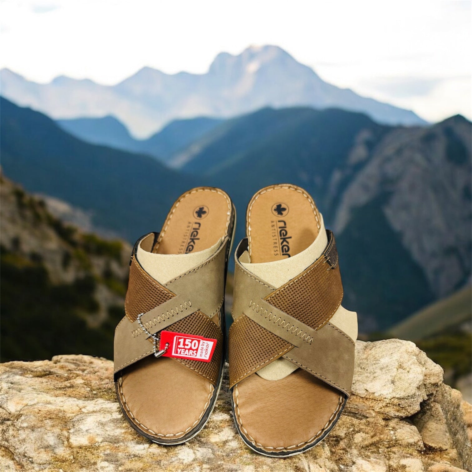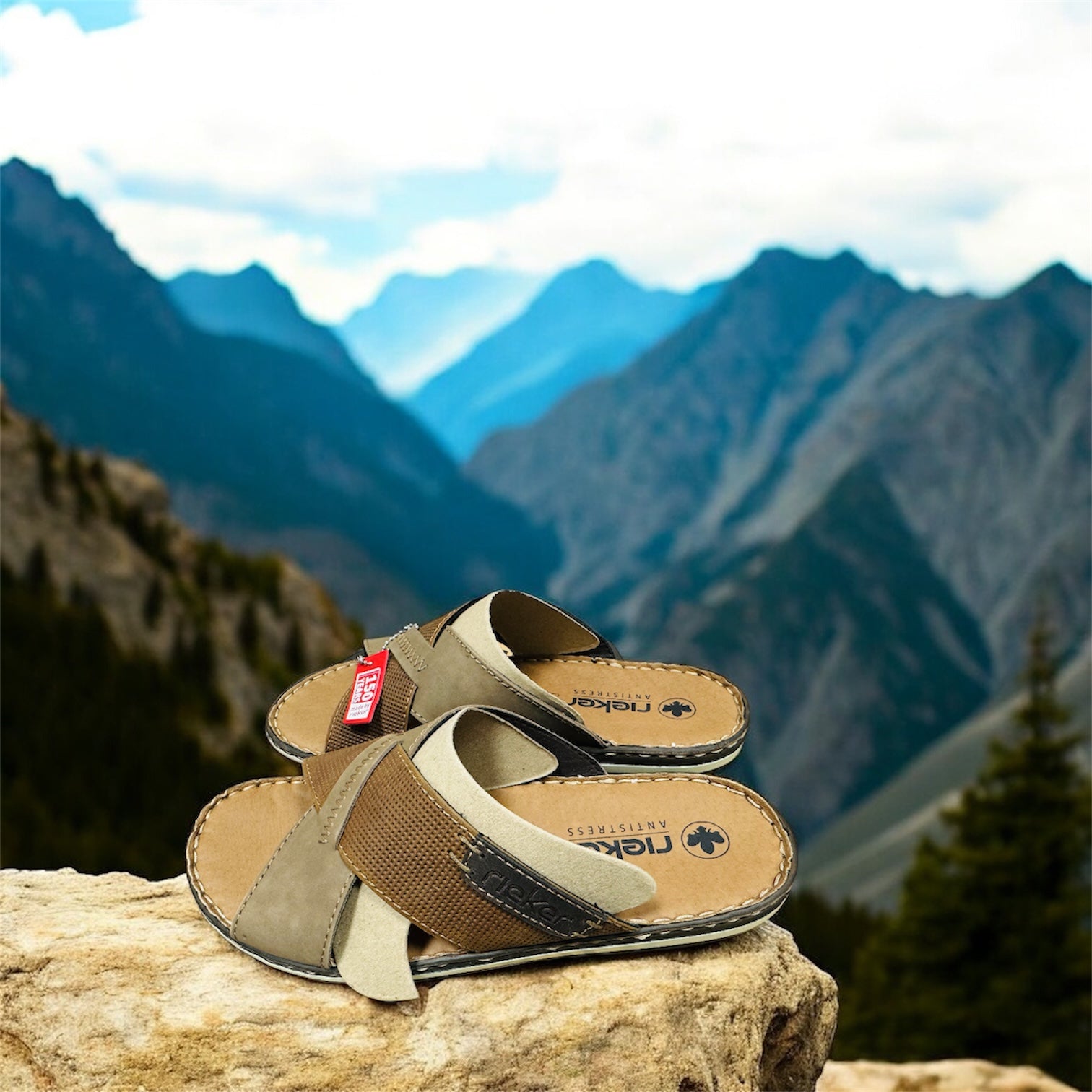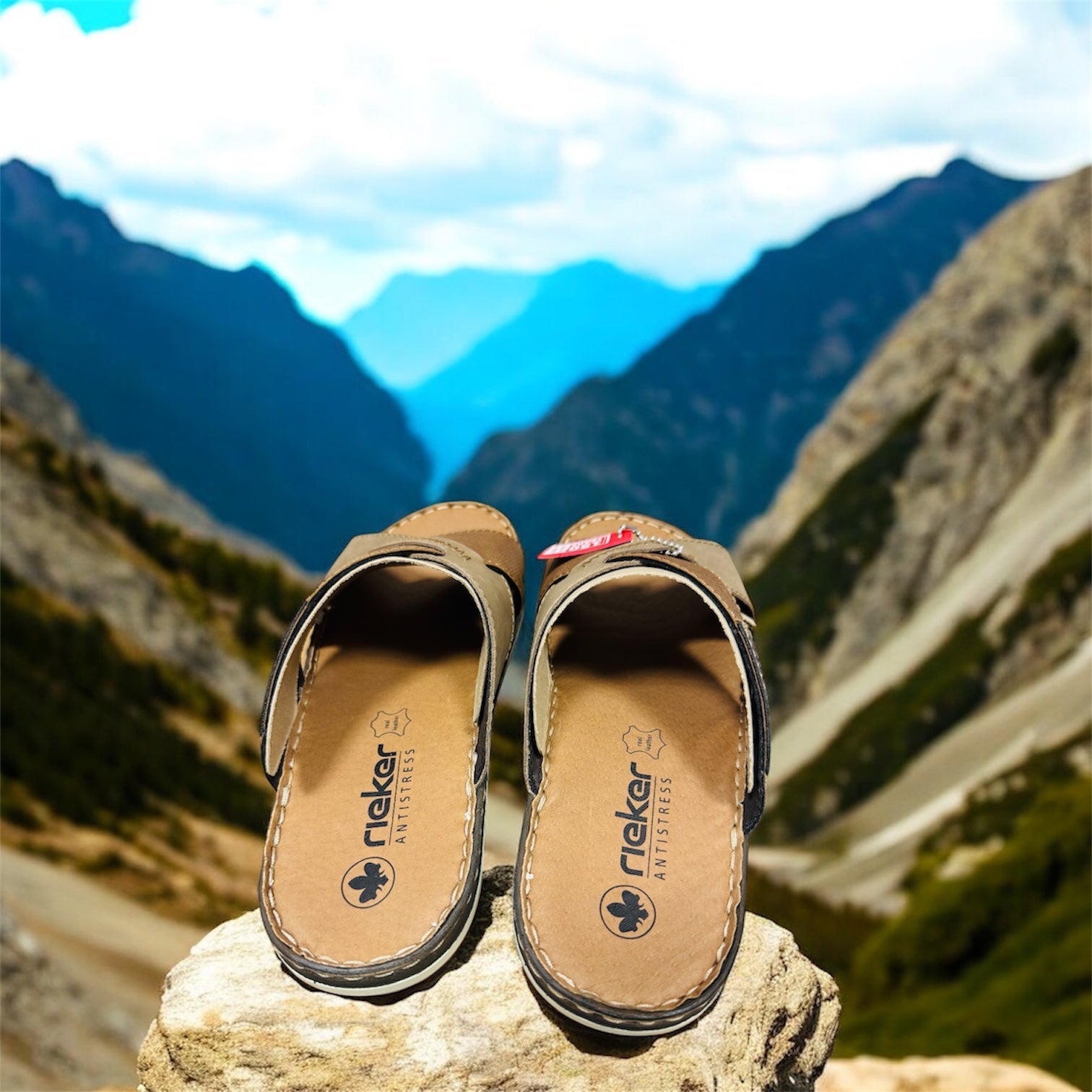 Að ganga í sólskini – eða allavega líður það þannig. Með þessum brúnu Rieker herraskóm verðurðu svalur og afslappaður á ferðinni. Fléttaða smíðin gerir skóna sterka og sólann sérstaklega sveigjanlegan, án þess að skemmast við skiptinguna upp í efri hlutann. Opna hönnunin gerir þá einnig fljótlega og auðvelda að renna sér í þá. Léttur, höggdeyfandi sólinn veitir þægilega og mjúka tilfinningu í hverju skrefi. Þægindabreiddin (G) gefur fótunum meira pláss inni í skónum. Stílhrein þægindi, Rieker stíll.
