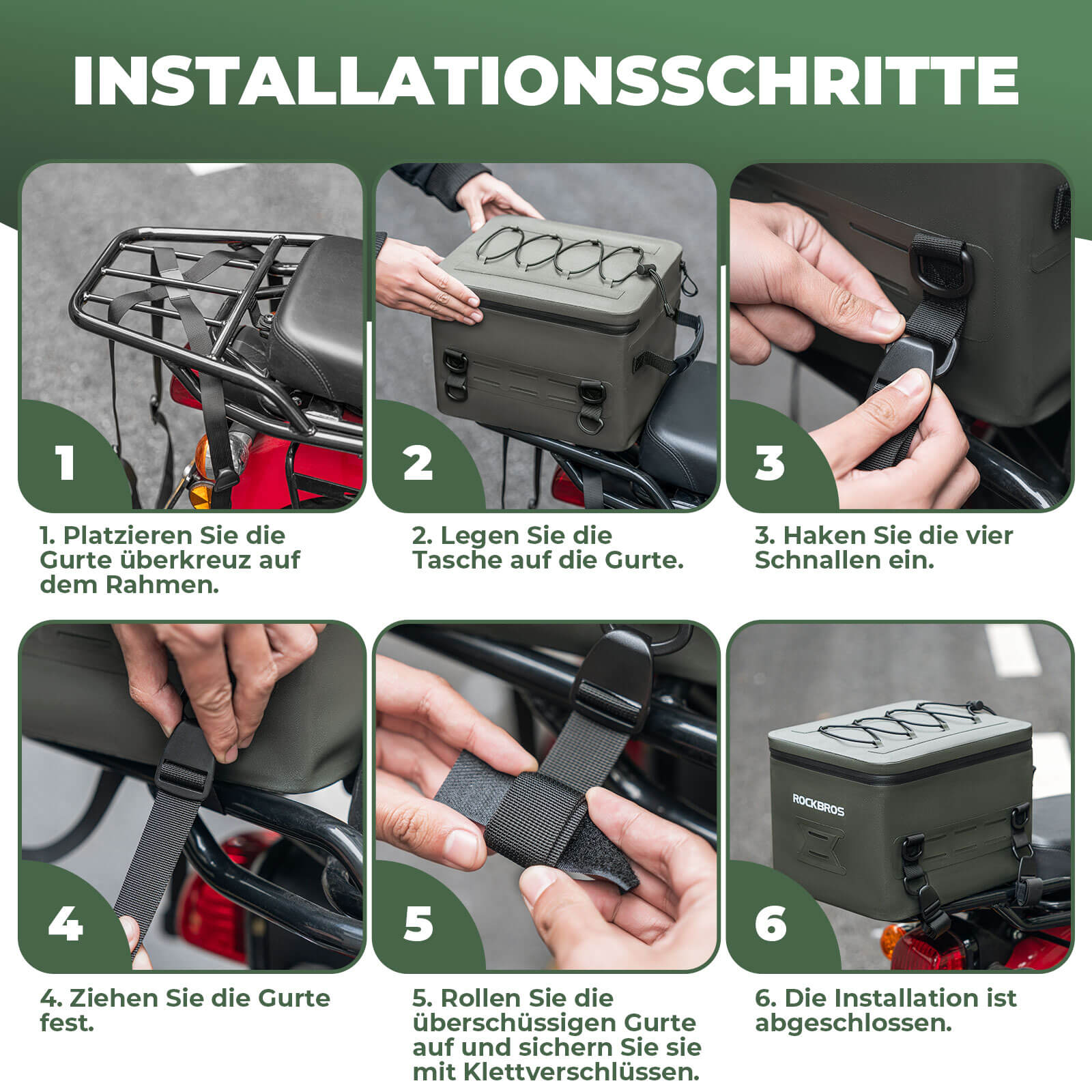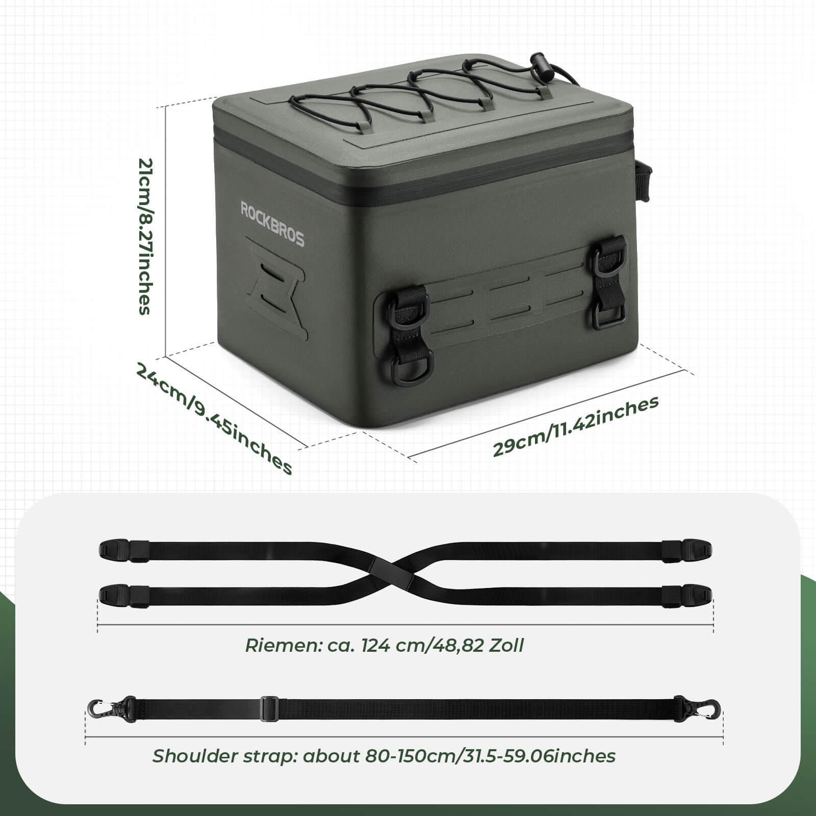 Vatnsheldur ROCKBROS mótorhjólataska með 13 lítra rúmmáli. Sterkt, slitsterkt efni, auðvelt að þrífa, stækkanlegt og tilvalið fyrir langar ferðir. Innifalið er axlaról fyrir þægilega burð.