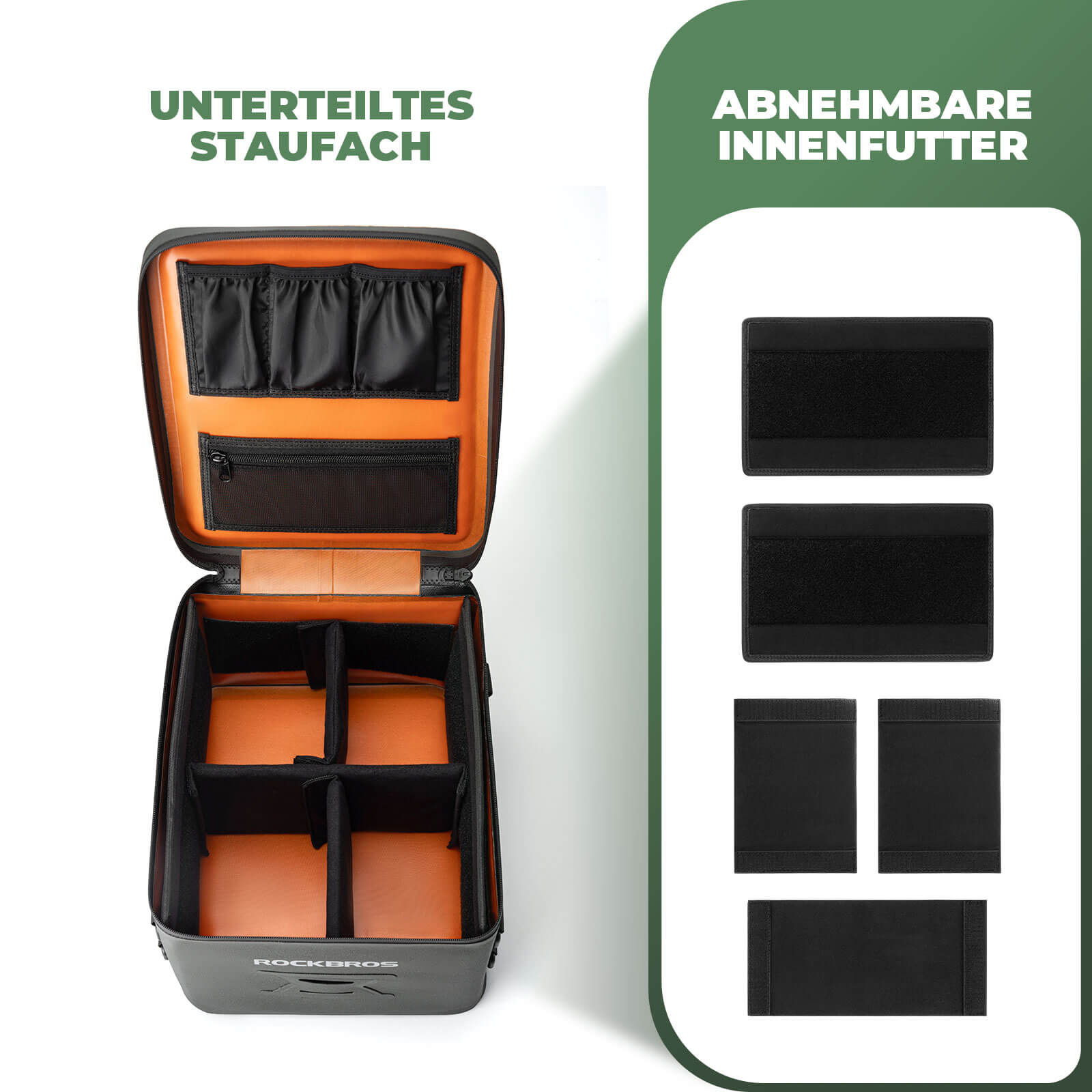 Taskan er úr endingargóðu efni með fjórum hliða rifjum sem helst stöðug og verndar innihaldið gegn kremingu. Hún býður upp á pláss fyrir síma og verkfæri og er stækkanleg ef þörf krefur.