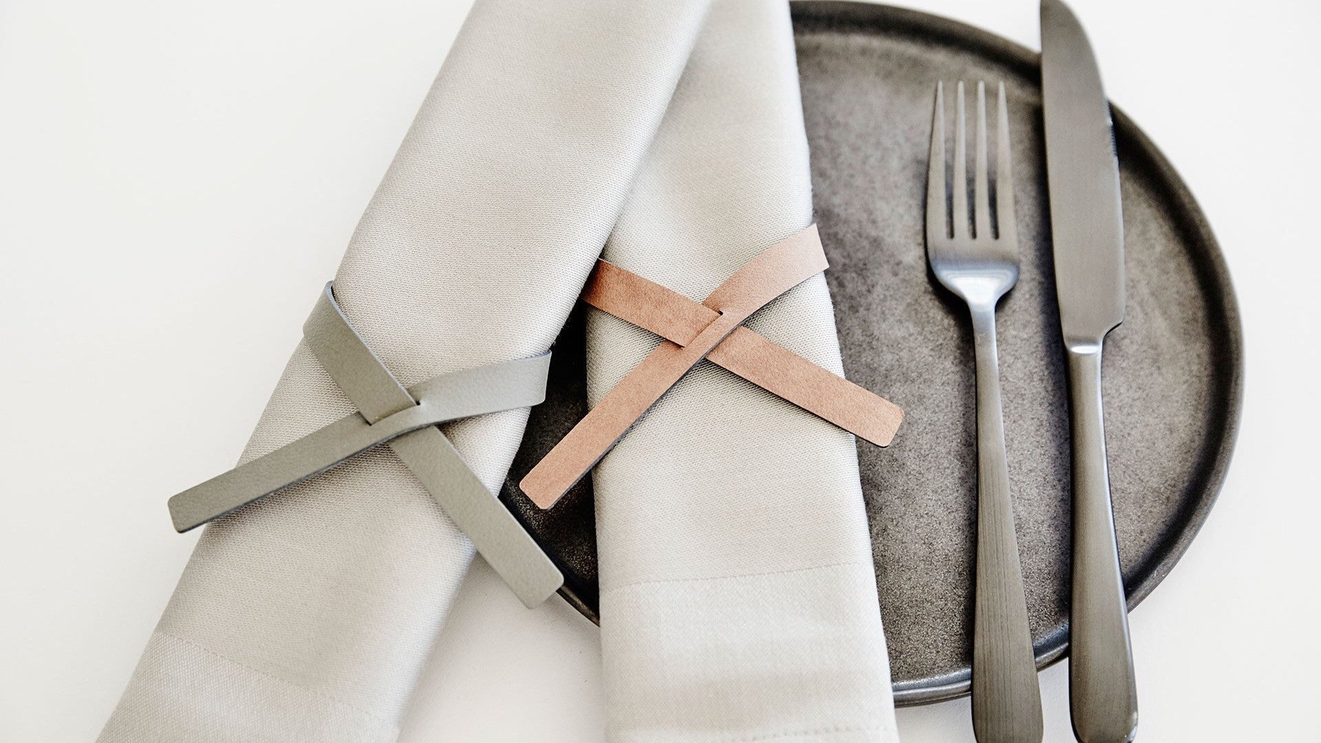 Passend zum Tischläufer und zu den Platzsets der Marke LindDNA ist diese mit zwei verschiedenen Farben gearbeitete Lederschlaufe aus recyceltem Leder im Angebot. Ideal als dekoratives Accessoire für Tischservietten oder zum Halten von Papierrollen geeignet.