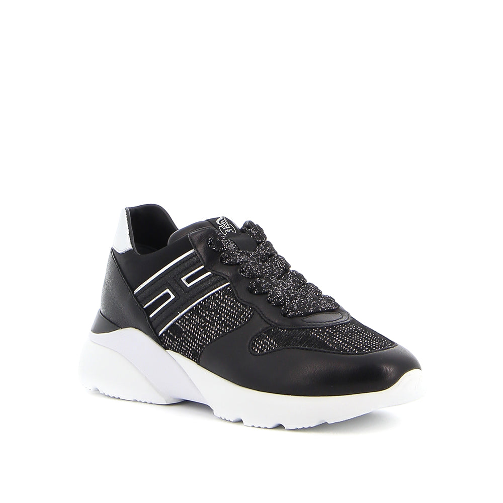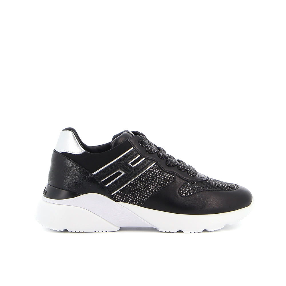 Step up your fashion game with HOGAN's H261 black leather sneakers. The shiny black fabric and silver inserts add a sleek and modern touch to this classic shoe. The removable insole provides ultimate comfort, while the maxi white rubber sole adds height and style. These sneakers are perfect for any occasion and will make you stand out from the crowd. Get your pair today!