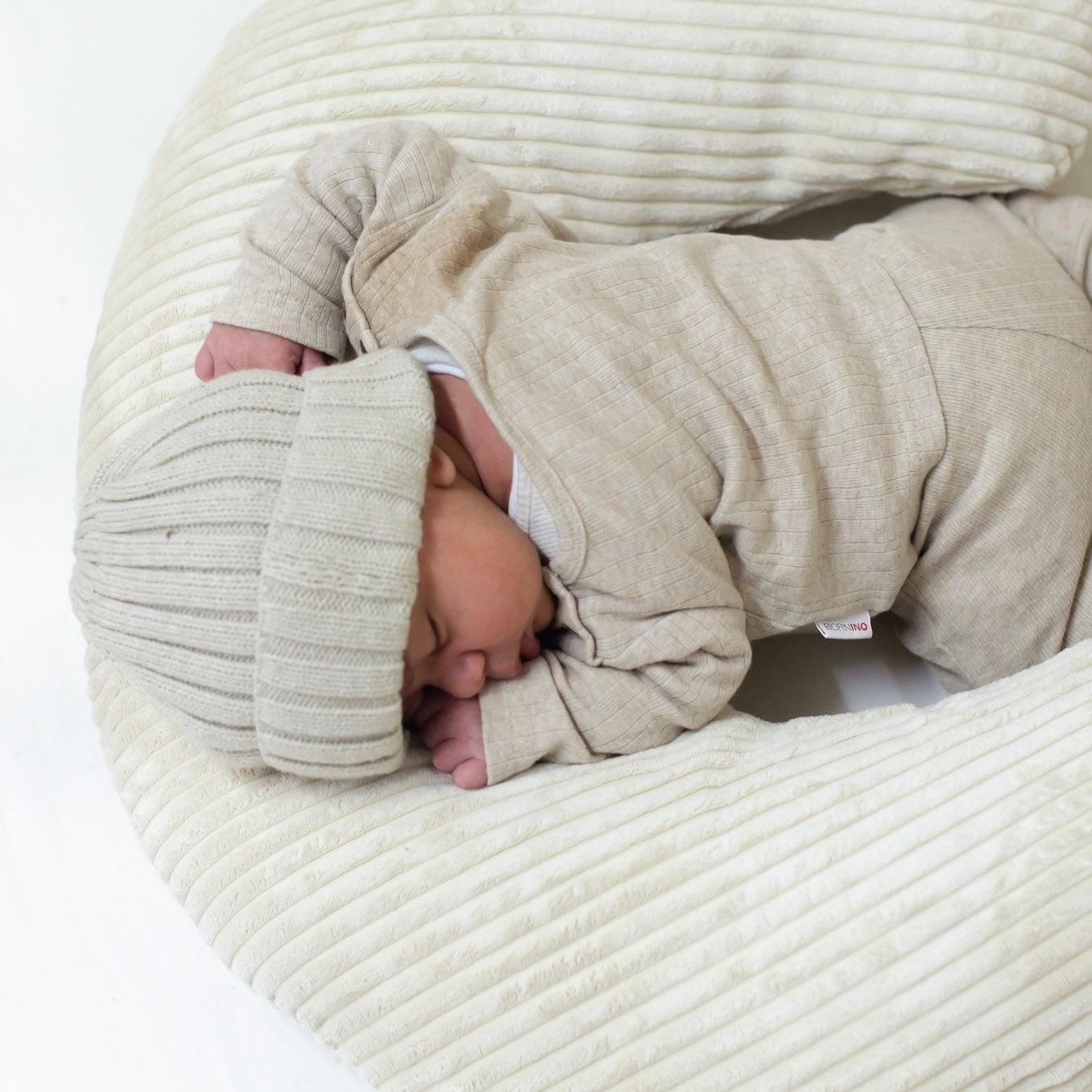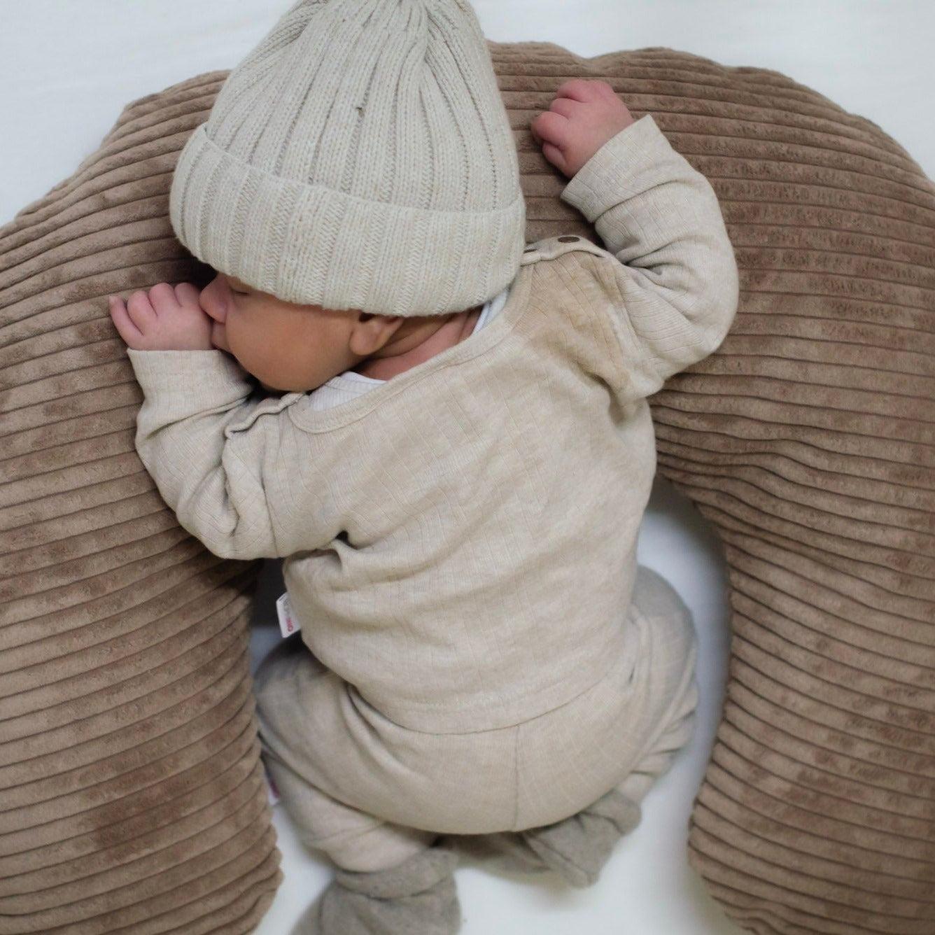 Die Halbmond-Form passt sich optimal an Körper & Haltung an, während das kuschelig-weiche Cord-Material hautfreundlich und gleichzeitig stilvoll ist. Auch für dein Baby ist das Kissen vielseitig nutzbar: als Stütze beim Üben der Rückenlage oder beim Sitzen.