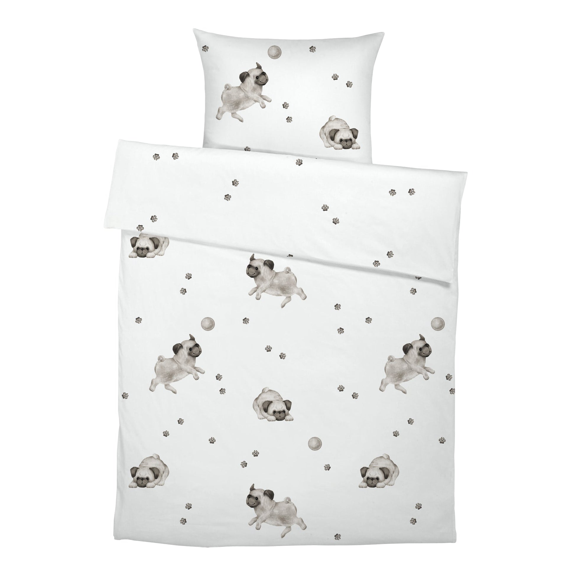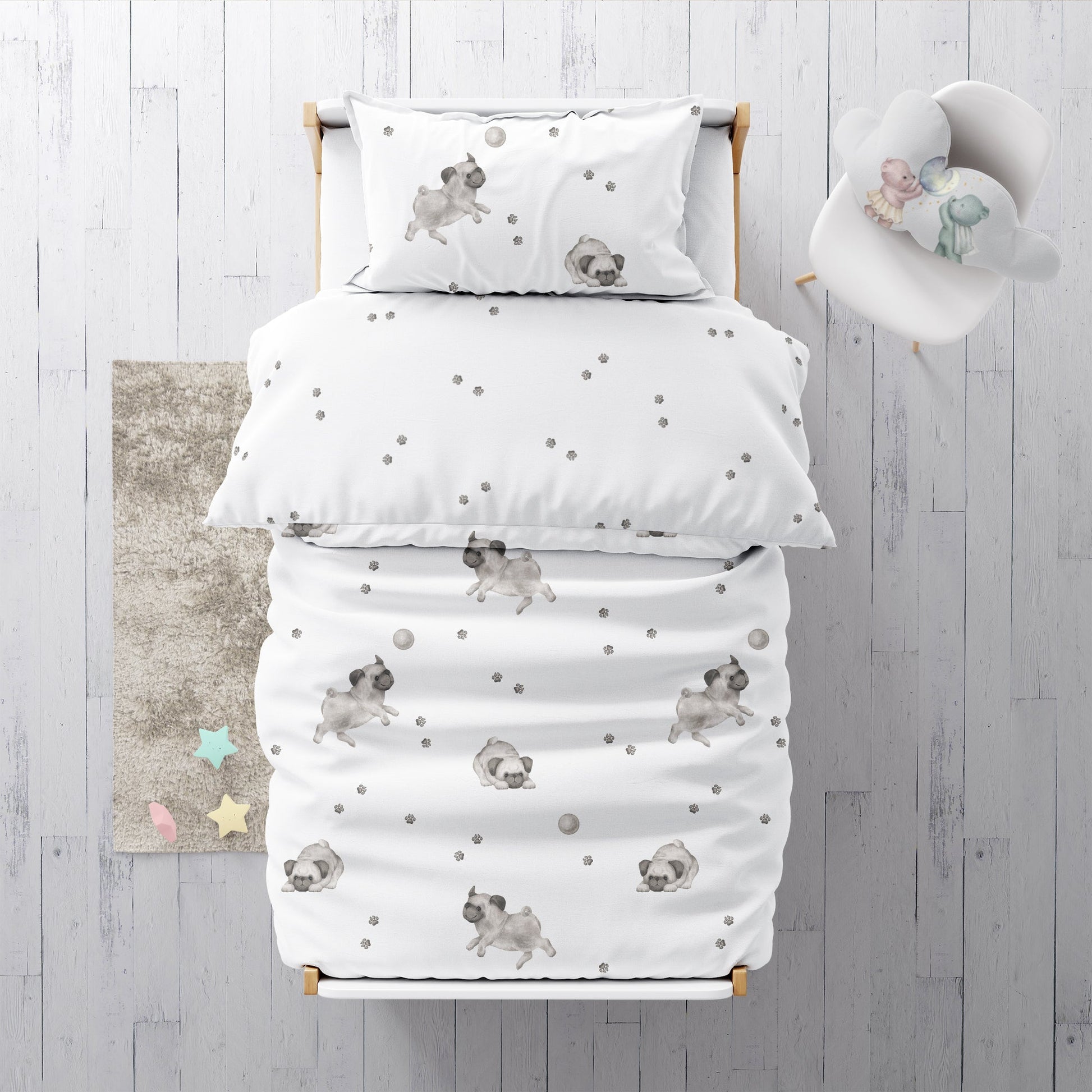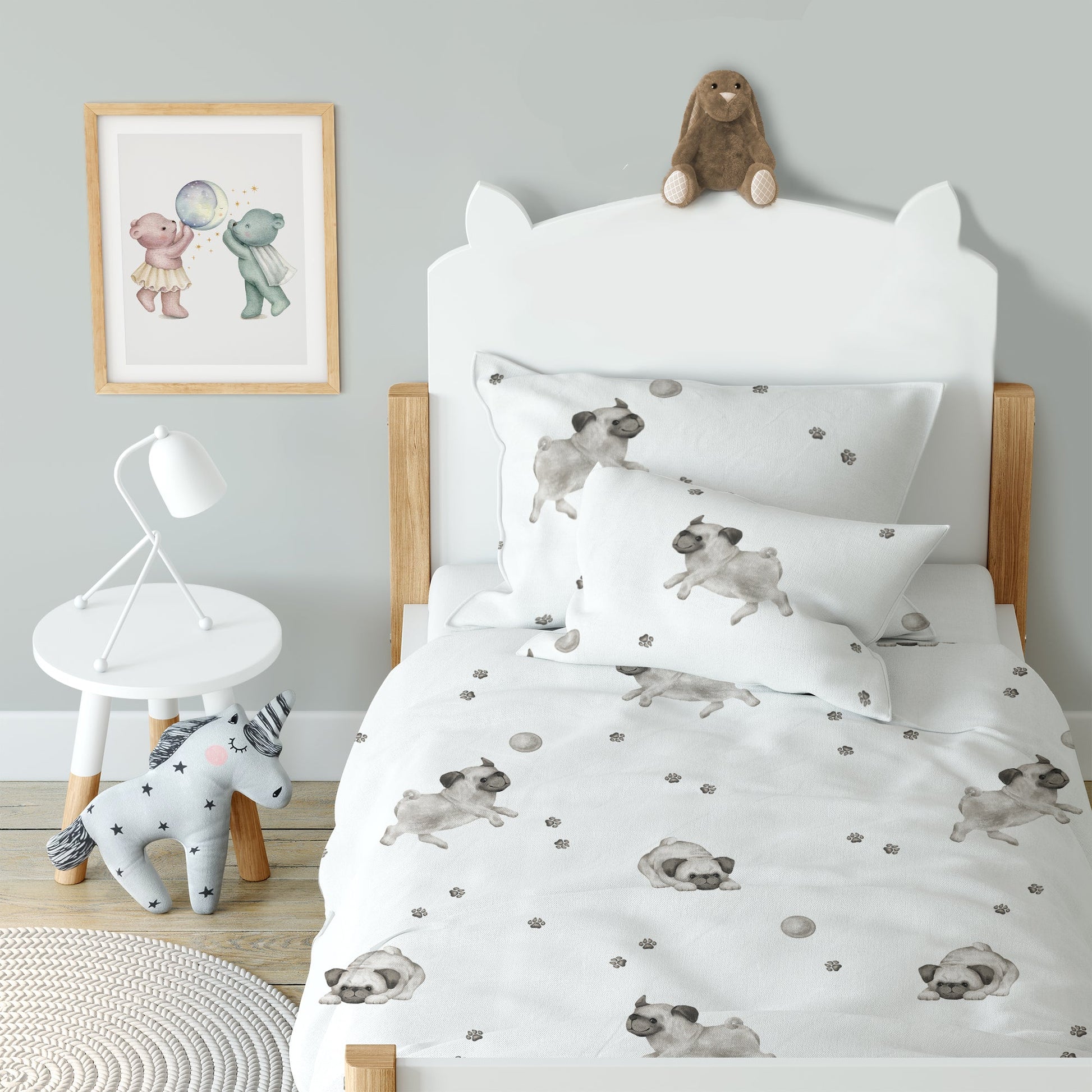 Sæta mopshundategundin: Sökkvið ykkur niður í töfrandi heim þar sem yndislegir mopshundar og fallega settir loppuför ráða ríkjum. Þetta yndislega rúmföt, úr hreinni bómull, tryggja þægilegt svefnumhverfi og veita barninu þínu mjúkt og öruggt svefnrými. Heillandi hönnunin með leiknum mopshundum býður ekki aðeins upp á notalegar nætur heldur einnig lítil ævintýri og hugmyndaríkar sögur. Fullkomið fyrir litla hundaunnendur og forvitna landkönnuði!