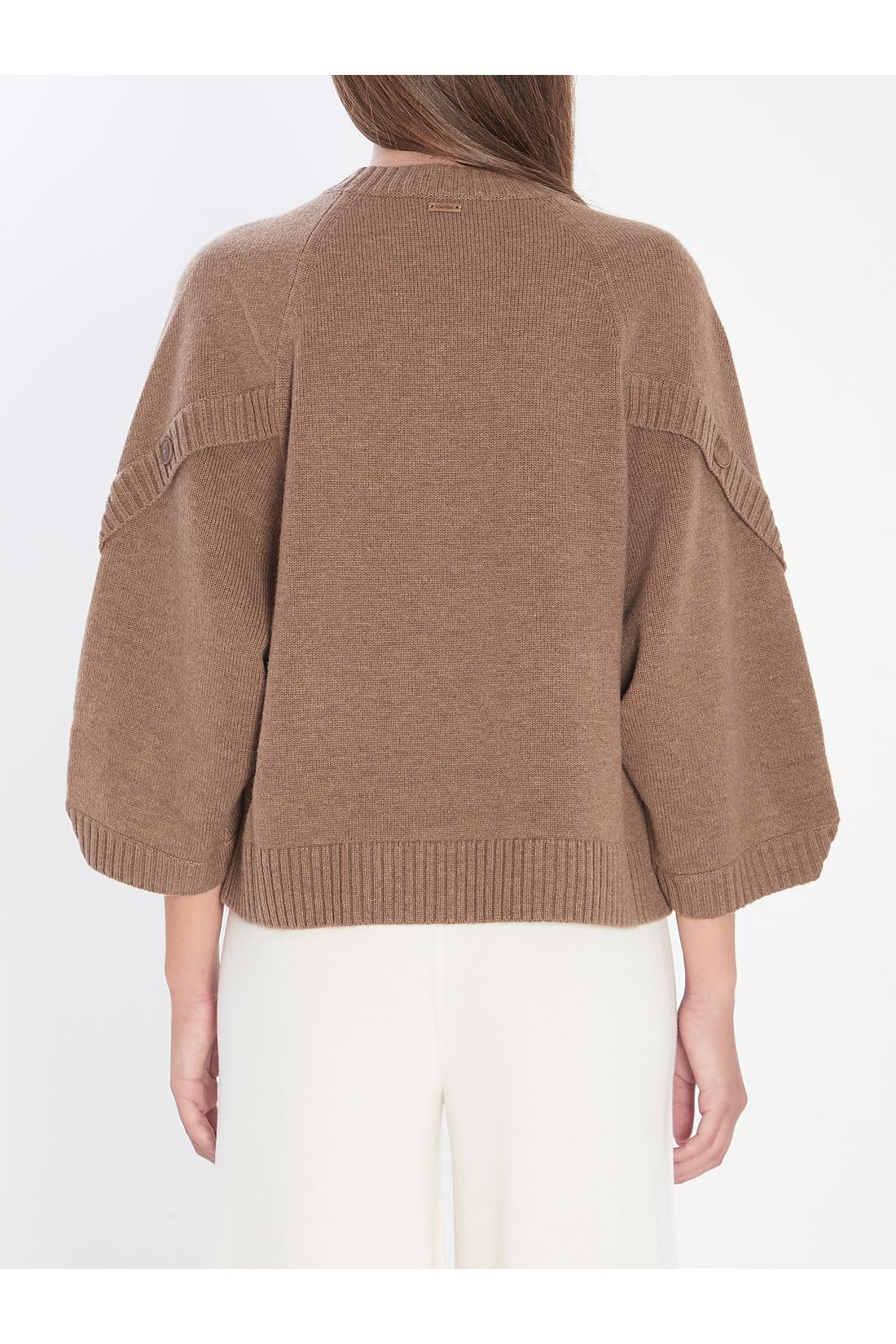 Sweater in beige wool and cashmere plain knit. Features a crew neckline, crossover detail, wide raglan sleeves with horn logo buttons, personalized tag at the back of the neck, ribbed edges. Slightly oversized fit.