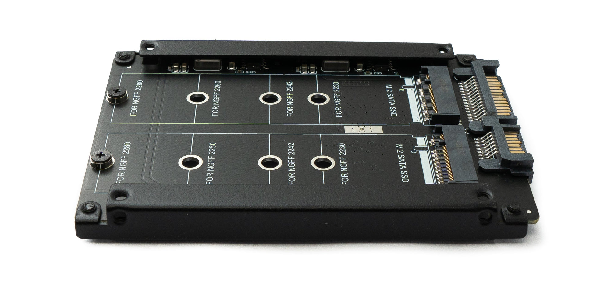 SYSTEM-S NGFF B+M lykil millistykkið gerir kleift að tengja tvær M.2 NGFF SSD diska (B eða B/M lykil) við 2,5 tommu SATA harða disk. Það er tilvalið til að samþætta M.2 SSD diska í kerfi sem styðja aðeins 2,5 tommu SATA tengingar.
