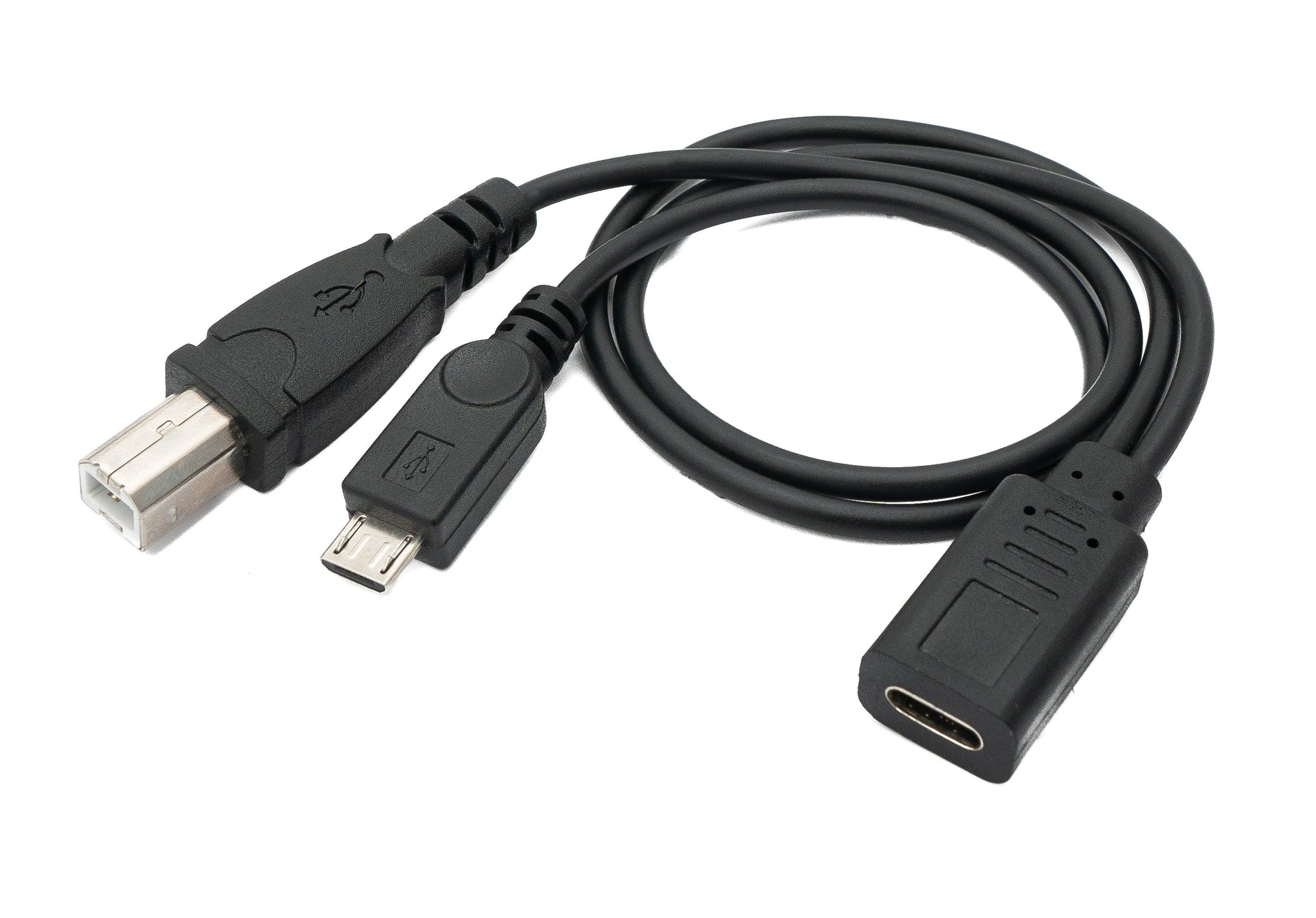 - Tengir USB 3.1 Type C kvenkyns tengi við USB 2.0 Micro B karlkyns tengi og USB 2.0 Type B karlkyns tengi.