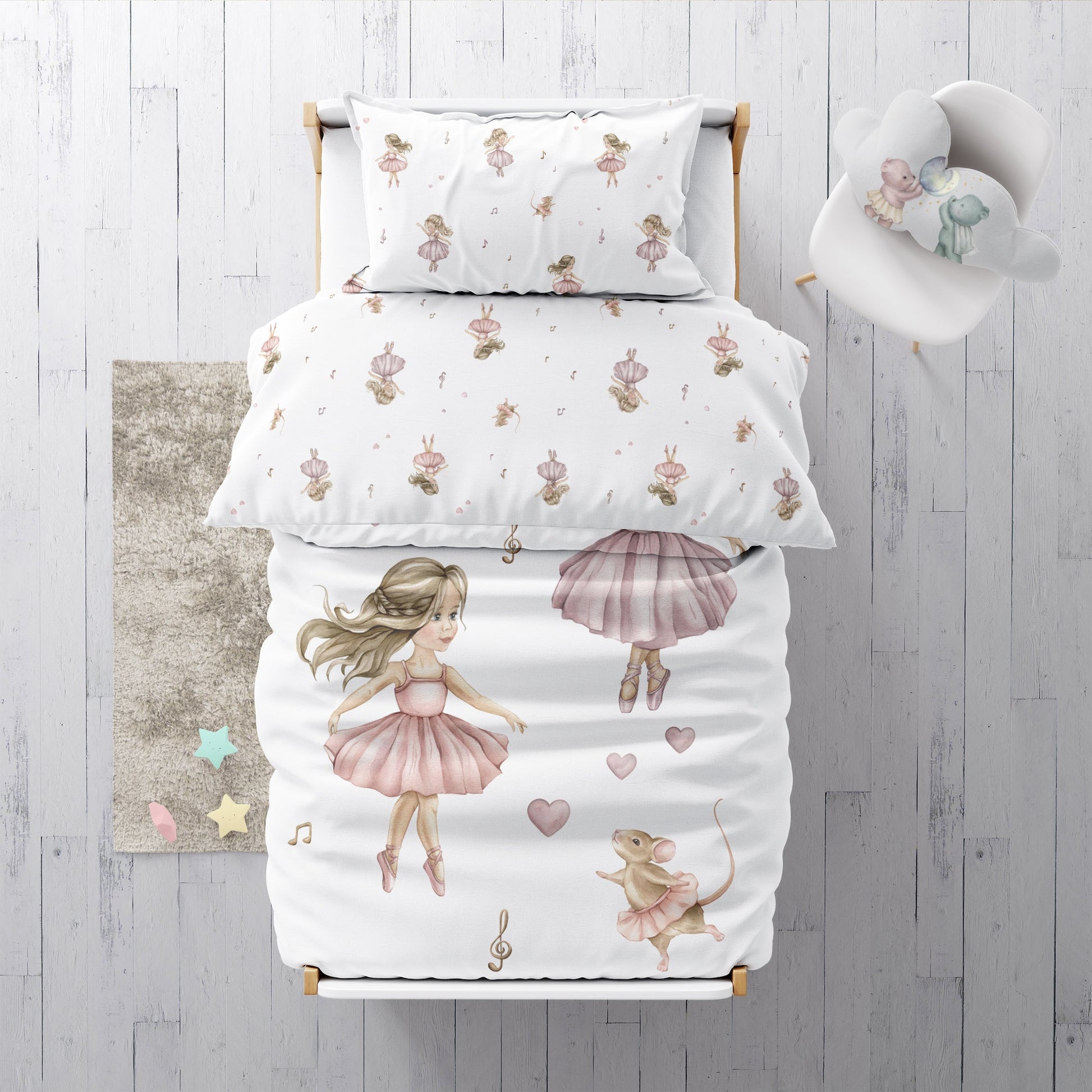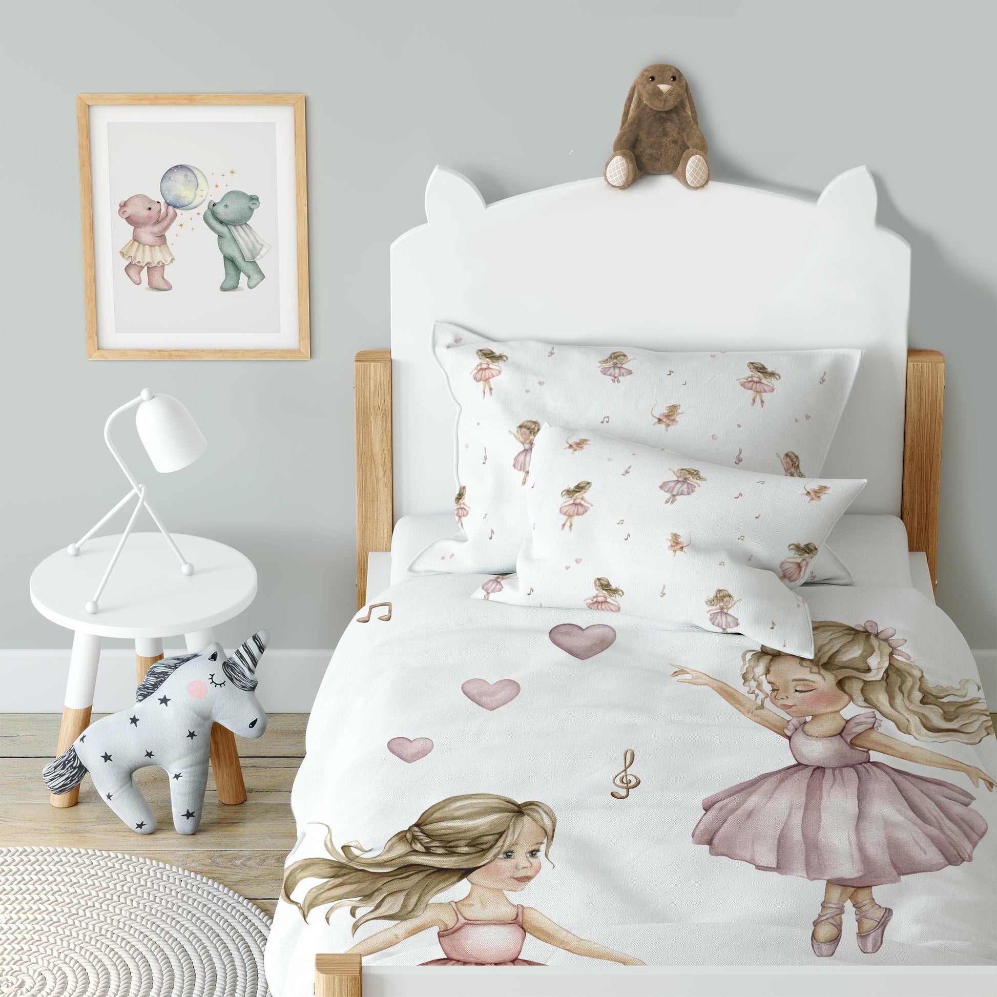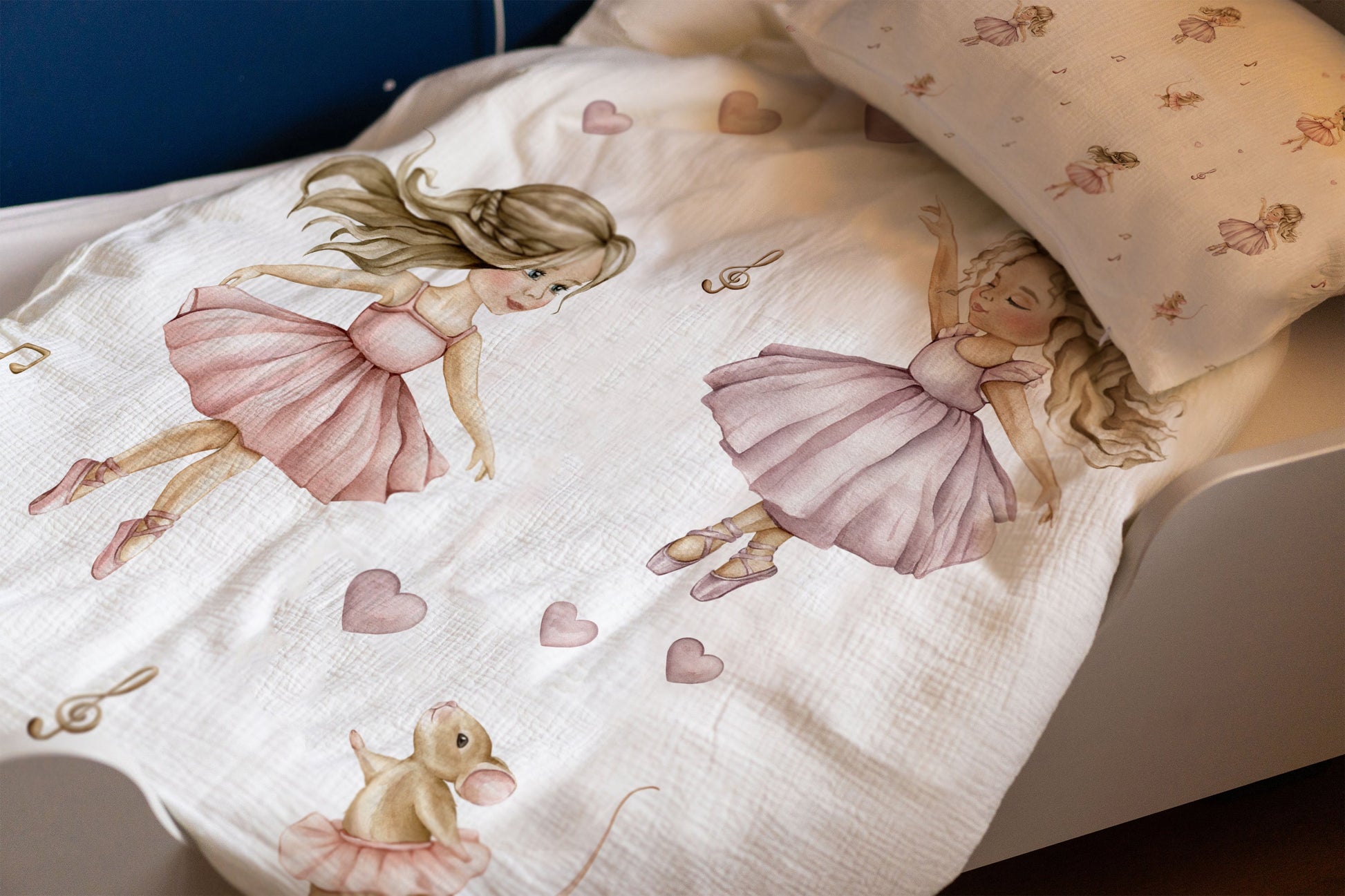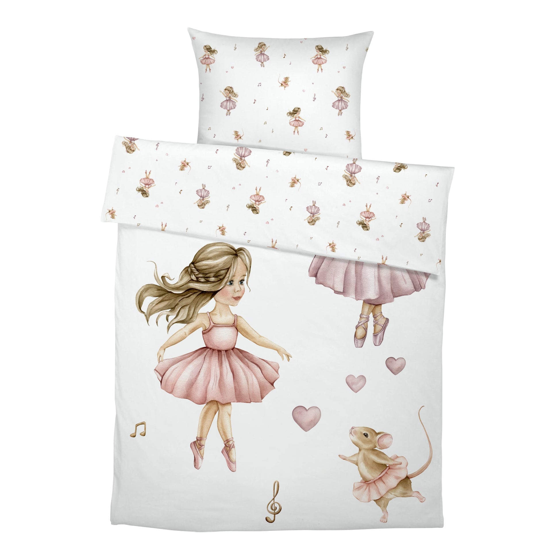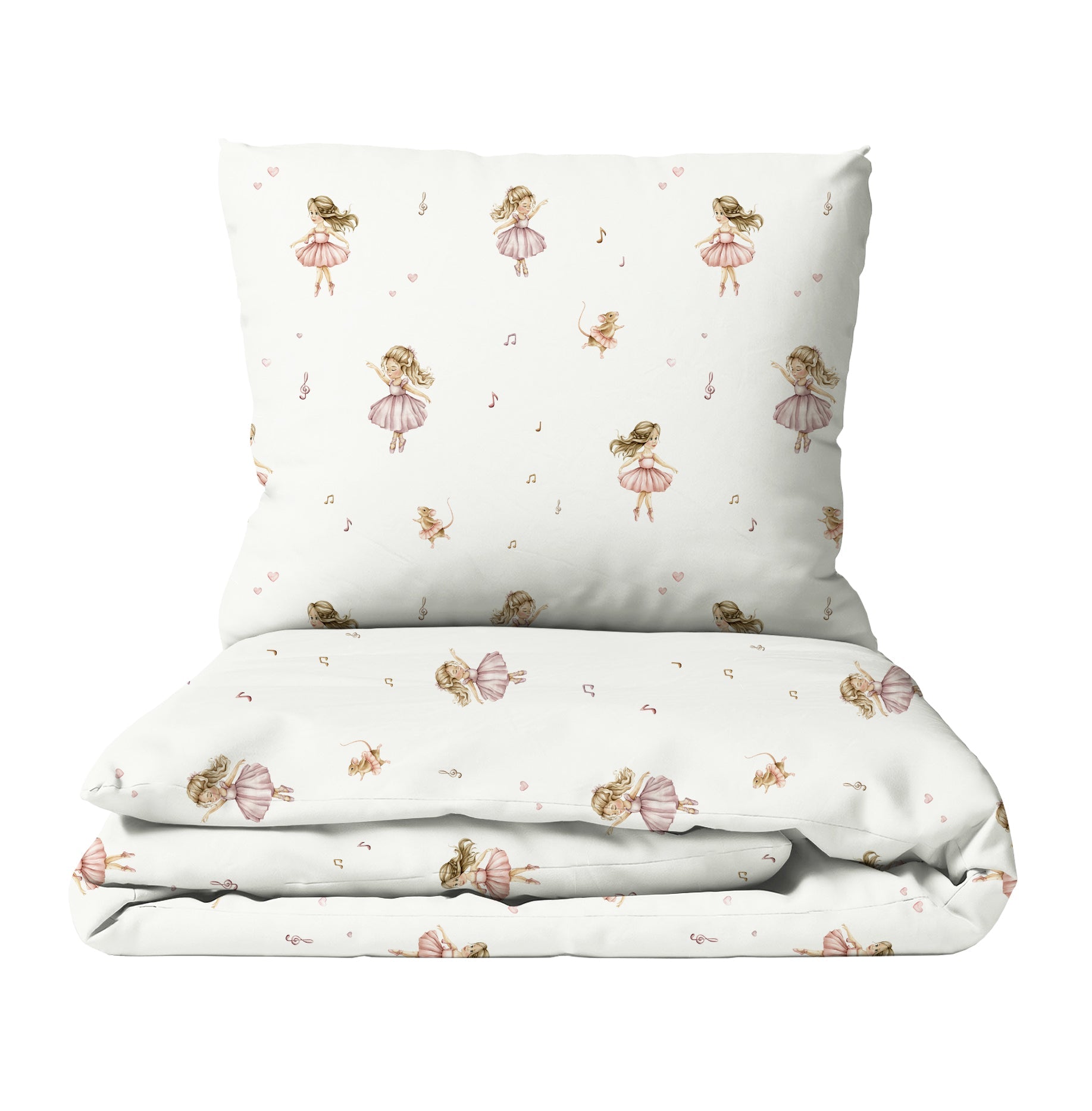 Dansarar: Uppgötvaðu töfrandi heim fullan af glæsilegum dansurum sem taka glæsilegar stellingar. Þessi fallega rúmföt, úr hreinni bómull, skapa notalegt svefnumhverfi og tryggja bestu mögulegu svefnskilyrði. Flókin hönnun með glæsilegum dansurum hvetur til draumkenndra nætur og hugmyndaríkra sagna. Fullkomið fyrir litla ballettunnendur og skapandi draumóra!