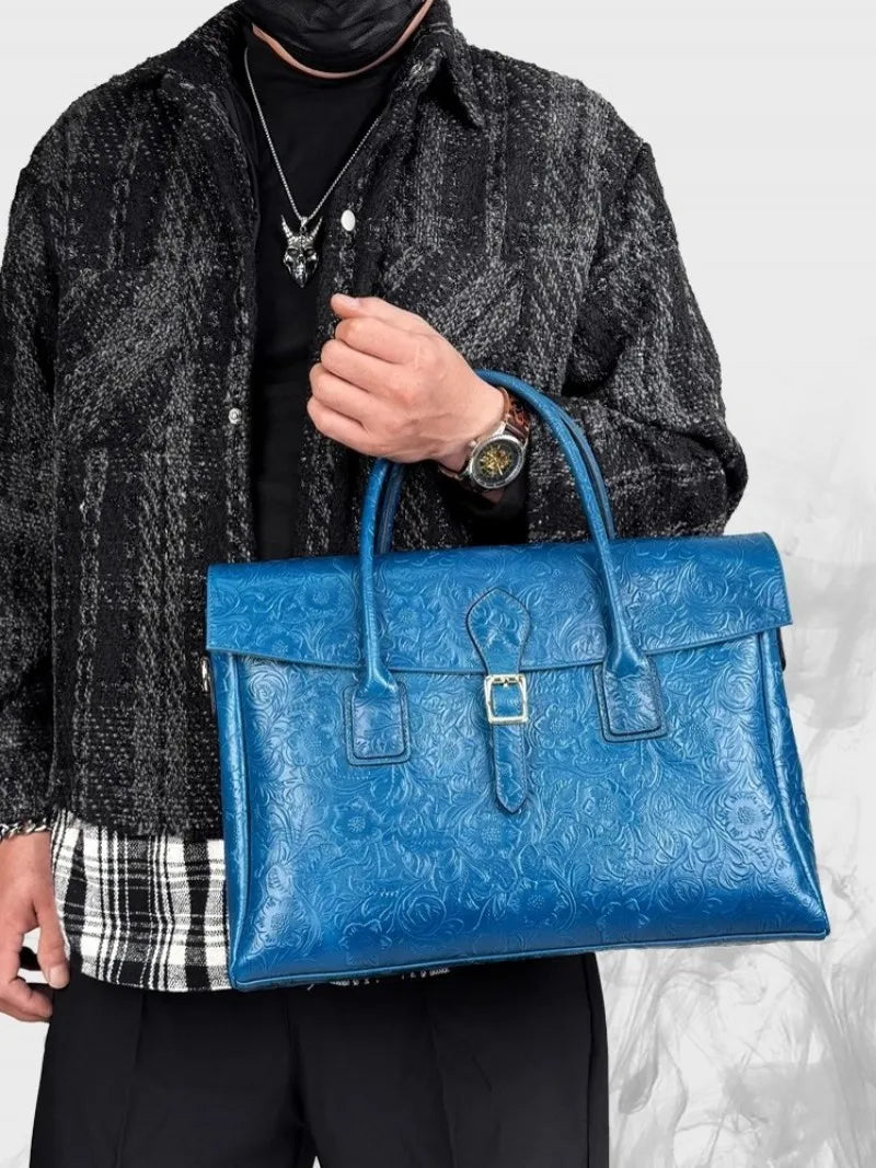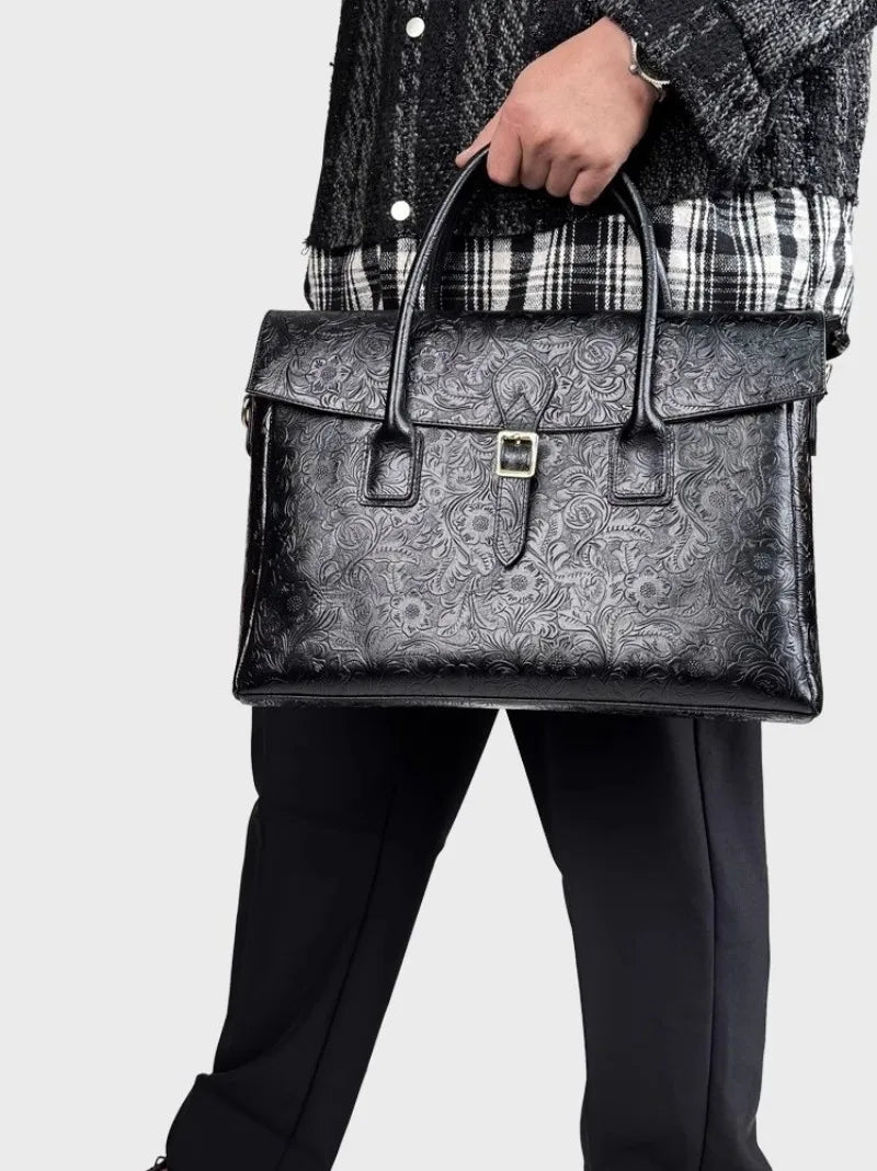 LITTLE BLACK COW vintage-handtaskan er djörf tjáning á handverki, þar sem hún sameinar styrk úr úrvals ekta leðri og glæsileika blómamynstraðrar prentunar . Þessi uppbyggða taska er hönnuð fyrir nútímamanninn sem metur bæði virkni og form og færist auðveldlega frá viðskiptalegum tilefni til frjálslegra tilefnis.