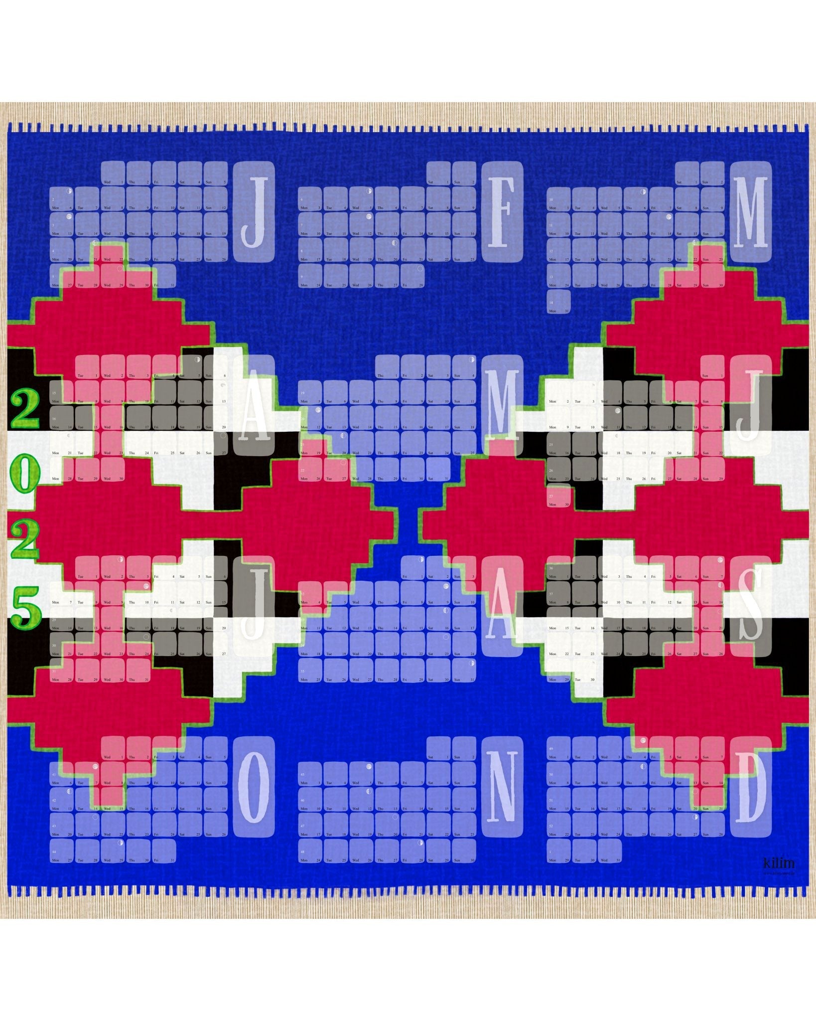 Kraftur, styrkur, hrein nærvera. Mexíkóski veggdagatalið heillar með segulmynstri sínu í skautandi litum. Astekar demantar í bleiku yfir skákborðsmynstri á djúpbláum bakgrunni með neongrænum leturgerðum og ofnum hvítum jaðri.