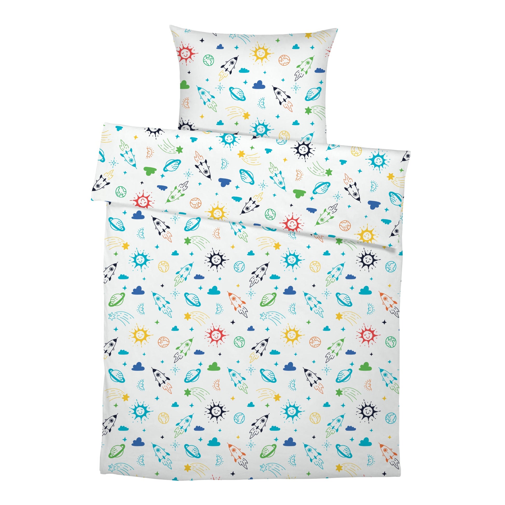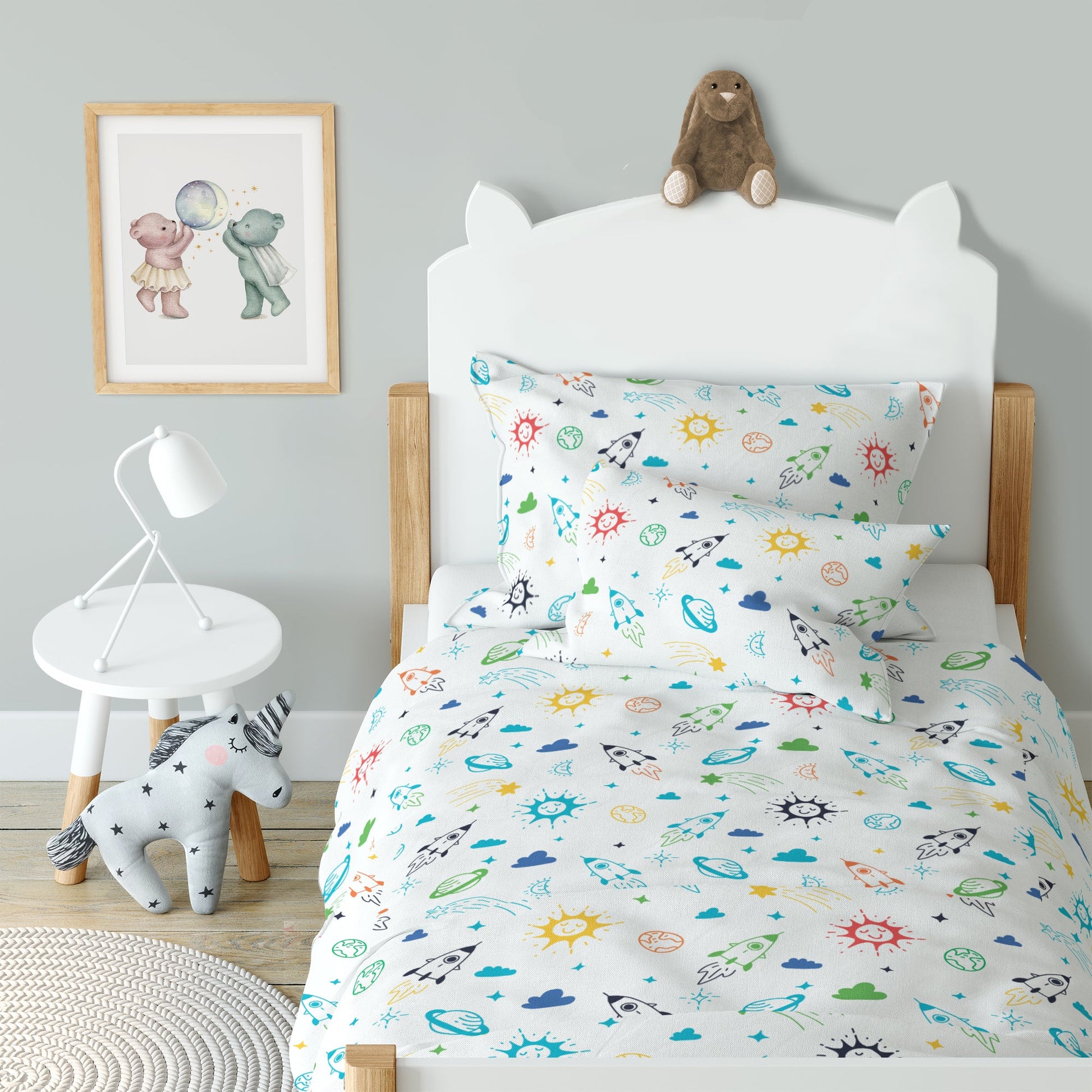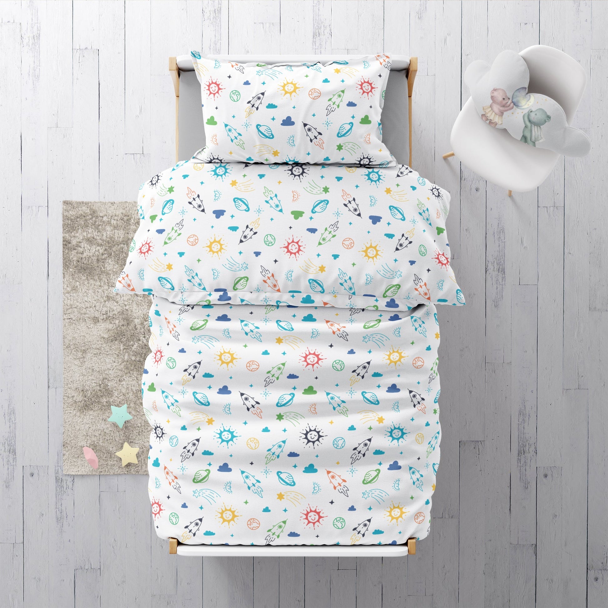 Óendanleg sjóndeildarhringur í barnaherberginu: „Geim“-hönnunin opnar dyrnar að stjörnunum beint í svefnherbergi litla geimfarans þíns. Umkringd glitrandi stjörnum, fljúgandi eldflaugum og fjarlægum reikistjörnum verður hver nótt spennandi ferðalag um alheiminn. „Geim“-rúmfötin eru fullkomin gjöf fyrir litla geimfara og munu bera drauma barnsins þíns til stjarnanna.