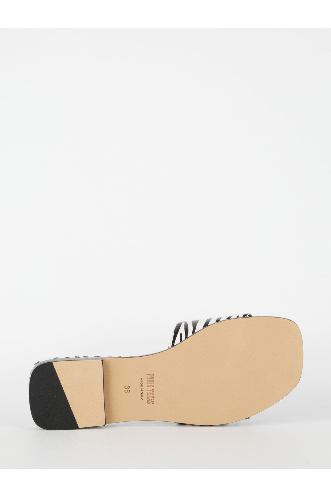 Flat sandals in black and white zebra-print leather. They feature upper brand, round and open toe and Paris Texas logo engraved on the insole.