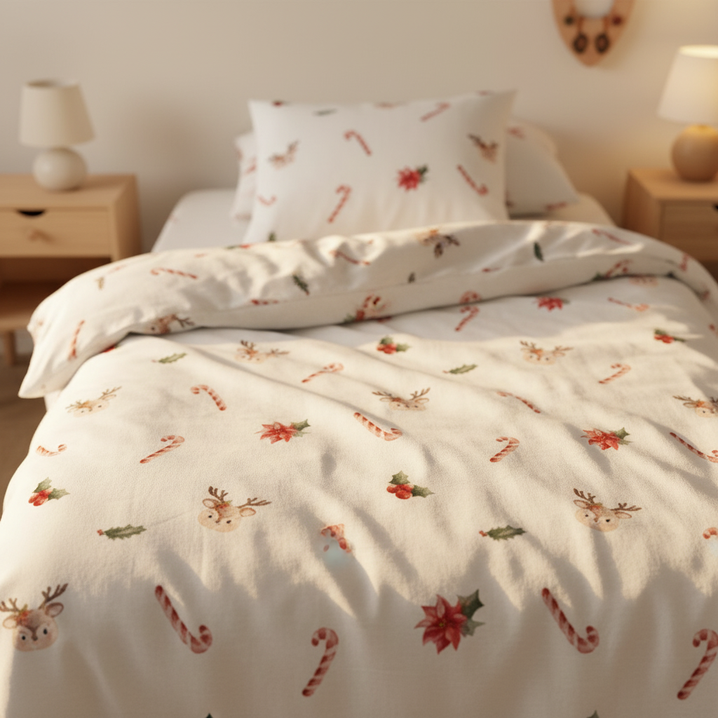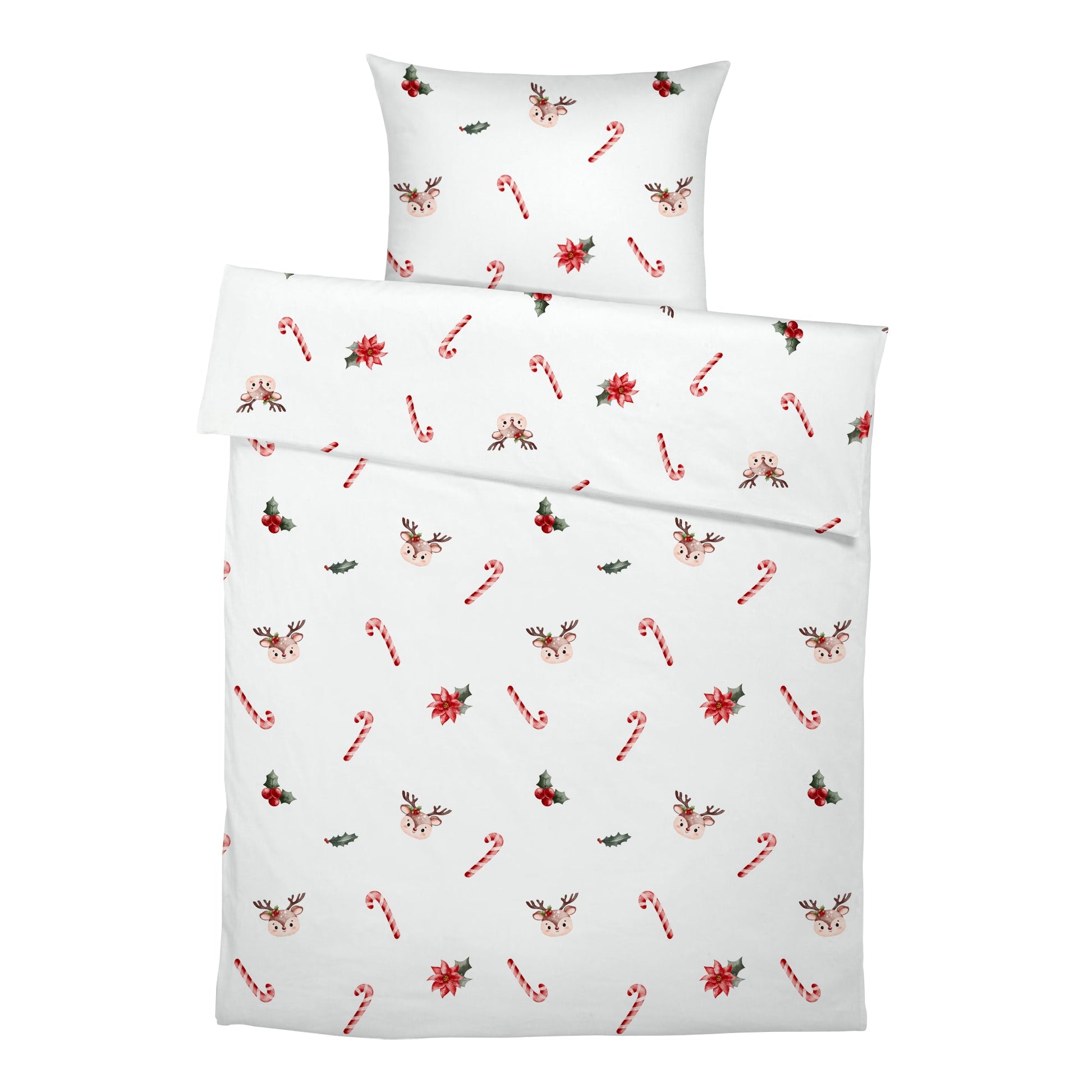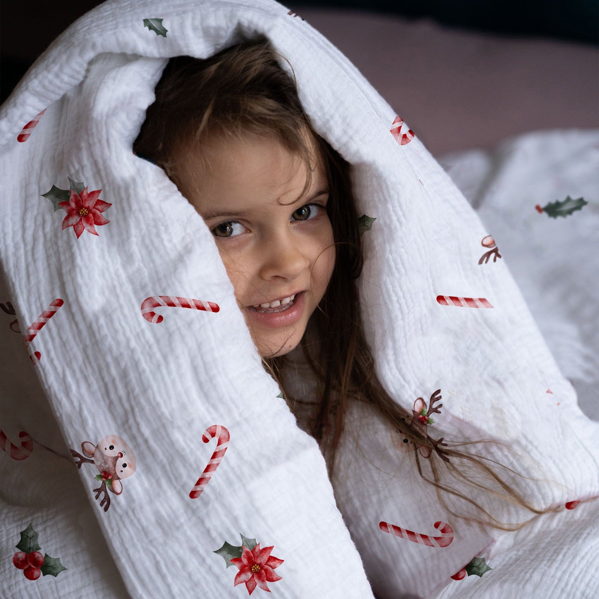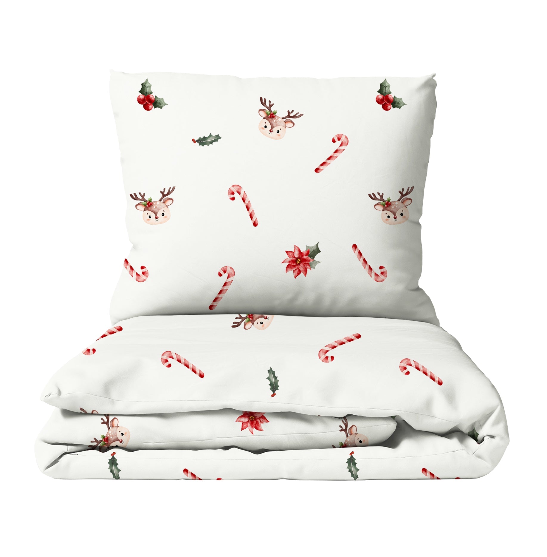 Jóladraumar: Leyfðu barninu þínu að sökkva sér niður í skemmtilegt vetrarundurland þar sem litlir dádýr leika sér kátlega meðal sætra sælgætisstöngla. Þessi blíða blanda af ævintýralegri náttúru og hátíðlegum töfrum færir heillandi andrúmsloft í barnarúmið. Þessi rúmföt eru úr OEKO-TEX 100 vottuðu bómull og bjóða barninu þínu mjúkt og notalegt svefnumhverfi, fullkomið fyrir sæta drauma. Með mynstri sælgætisstöngla og dádýra ertu ekki bara að gefa barninu notalegt rúmföt, heldur einnig heim fullan af töfrum vetrarævintýrum. Fullkomið fyrir litla jólaunnendur og dýraunnendur!